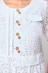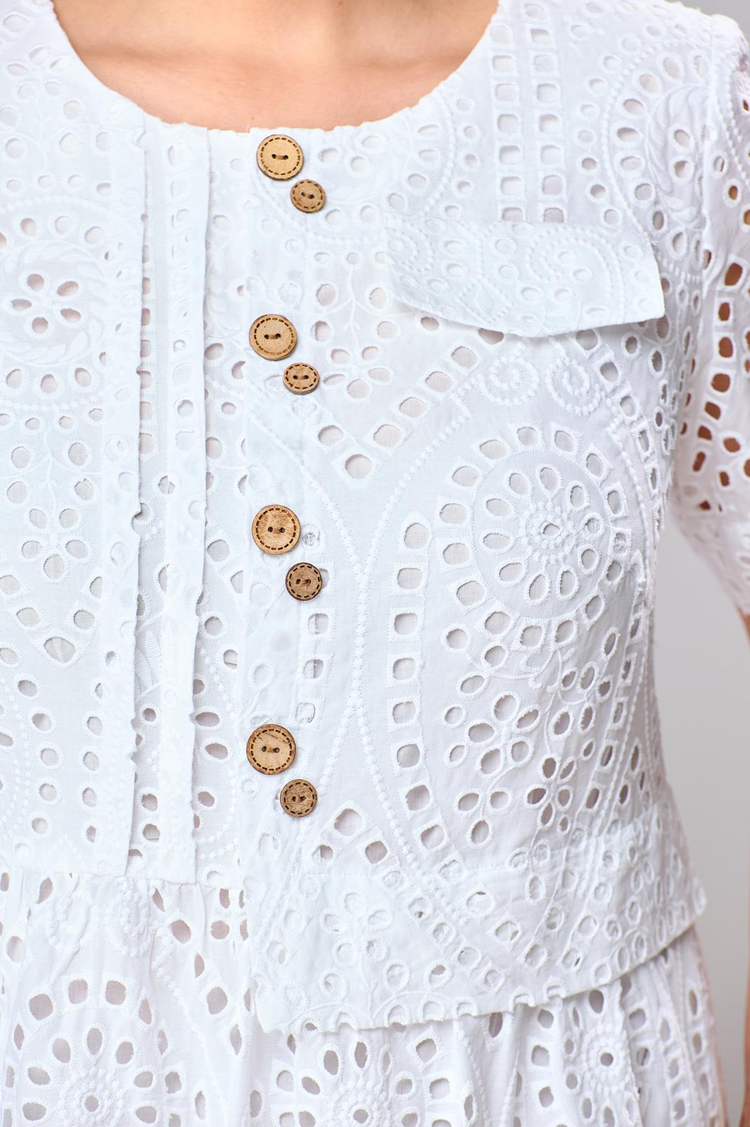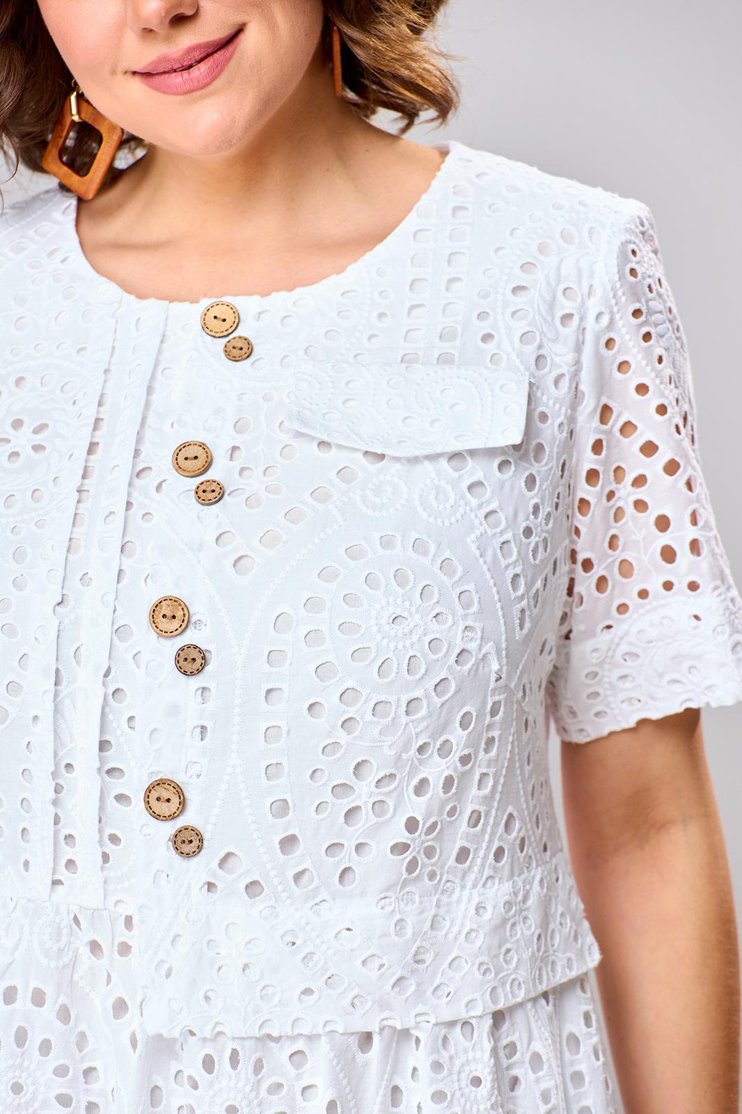 Платье женское отрезное по линии талии, длиной ниже колена, предназначено для повседневной носки. Верхняя часть переда с двумя нагрудными вытачками, с двумя односторонними зафиксированными складками справа, со средним швом с односторонней зафиксированной складкой, с цельнокроеной отлетной баской, с фигурным настрочным клапаном слева. Складка среднего шва декорируется 4-мя большими и 4-мя маленькими декоративными пуговицами. Нижняя часть переда с легкой сборкой по верхнему срезу. Верхняя часть спинки с двумя талиевыми вытачками, верхний срез нижней части спинки с легкой сборкой, расположенной между вытачками верхней части. В боковых швах платья обработаны карманы. Горловина круглая, обтачная, без воротника. Рукав втачной, короткий, одно шовный. Платье на хлопковой подкладке. Платье с плечевыми накладками. Длина спинки 115 см. Длина рукава 28 см