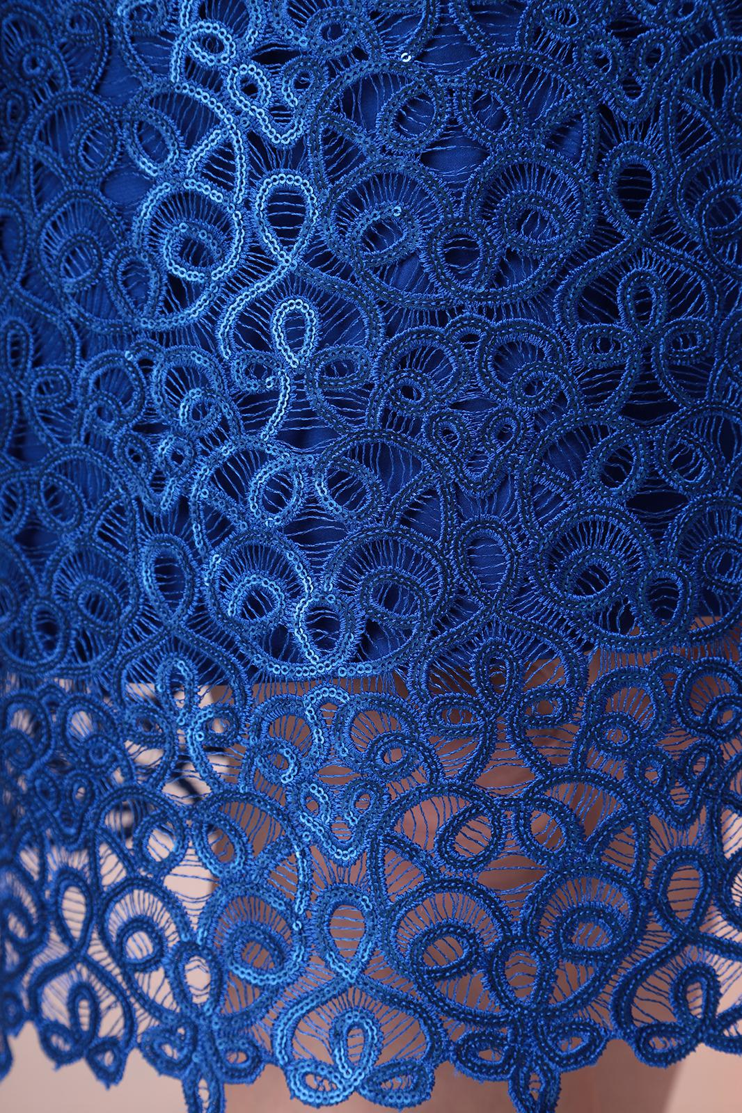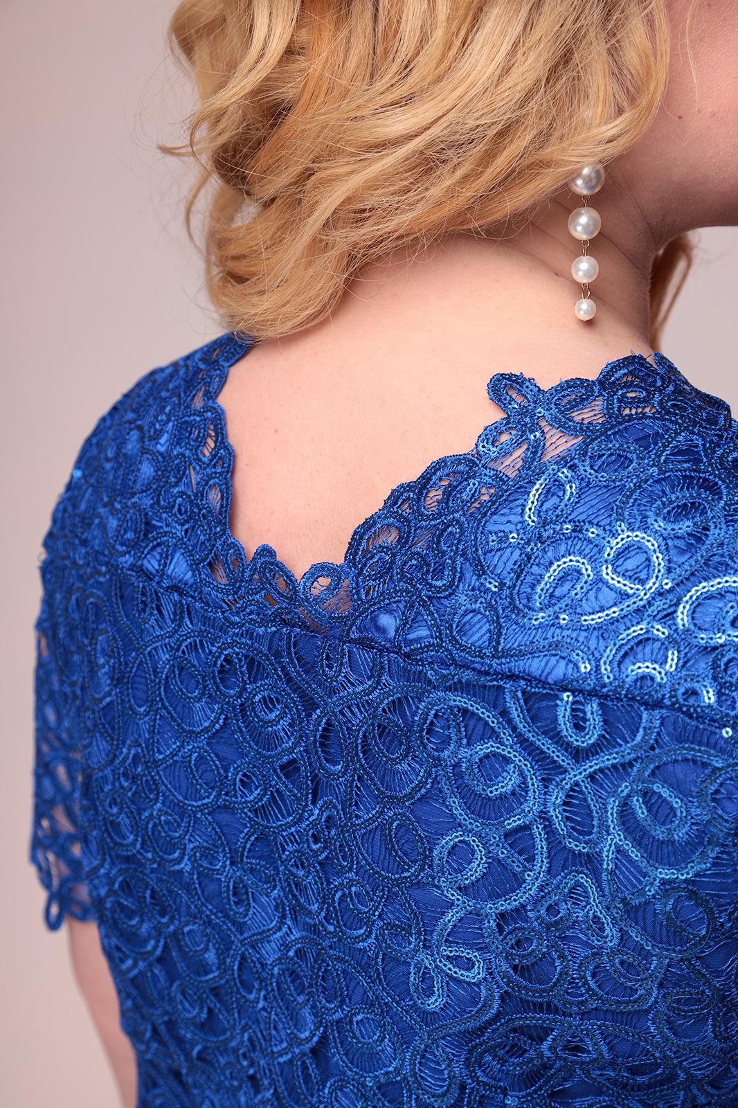 Платье женское относится к нарядной торжественной одежде. Платье полуприлегающего силуэта, слегка расширено к низу, длиной за колено. Перед с отрезной кокеткой и двумя нагрудными вытачками. Спинка с отрезной кокеткой и двумя талиевыми вытачками Горловина с V-образным фигурным вырезом. Рукав втачной короткий, одно шовный. Платье на подкладке Застежка на потайную тесьму молнию в левом боковом шве платья. Длина платья от плеча 107см. Длина рукава по краю фист 26см.