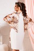 Платье женское относится к нарядной торжественной одежде. Платье полуприлегающего силуэта, с отлетной накидкой длиной за колено. Перед с двумя нагрудными вытачками, с двумя талиевыми вытачками. Спинка с двумя талиевыми вытачками и средним швом, заканчивающимся шлицей. Застежка на потайную тесьму-молнию в среднем шве спинки. Горловина круглая, обтачная, без воротника, по горловине закреплена накидка. Слева на уровне линии талии отделочным хлястиком, декорированным тесьмой накидка закрепляется на платье, нижняя часть накидки закреплена в левом боковом шве. Накидка с фигурным низом. Платье без рукавов. Длина спинки 103 см. Длина накидки от горловины 38 см