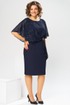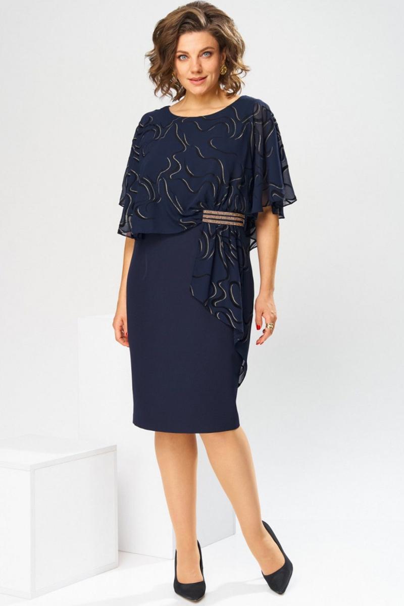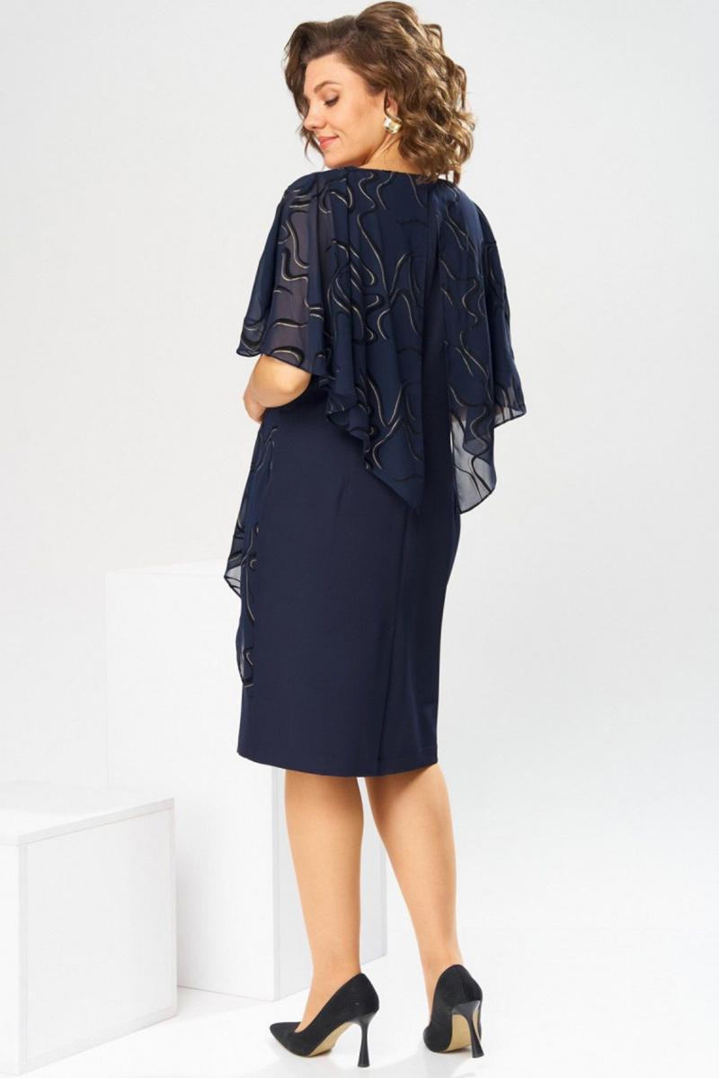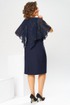 Платье женское относится к нарядной торжественной одежде. Платье полуприлегающего силуэта, с отлетной накидкой длиной за колено. Перед с двумя нагрудными вытачками, с двумя талиевыми вытачками. Спинка с двумя талиевыми вытачками и средним швом, заканчивающимся шлицей. Застежка на потайную тесьму-молнию в среднем шве спинки. Горловина круглая, обтачная, без воротника, по горловине закреплена накидка. Слева на уровне линии талии отделочным хлястиком, декорированным тесьмой накидка закрепляется на платье, нижняя часть накидки закреплена в левом боковом шве. Накидка с фигурным низом. Платье без рукавов. Длина спинки 103 см. Длина накидки от горловины 38 см