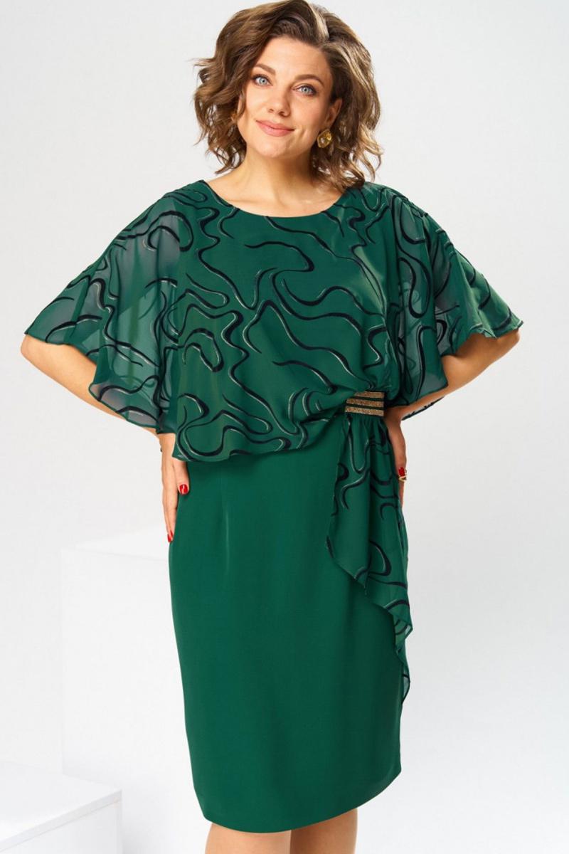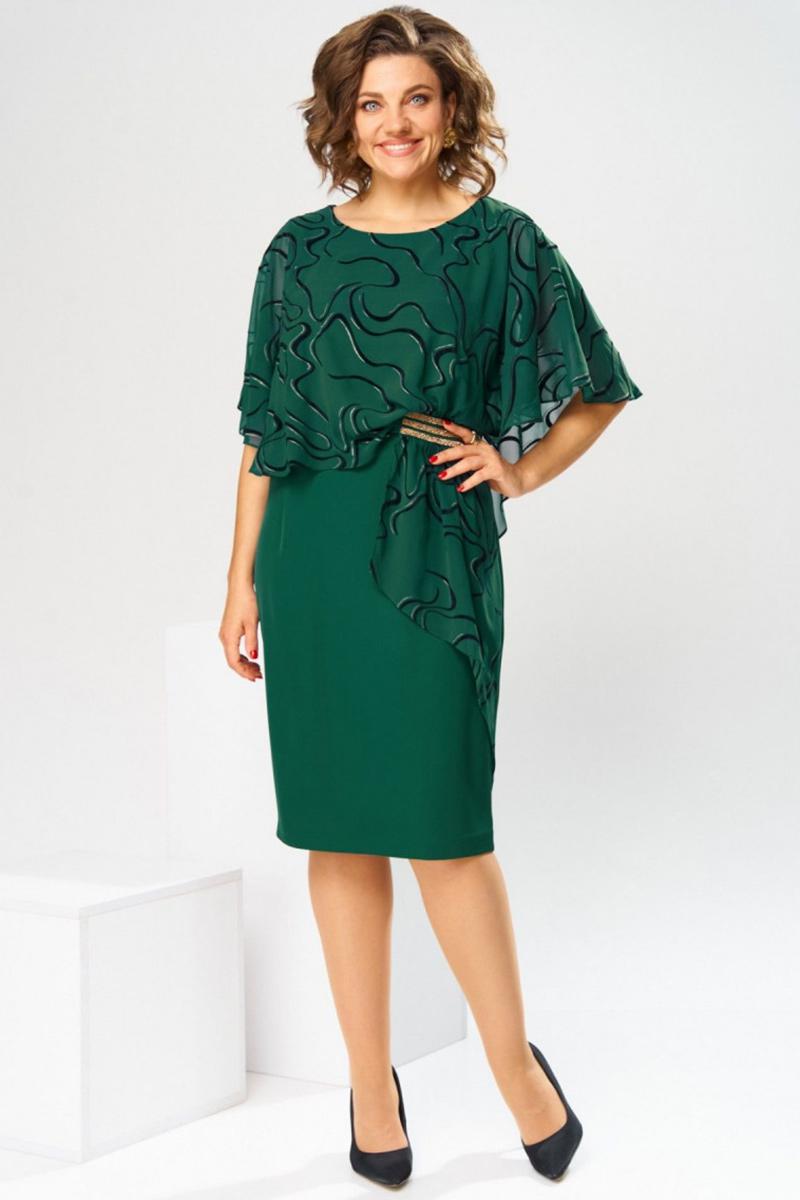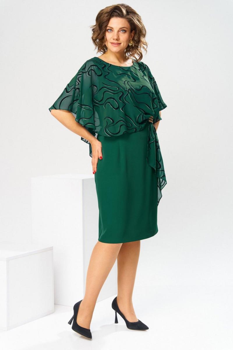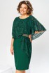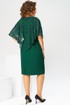 Платье женское относится к нарядной торжественной одежде. Платье полуприлегающего силуэта, с отлетной накидкой длиной за колено. Перед с двумя нагрудными вытачками, с двумя талиевыми вытачками. Спинка с двумя талиевыми вытачками и средним швом, заканчивающимся шлицей. Застежка на потайную тесьму-молнию в среднем шве спинки. Горловина круглая, обтачная, без воротника, по горловине закреплена накидка. Слева на уровне линии талии отделочным хлястиком, декорированным тесьмой накидка закрепляется на платье, нижняя часть накидки закреплена в левом боковом шве. Накидка с фигурным низом. Платье без рукавов. Длина спинки 103 см. Длина накидки от горловины 38 см