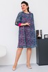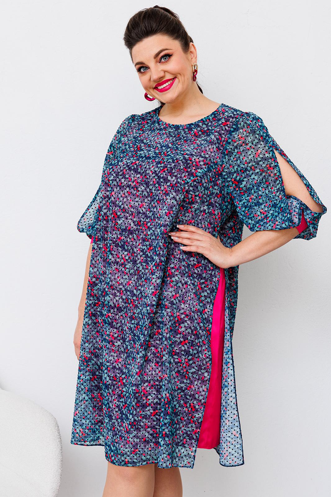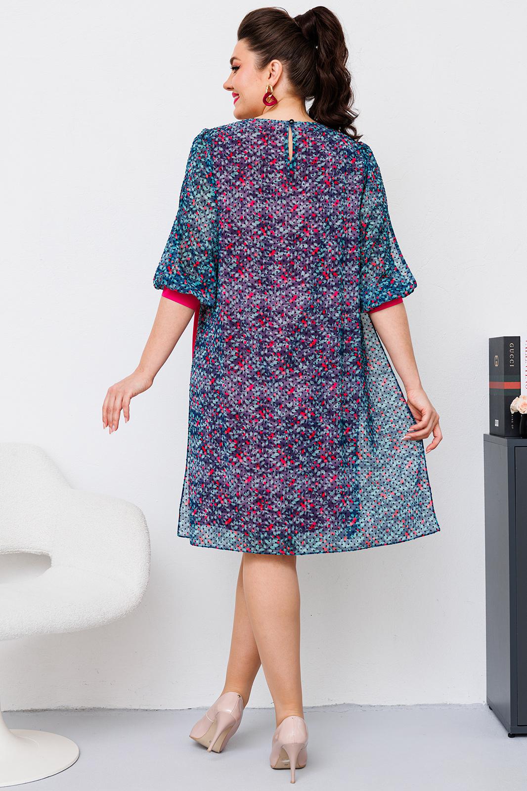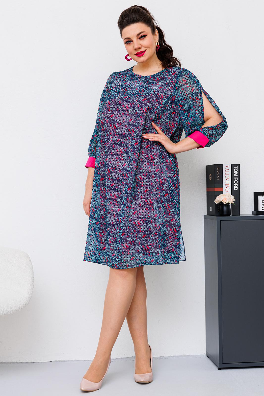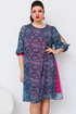 Платье женское, относится к коктейльным платьям. Платье женское, А-силуэта, длиной за колено. Перед с 2-мя нагрудными вытачками, выходящими из проймы. Спинка вверху по горловине с обтачным разрезом, фиксирующимся на 1-ну навесную петлю и 1-ну пришивную пуговицу. Горловина круглая, обтачная, без воротника. Боковые швы с очень высокими разрезами. Рукав втачной, двух шовный, длиной 7/8, с притачной манжетой из отделочной ткани, частично собранной на эластичную тесьму; верхний шов с высоким разрезом. По окату рукава и низу рукава лёгкая сборка. Платье на подкладке из текстильной отделочной ткани. Платье без плечевых накладок. Длина спинки платья 100 см, Длина рукава 50 см.