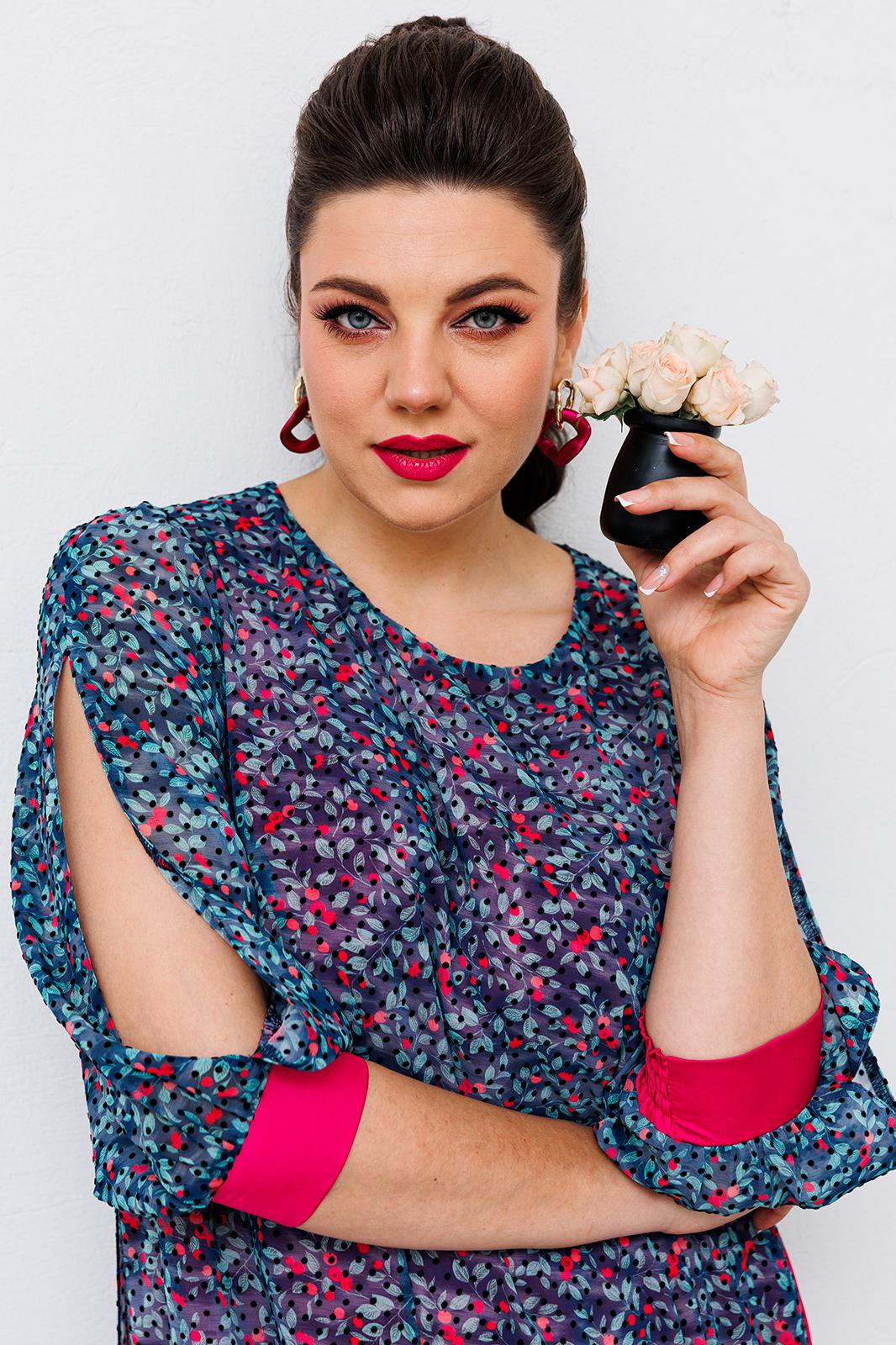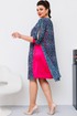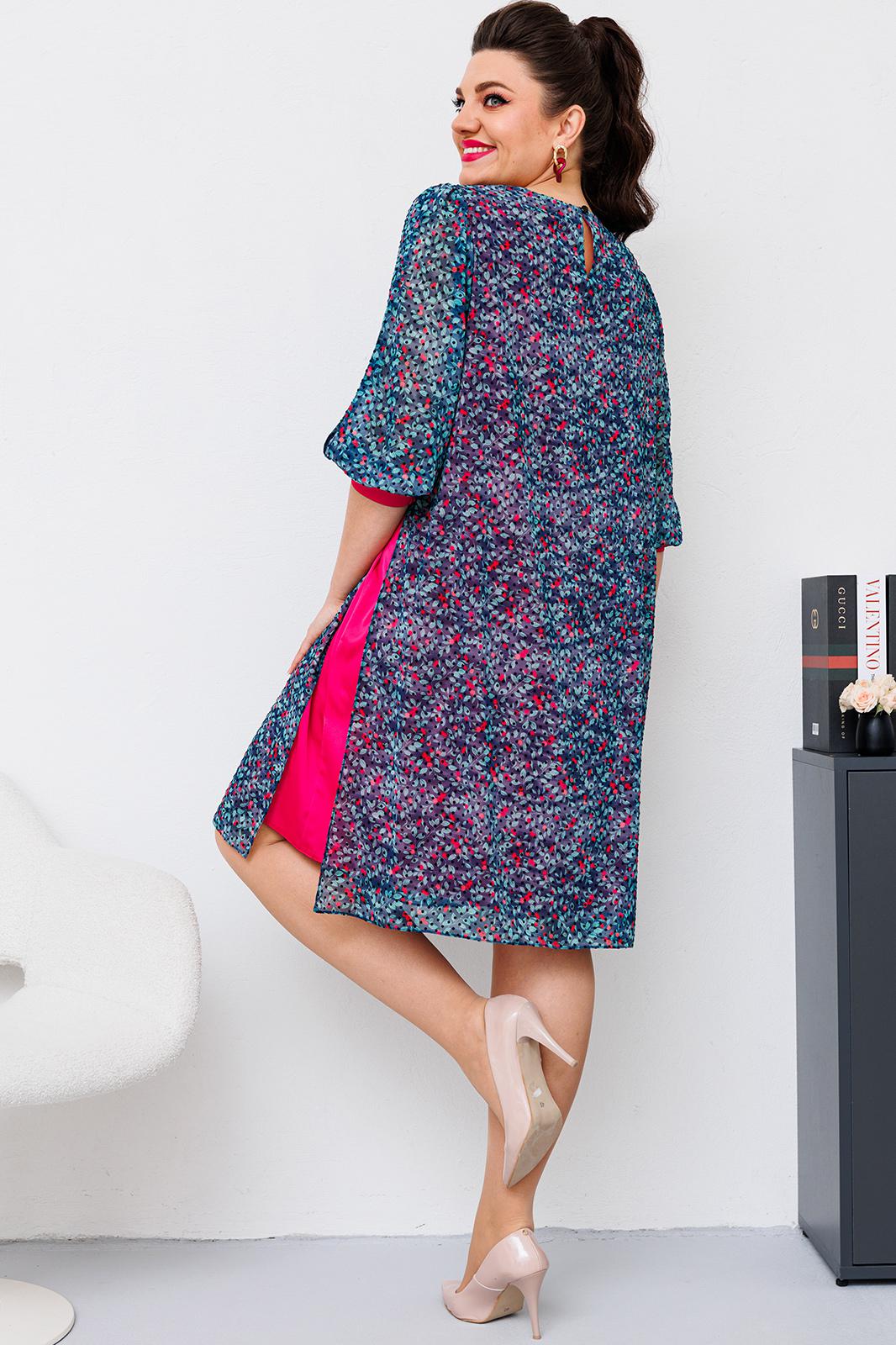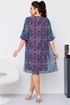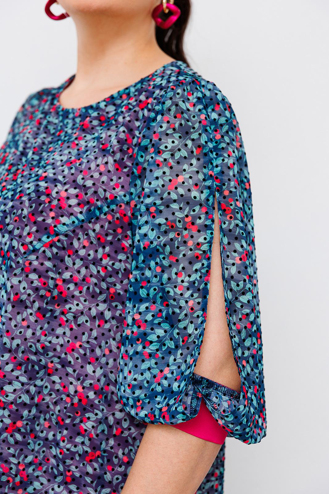 Платье женское, относится к коктейльным платьям. Платье женское, А-силуэта, длиной за колено. Перед с 2-мя нагрудными вытачками, выходящими из проймы. Спинка вверху по горловине с обтачным разрезом, фиксирующимся на 1-ну навесную петлю и 1-ну пришивную пуговицу. Горловина круглая, обтачная, без воротника. Боковые швы с очень высокими разрезами. Рукав втачной, двух шовный, длиной 7/8, с притачной манжетой из отделочной ткани, частично собранной на эластичную тесьму; верхний шов с высоким разрезом. По окату рукава и низу рукава лёгкая сборка. Платье на подкладке из текстильной отделочной ткани. Платье без плечевых накладок. Длина спинки платья 100 см, Длина рукава 50 см.