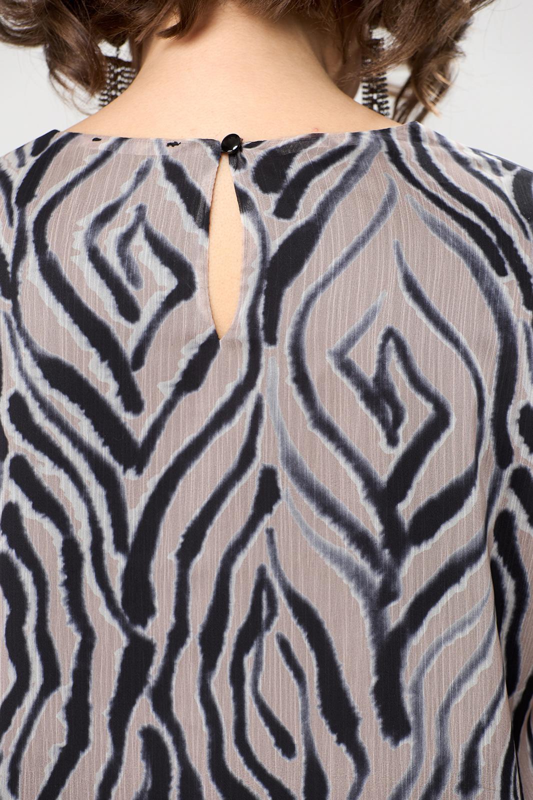 Платье женское, относится к коктейльным платьям. Платье женское, А-силуэта, длиной за колено. Перед с 2-мя нагрудными вытачками, выходящими из проймы. Спинка вверху по горловине с обтачным разрезом, фиксирующимся на 1-ну навесную петлю и 1-ну пришивную пуговицу. Горловина круглая, обтачная, без воротника. Боковые швы с очень высокими разрезами. Рукав втачной, двух шовный, длиной 7/8, с притачной манжетой из отделочной ткани, частично собранной на эластичную тесьму; верхний шов с высоким разрезом. По окату рукава и низу рукава лёгкая сборка. Платье на подкладке из текстильной отделочной ткани. Платье без плечевых накладок. Длина спинки платья 100 см, Длина рукава 50 см.