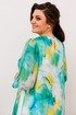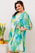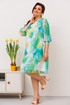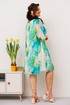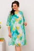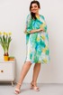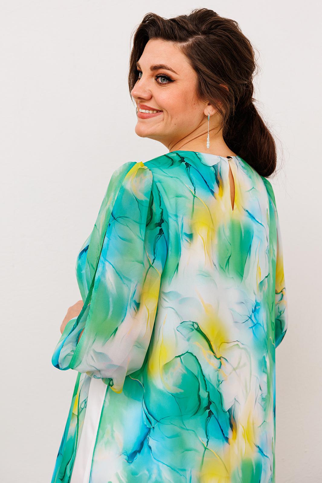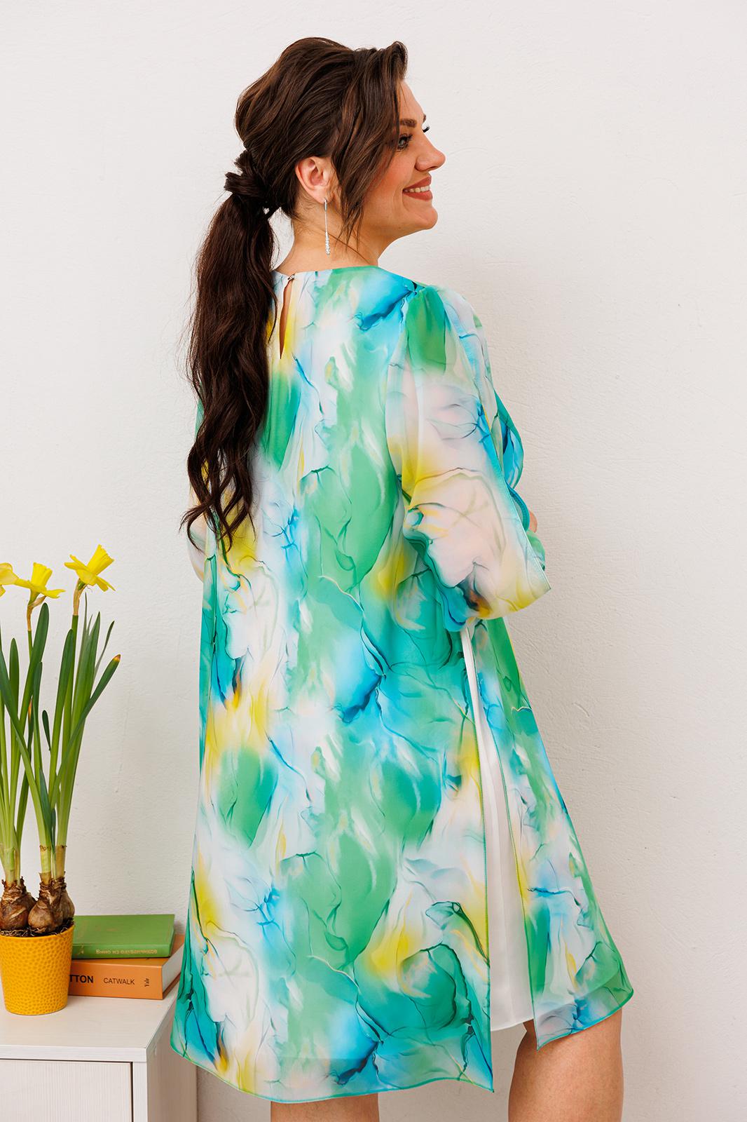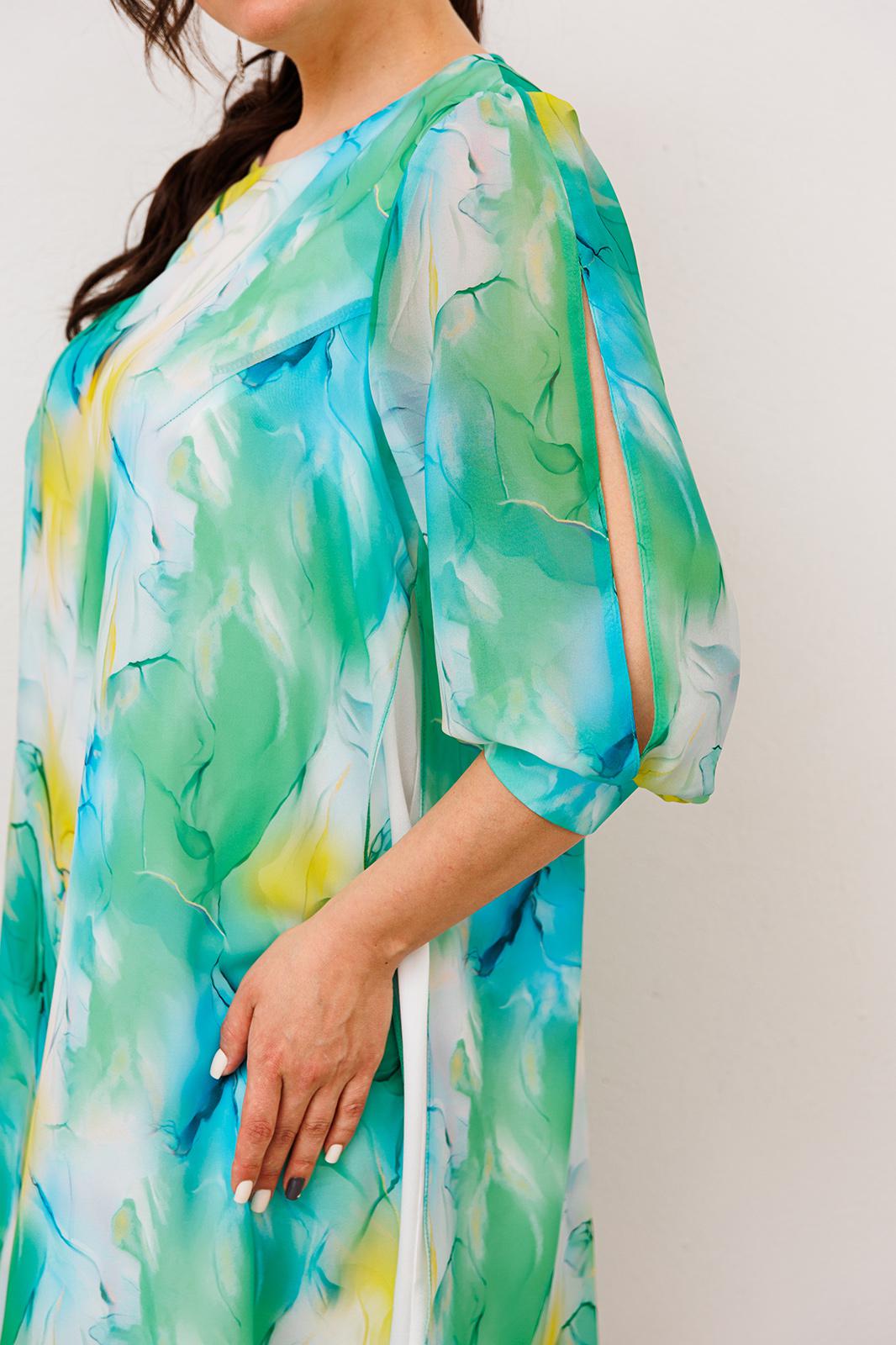 Платье женское, относится к коктейльным платьям. Платье женское, А-силуэта, длиной за колено. Перед с 2-мя нагрудными вытачками, выходящими из проймы. Спинка вверху по горловине с обтачным разрезом, фиксирующимся на 1-ну навесную петлю и 1-ну пришивную пуговицу. Горловина круглая, обтачная, без воротника. Боковые швы с очень высокими разрезами. Рукав втачной, двух шовный, длиной 7/8, с притачной манжетой из отделочной ткани, частично собранной на эластичную тесьму; верхний шов с высоким разрезом. По окату рукава и низу рукава лёгкая сборка. Платье на подкладке из текстильной отделочной ткани. Платье без плечевых накладок. Длина спинки платья 100 см, Длина рукава 50 см.