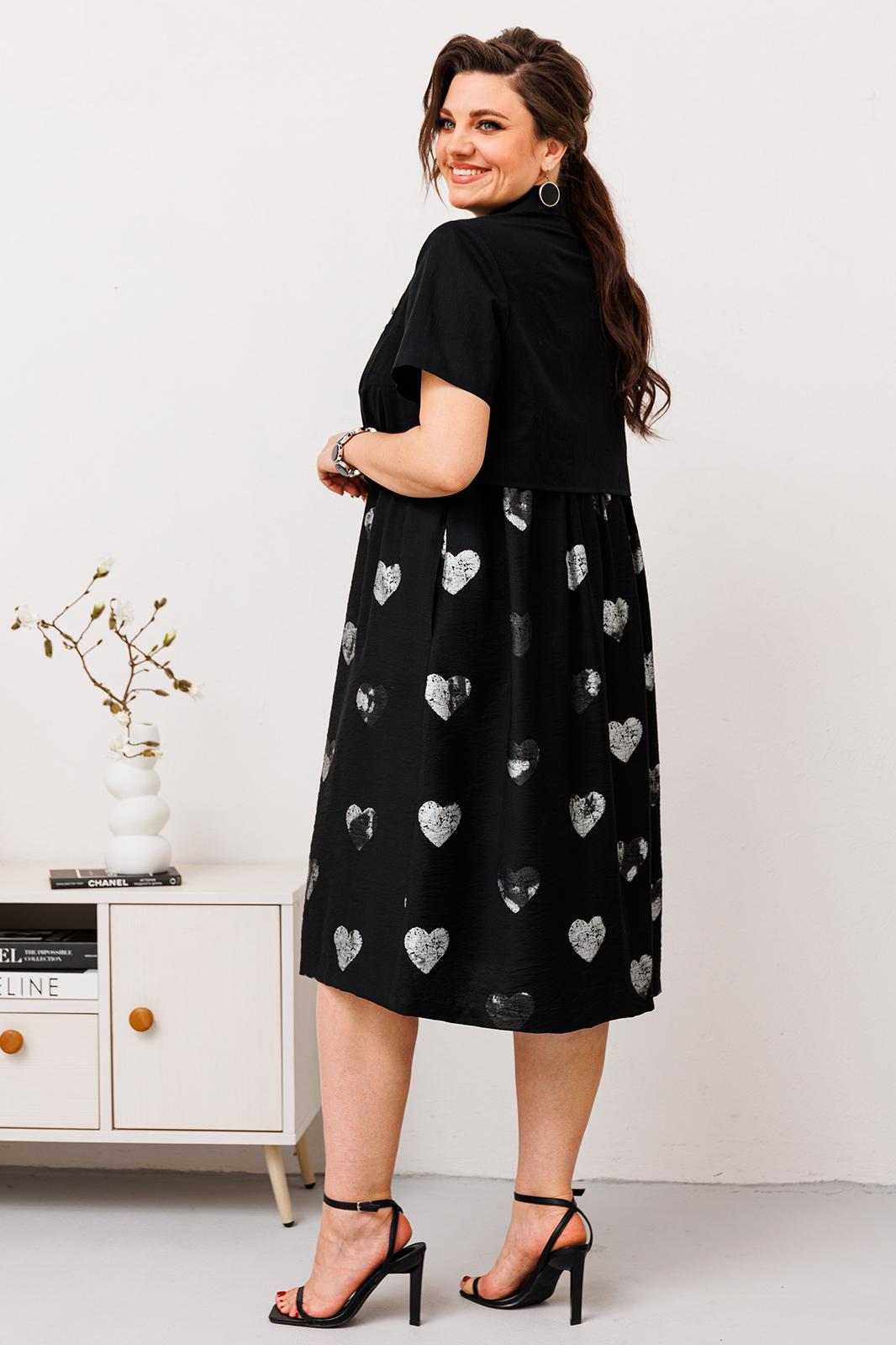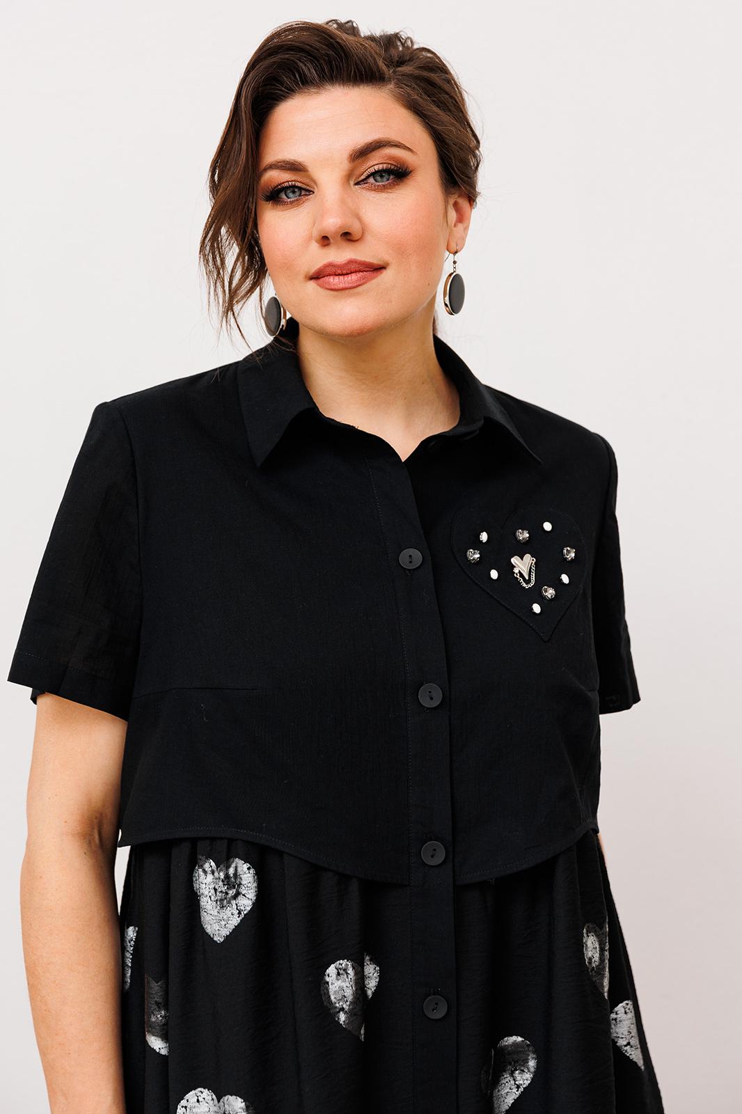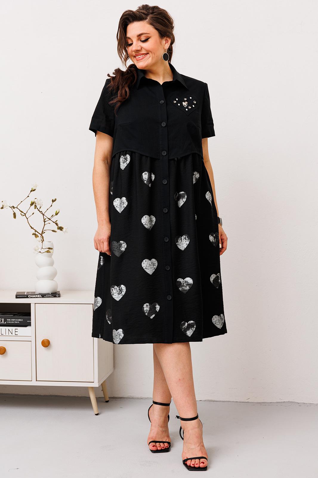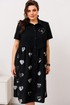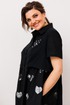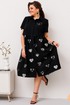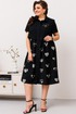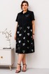 Платье предназначено для повседневной носки. Платье женское, отрезное выше линии талии расширенное к низу длиной ниже колена на 10 см. Верхняя часть платья двойная с отлетной верхней частью. Перед с 2-мя нагрудными вытачками, с 2-мя притачными центральными вертикальными планками, нижняя часть переда со сборкой по верхнему срезу. Верхняя часть спинки 2-ная цельнокроеная, нижняя часть со сборкой по верхнему срезу. В боковых швах обработаны карманы. Горловина круглая с втачным воротником рубашечного типа с отрезной стойкой. Застёжка центральная на 10-ть вертикальных обмётанных петельна 10-ть пришивных пуговиц. Рукав втачной короткий одно шовный. Платье с плечевыми накладками. Перед платья декорируются надстрочной аппликацией на левой части отлётного переда. Длина спинки 112 см, длина рукава 22,5 см.