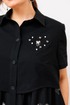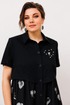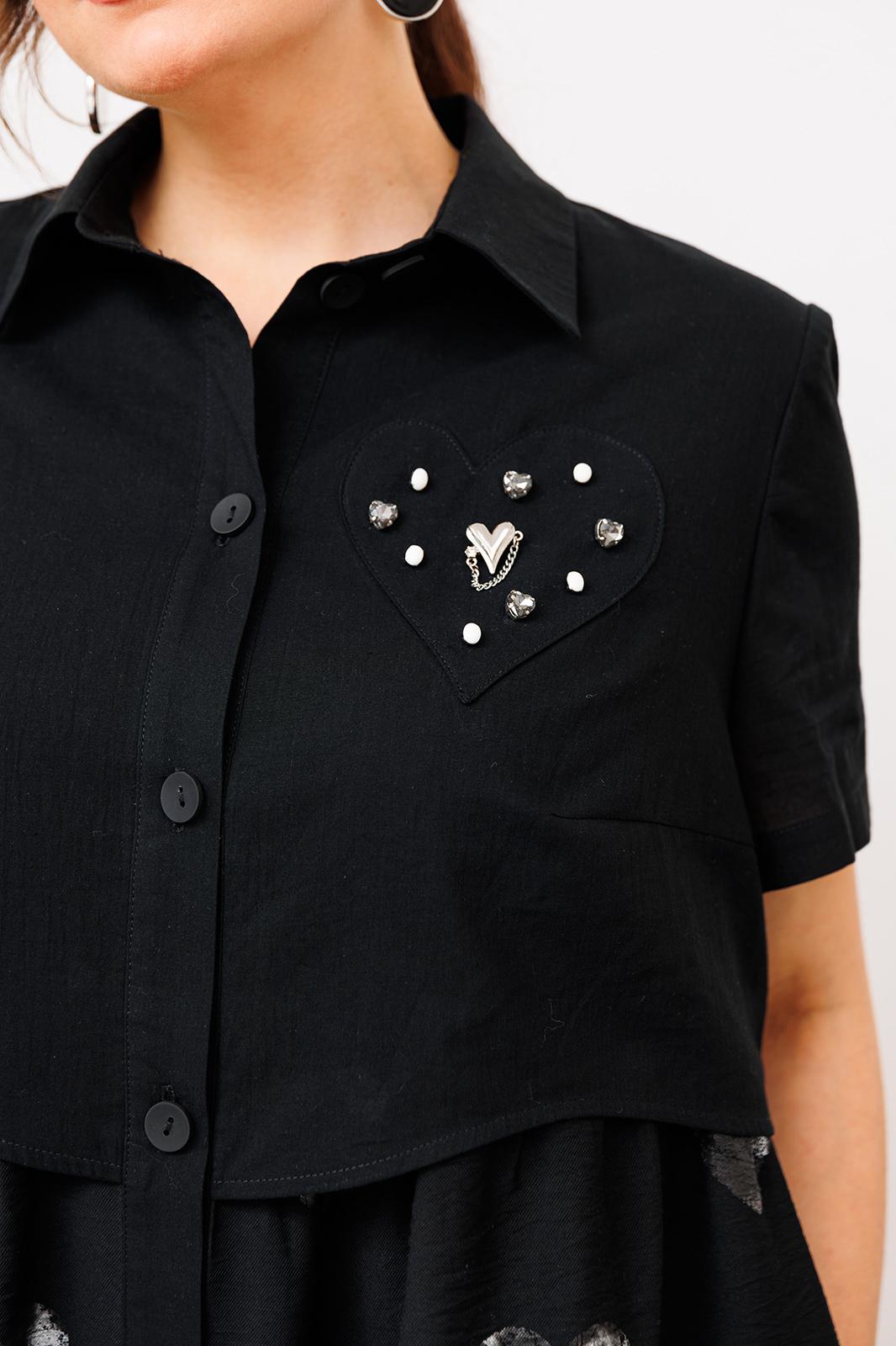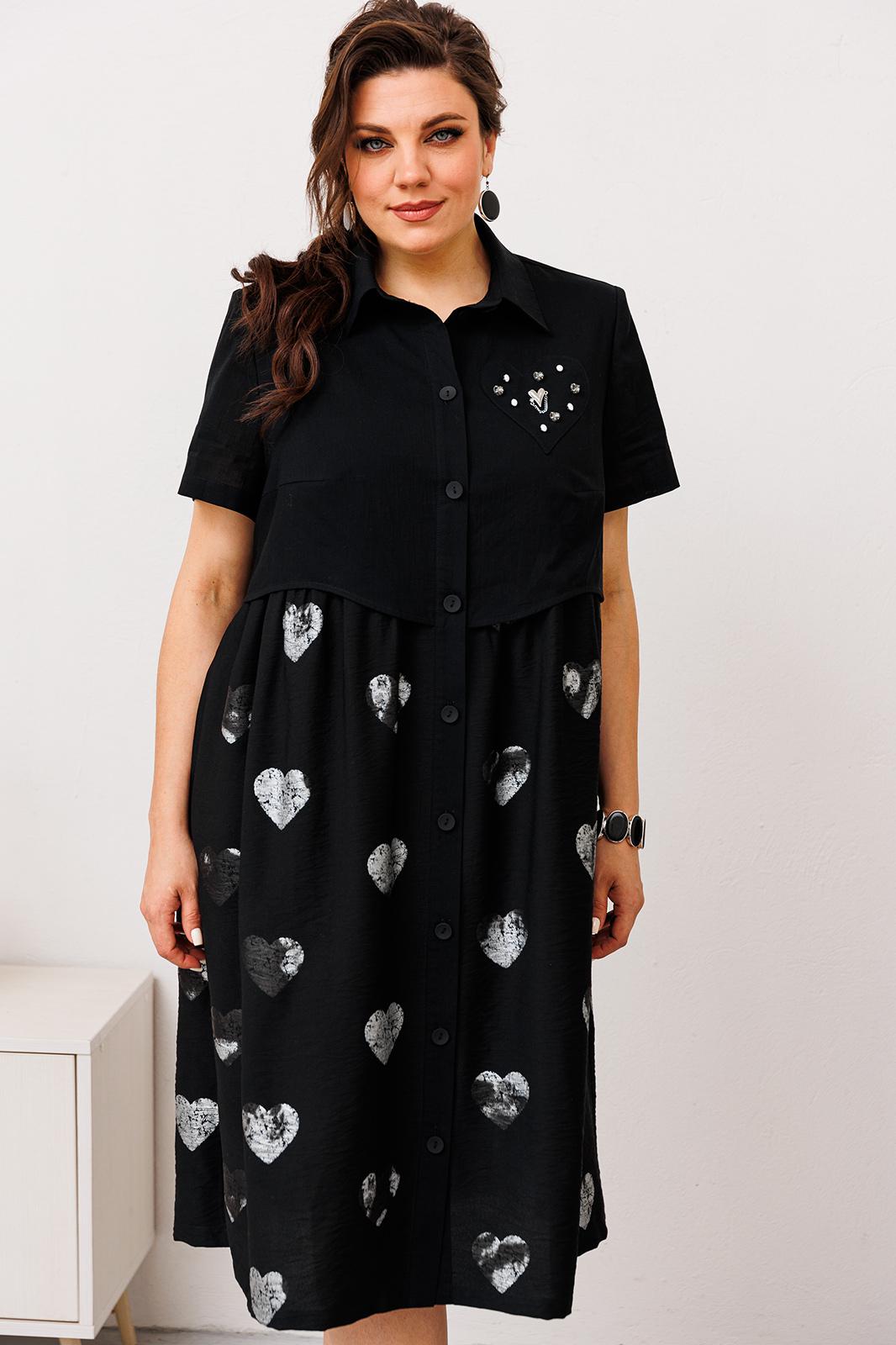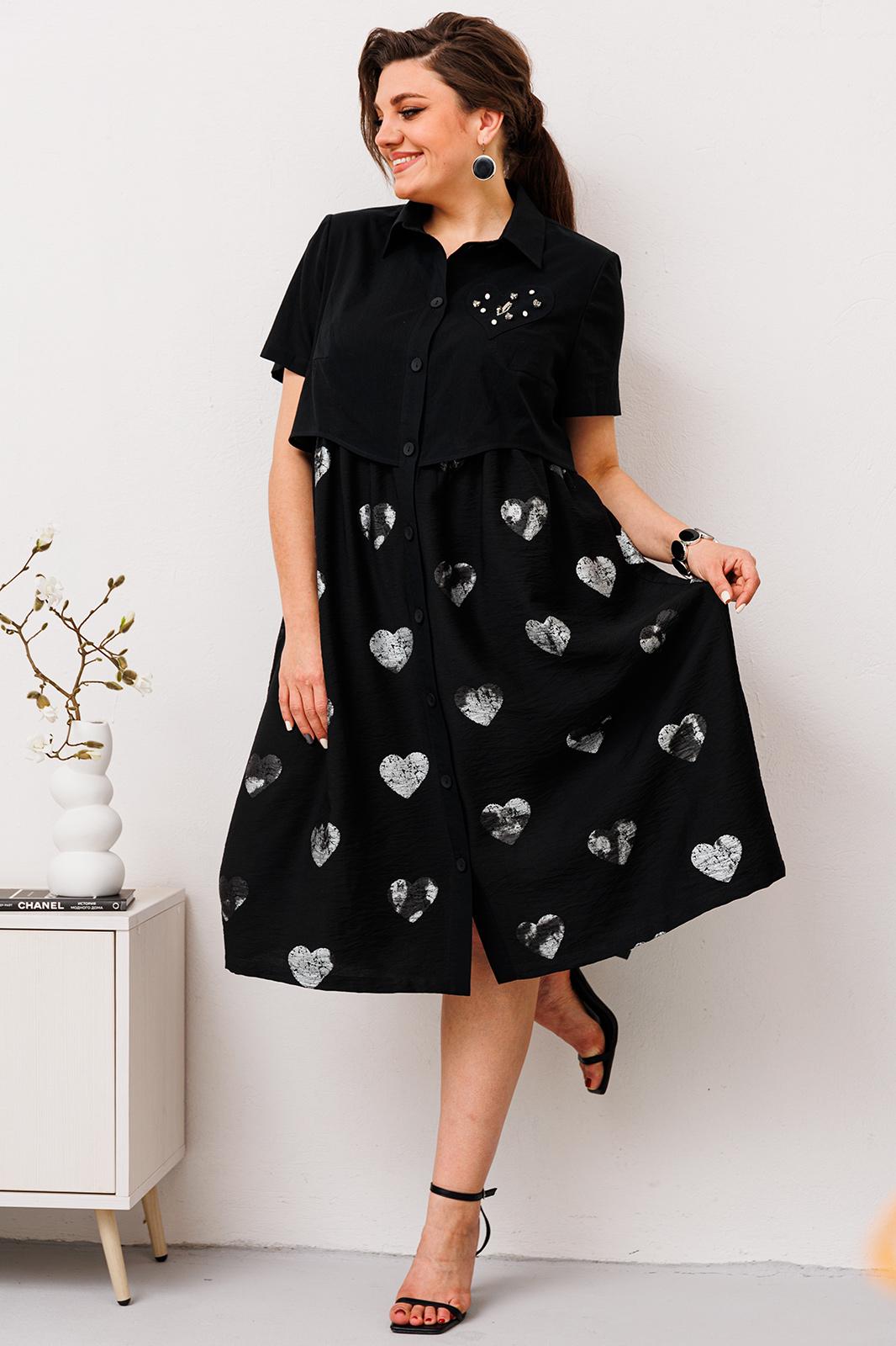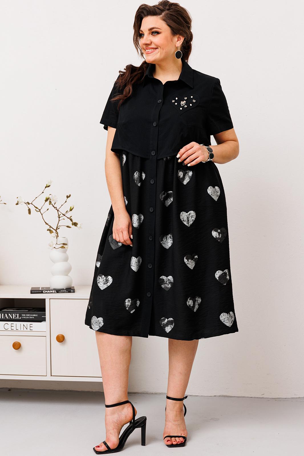 Платье предназначено для повседневной носки. Платье женское, отрезное выше линии талии расширенное к низу длиной ниже колена на 10 см. Верхняя часть платья двойная с отлетной верхней частью. Перед с 2-мя нагрудными вытачками, с 2-мя притачными центральными вертикальными планками, нижняя часть переда со сборкой по верхнему срезу. Верхняя часть спинки 2-ная цельнокроеная, нижняя часть со сборкой по верхнему срезу. В боковых швах обработаны карманы. Горловина круглая с втачным воротником рубашечного типа с отрезной стойкой. Застёжка центральная на 10-ть вертикальных обмётанных петельна 10-ть пришивных пуговиц. Рукав втачной короткий одно шовный. Платье с плечевыми накладками. Перед платья декорируются надстрочной аппликацией на левой части отлётного переда. Длина спинки 112 см, длина рукава 22,5 см.