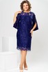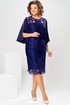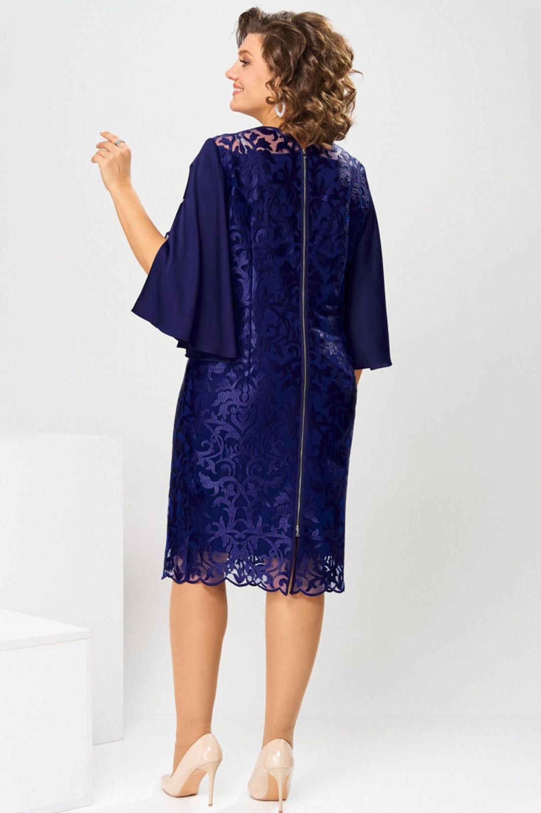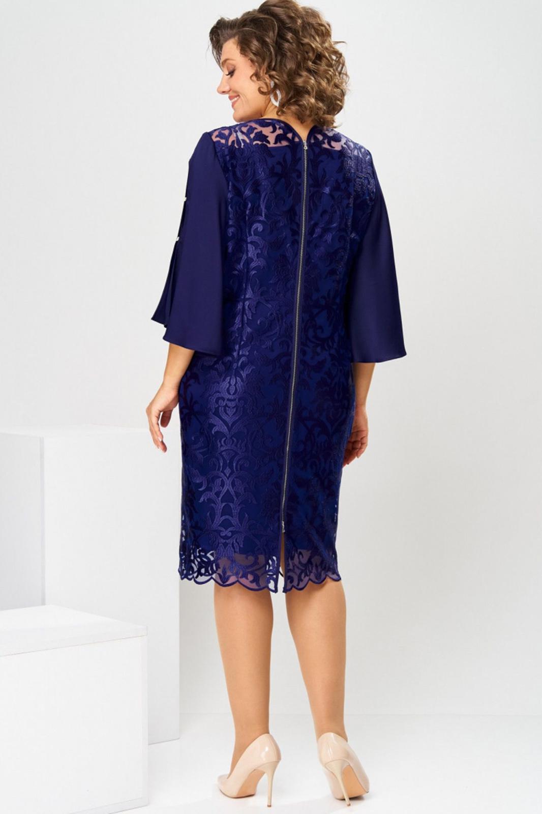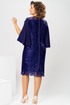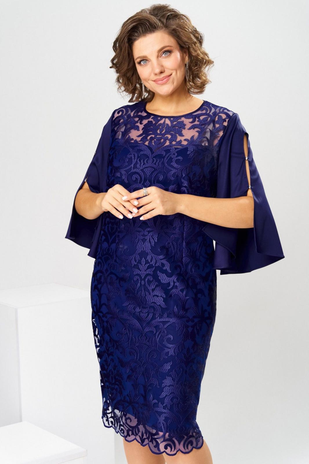 Платье женское, относится к нарядной торжественной одежде. Платье женское, полу прилегающего силуэта, длиной ниже колена. Перед с 2-мя нагрудными и 2-мя плечевыми вытачками. Спинка с 2-мя таллиевыми вытачками и средним швом. Горловина переда круглая, спинка фигурная. Горловина и срезы среднего шва спинки обработаны косой бейкой. Застёжка на разъёмную металлическую молнию в среднем шве спинки. Рукав втачной, 2-х шовный, длиной 3/4 расширенный к низу, верхний шов с разрезом и 2-мя пришивными стразами, скрепляющими разрез. Платье на подкладке. Платье без плечевых накладок. Длина спинки платья 106 см, длина рукава 44 см.