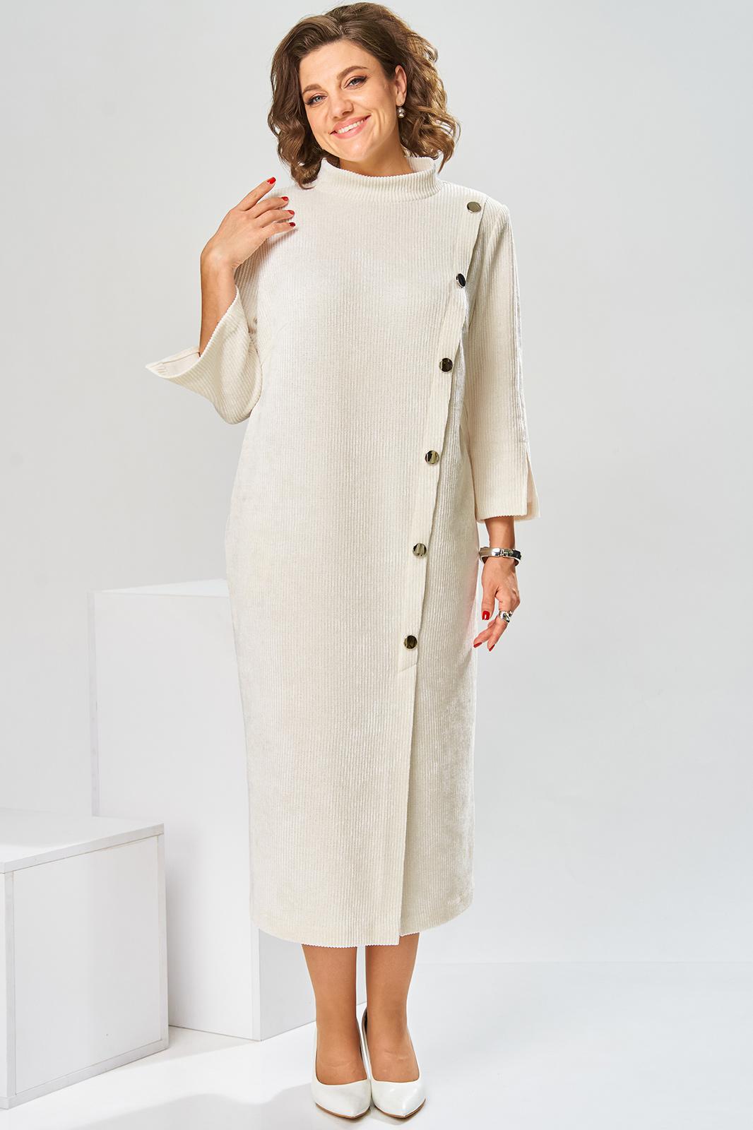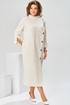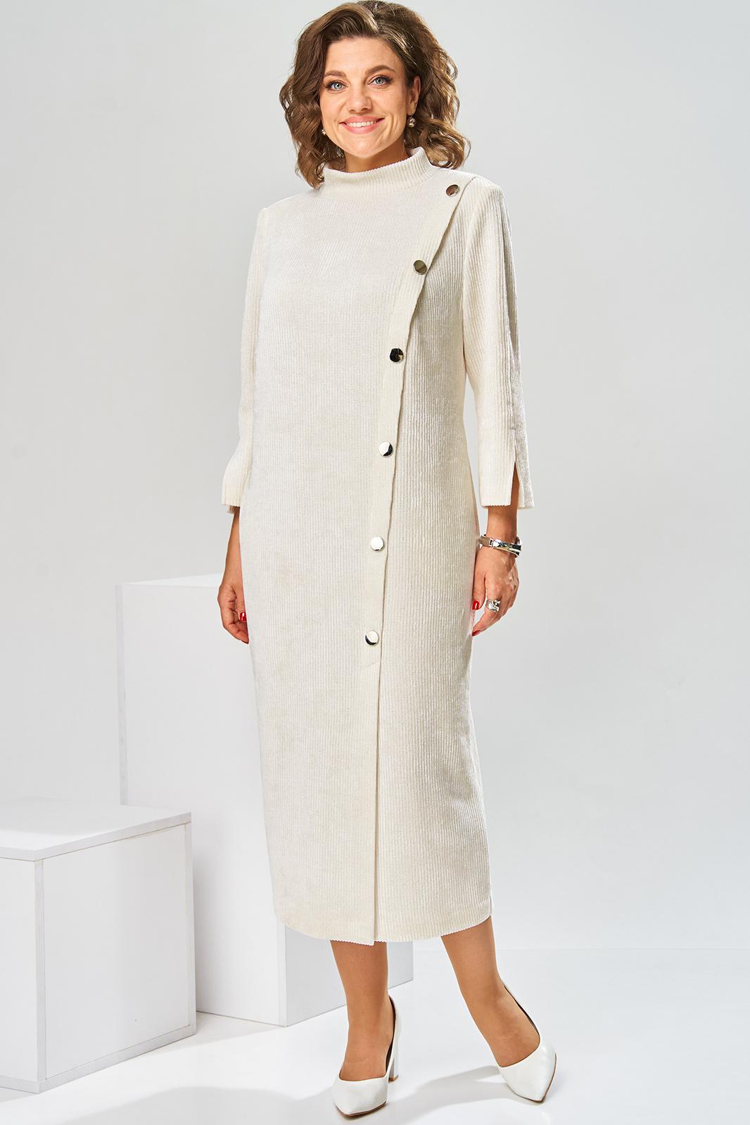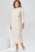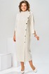Платье женское предназначено для повседневной носки. Платье женское полу прилегающего силуэта, длиной до нижней части икры. Перед с 1-ной нагрудной вытачкой на центральной части, с 1-ним отрезным рельефом слева, выходящим из плечевого шва, шов соединения рельефа с передом декорирован 6-ю пришивными пуговицами и заканчивается шлицей. Спинка с 2-мя таллиевыми вытачками. В боковых швах обработаны карманы. Горловина круглая с втачной стойкой. Рукав втачной, 2-х шовный, длиной 7/8, верхний шов с разрезом. Платье с плечевыми накладками. Длина спинки платья 126 см, длина рукава 51 см.