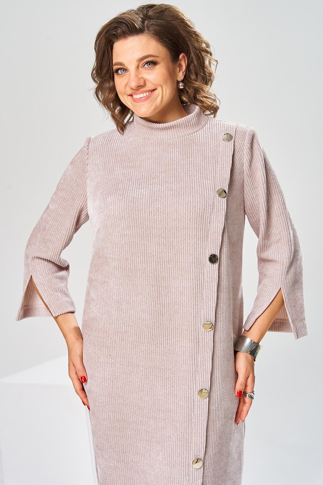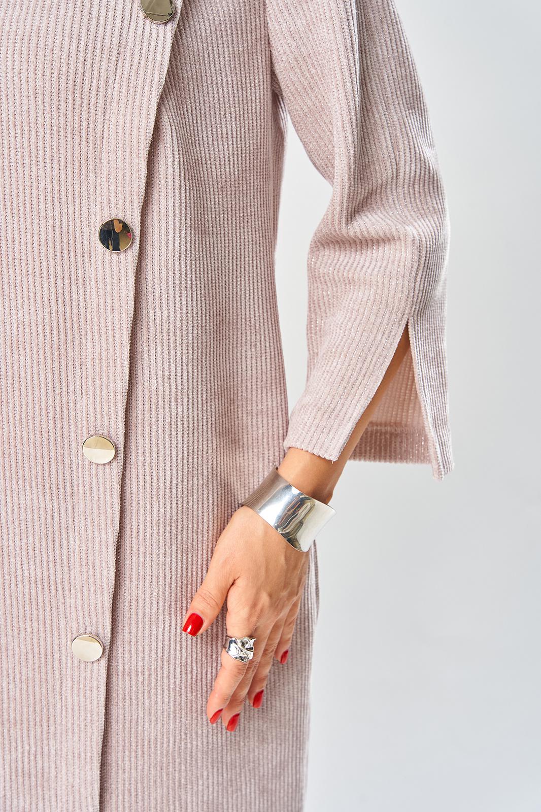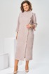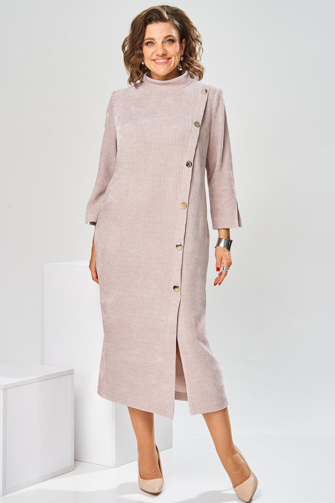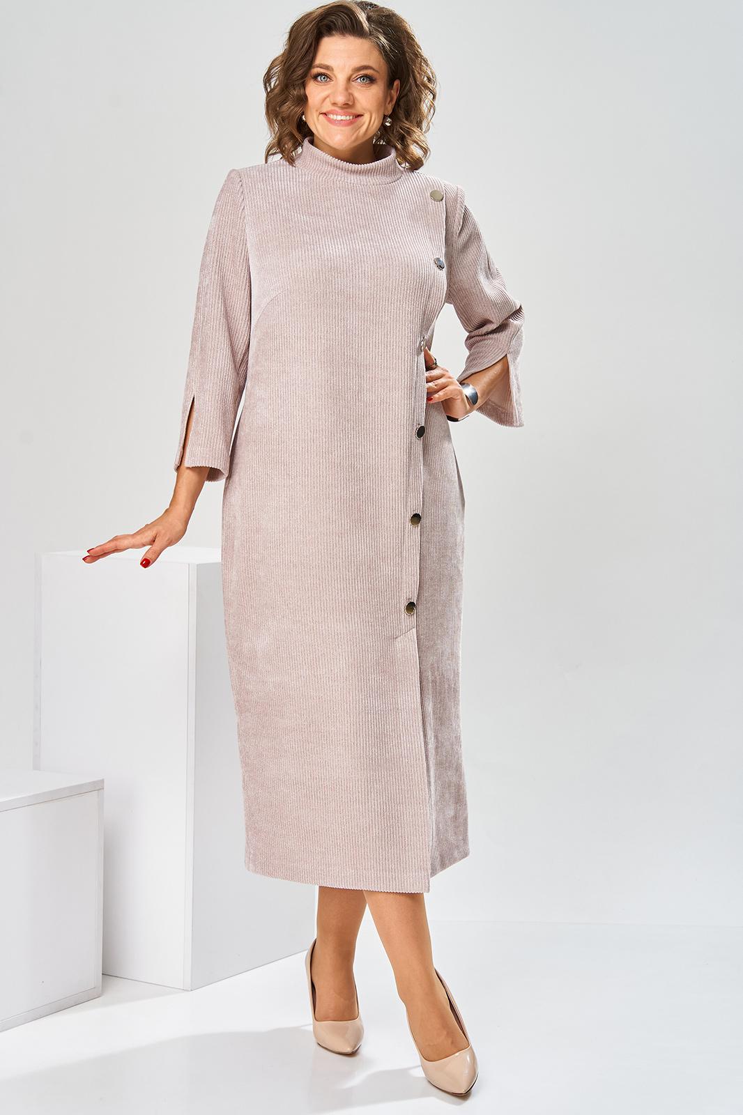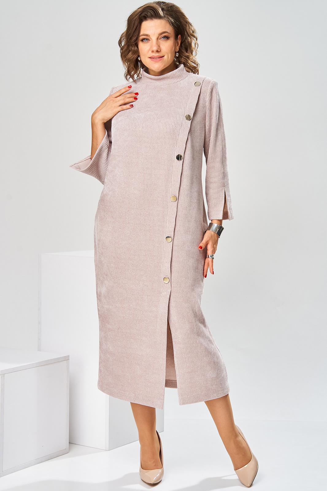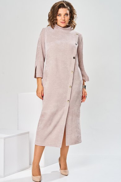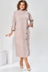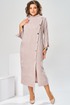 Платье женское предназначено для повседневной носки. Платье женское полу прилегающего силуэта, длиной до нижней части икры. Перед с 1-ной нагрудной вытачкой на центральной части, с 1-ним отрезным рельефом слева, выходящим из плечевого шва, шов соединения рельефа с передом декорирован 6-ю пришивными пуговицами и заканчивается шлицей. Спинка с 2-мя таллиевыми вытачками. В боковых швах обработаны карманы. Горловина круглая с втачной стойкой. Рукав втачной, 2-х шовный, длиной 7/8, верхний шов с разрезом. Платье с плечевыми накладками. Длина спинки платья 126 см, длина рукава 51 см.
