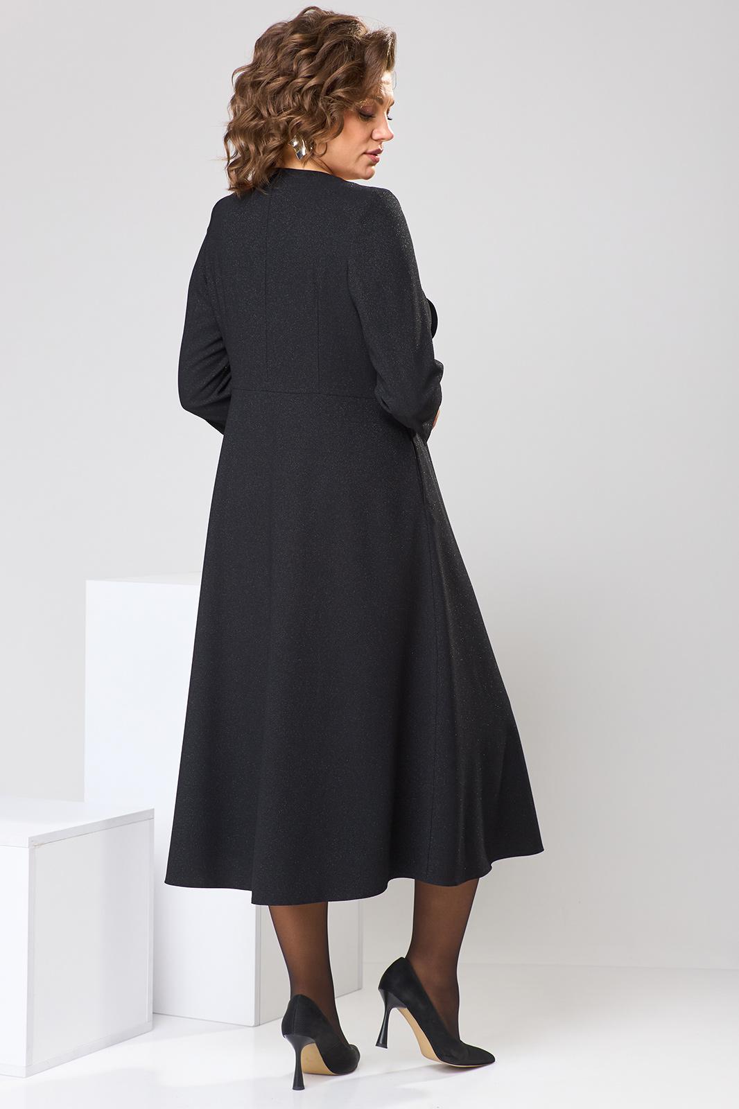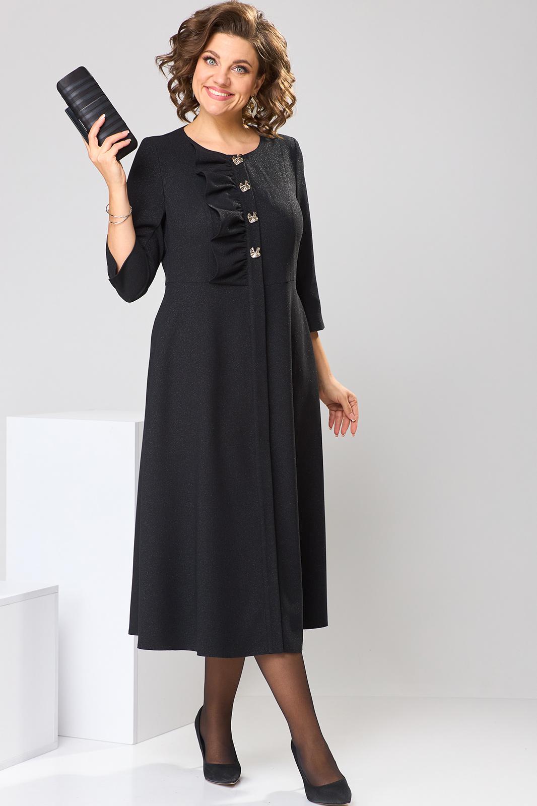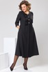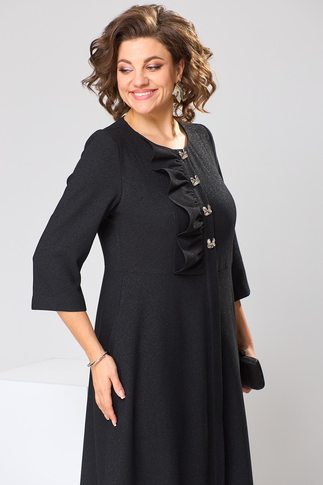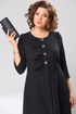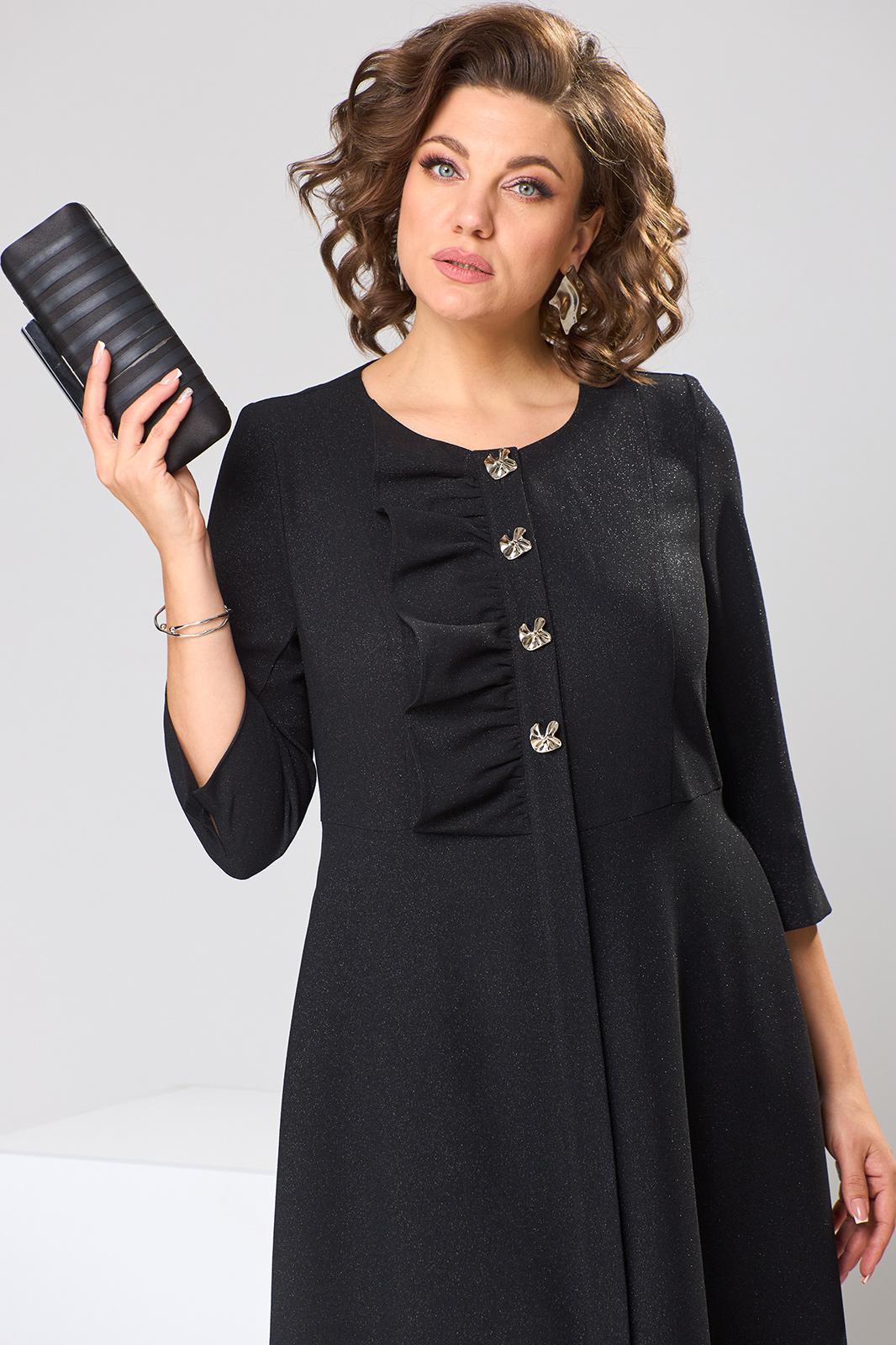 Платье женское, относится к торжественной одежде. Платье женское, отрезное по линии талии расширенное к низу, длинной до середины икры. Верхняя часть с 2-мя отрезными бочками, выходящими из плечевых швов, на правой части отделочная рюша, нижние части без конструктивных особенностей. Перед с 2-мя притачными планками. Верхняя часть спинки со спущенным швов, 2-мя таллиевыми вытачками, нижняя часть спинки без конструктивных особенностей. Горловина круглая, обточная, без воротника. Застёжка на 4-и обмётанные петли и 4-и пришивные пуговицы, потайная застёжка на нижней части платья на 6-ть обмётанных петель и 6-ть пришивных пуговиц. Боковые швы с карманами. Рукав втачной, 2-хшовный, длиной 3/4, с разрезом по локтевому шву. Платье с плечевыми накладками. Длина платья по спинке 121 см. Длина рукава 46 см.