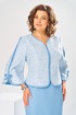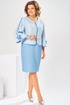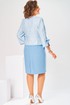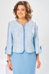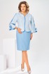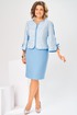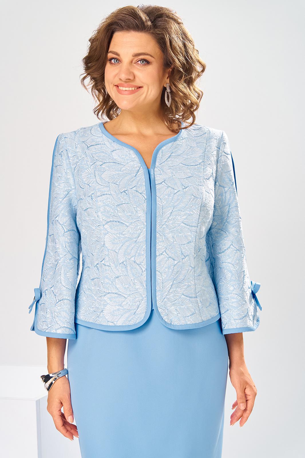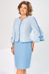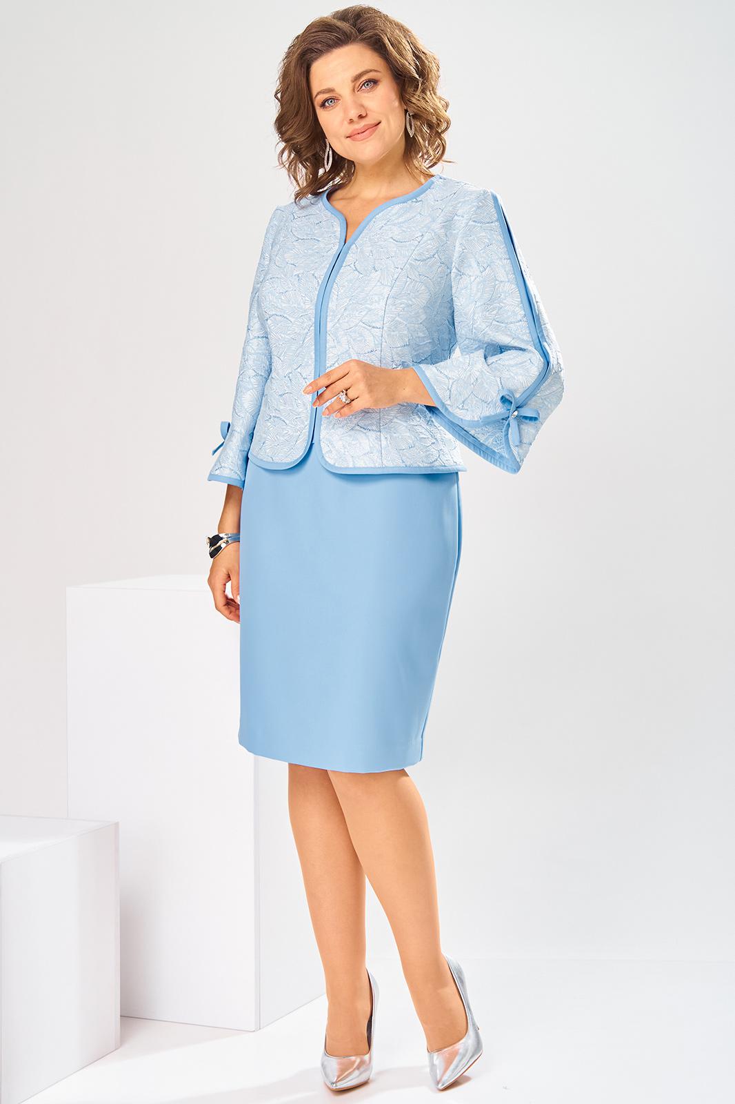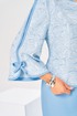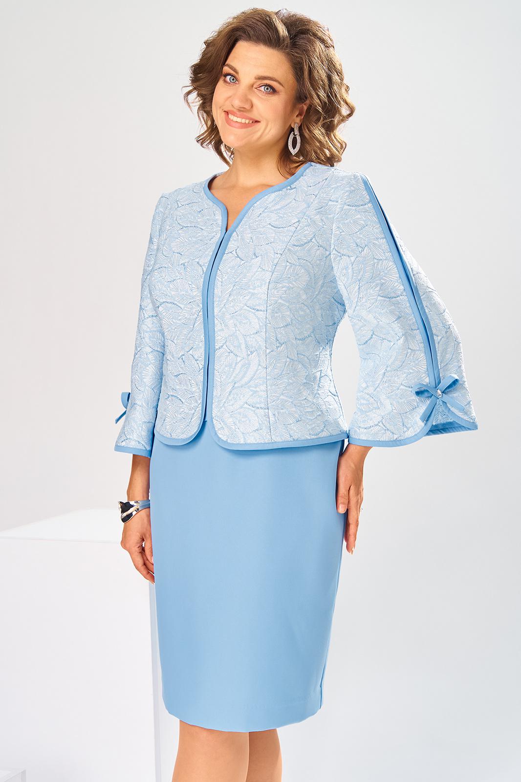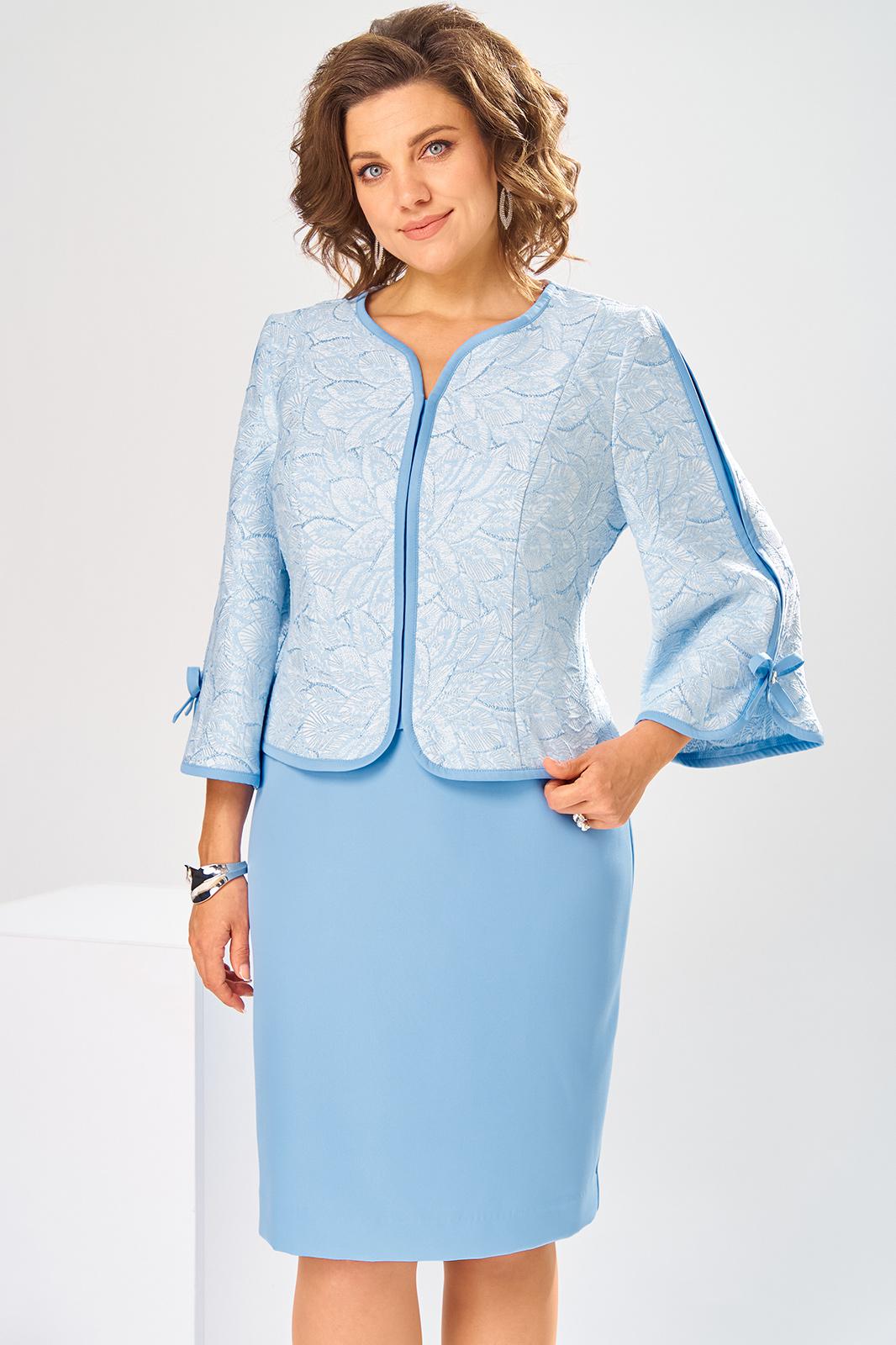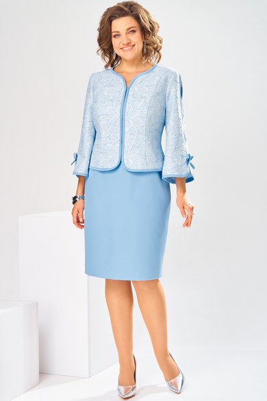 Платье женское, относится к торжественной одежде. Платье женское, полуприлегающего силуэта, длиной за колено. Платье отрезное по линии талии, выполнено имитацией костюма. Верхняя часть переда с 2-мя отрезными рельефами, выходящими из плечевых швов. Верхняя часть спинки с 2-мя отрезными бочками и средним швом. Застёжка на потайную тесьму-молнию в среднем шве спинки. Горловина фигурная. Припуски горловины среднего шва переда и низа верхней части обработаны косой бейкой шириной 1-1 см. Рукав 2-х шовный, втачной, длиной 7/8. припуски верхнего шва рукава и низа обработаны косой бейкой, шириной 1,1 см. Рукав декорирован пришивным бантом со стразой. Нижняя часть переда без конструктивных особенностей нижняя часть спинки с 2-мя таллиевыми вытачками и средним швом, заканчивающимся шлицей. Платье на подкладке отрезной по линии талии. Платье с плечевыми накладками. Длина спинки платья 99 см, длина рукава 49 см.