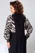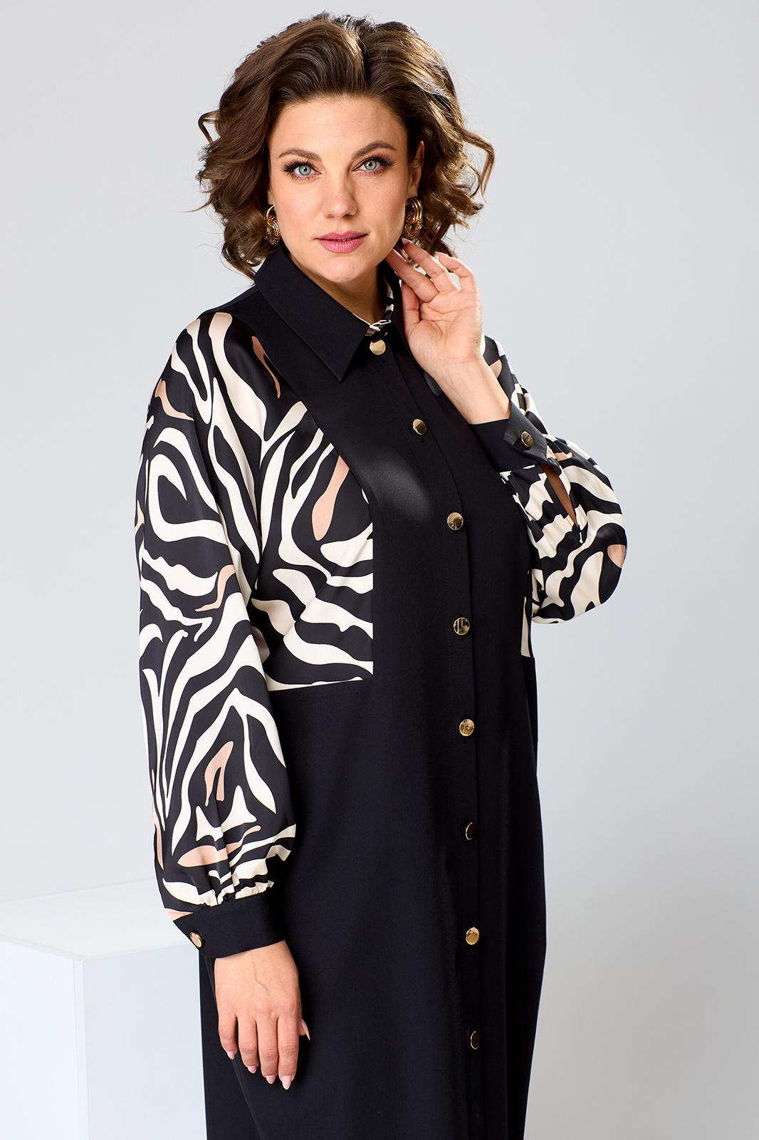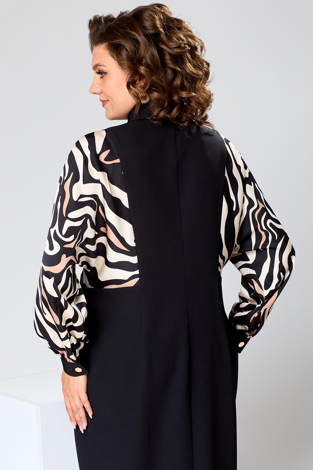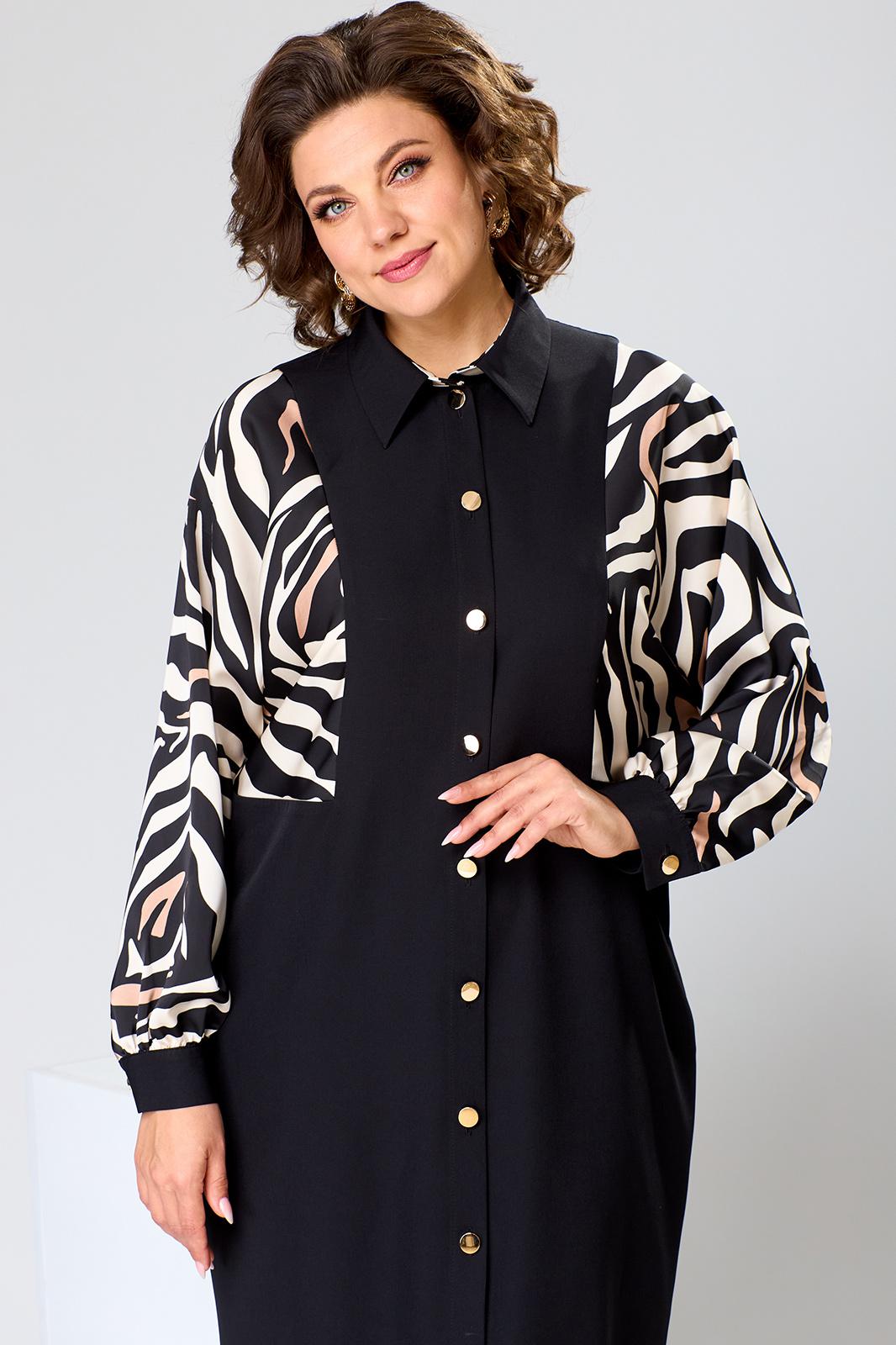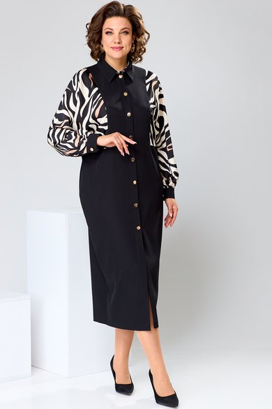 Платье женское прямого силуэта, предназначено для повседневной носки. Платье женское, прямого силуэта, длиной до середины икры. Перед с 2-мя отрезными бочками, с 2-мя вертикальными цельнокроеными планками. Спинка со средним швом, с 2-мя отрезными бочками, с 2-мя таллиевыми вытачками. Рукав длинный одно шовный, цельнокроеный с бочком переда и бочком спинки, рукав из отделочной ткани, внизу со сборкой и притачной манжетой с застёжкой на петлю обмётанную 1-ну и 1-ну пришивную пуговицу. Боковые швы с карманами. Горловина круглая с втачным воротником рубашечного типа с отрезной стойкой из отделочной ткани. Застёжка центральная на 8-мь вертикально обмётанных петель и 8-мь пришивных пуговиц. Платье без плечевых накладок. Длина спинки платья 121 см, длина рукава 65 см, дли на рукава о горловины 73 см.