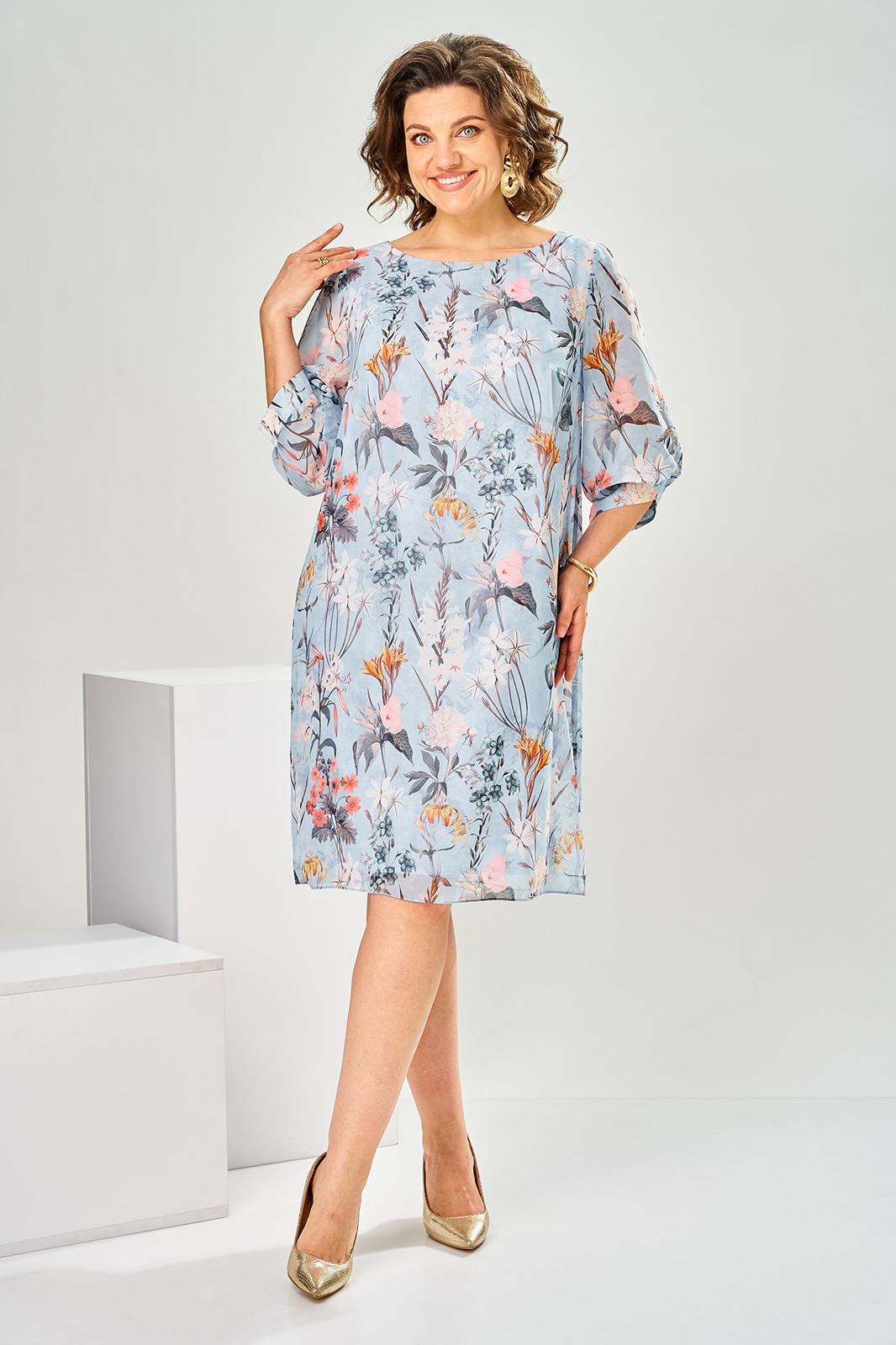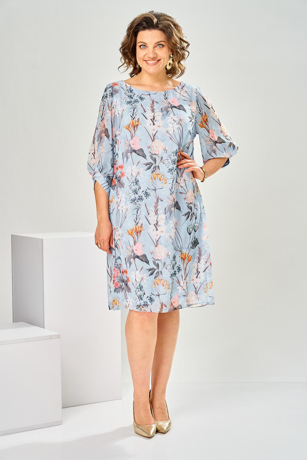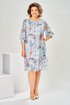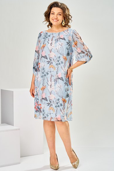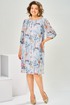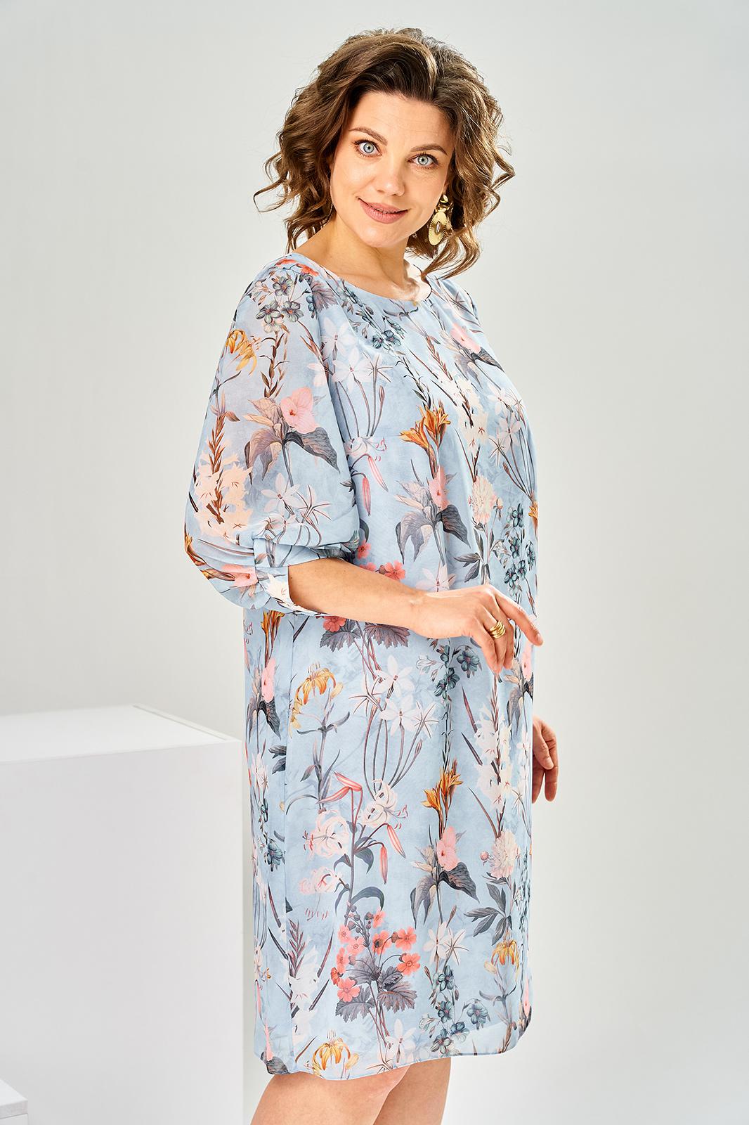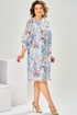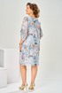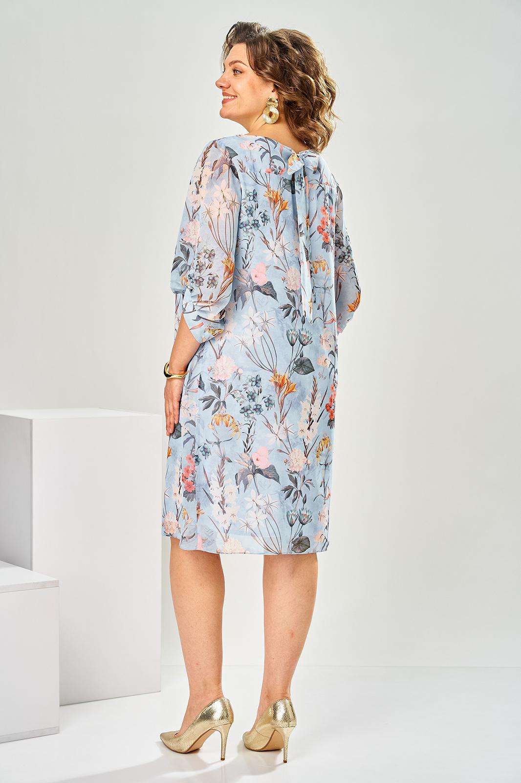Платье женское относится к нарядной торжественной одежде. Платье женское прямого силуэта, длиной за колено. Перед с 2-мя нагрудными вытачками. Спинка с отрезной кокеткой с фигурным обтачным разрезом, фиксирующимся по горловине на 2-е обточные завязки. Горловина круглая, обтачная, без воротника. Рукав втачной, одношовный, длиной 3/4 с фигурным низом с 14-ю односторонними складками (по 7 с каждой стороны от угла манжеты), с притачной манжетой из отделочной ткани. Платье на подкладке. Платье без плечевых накладок.