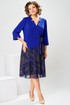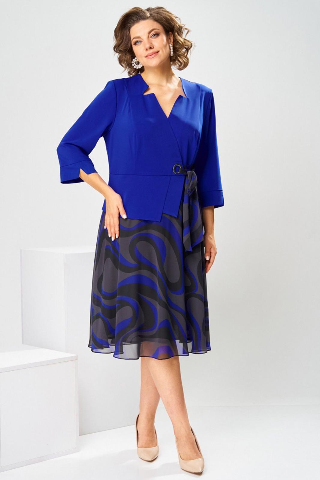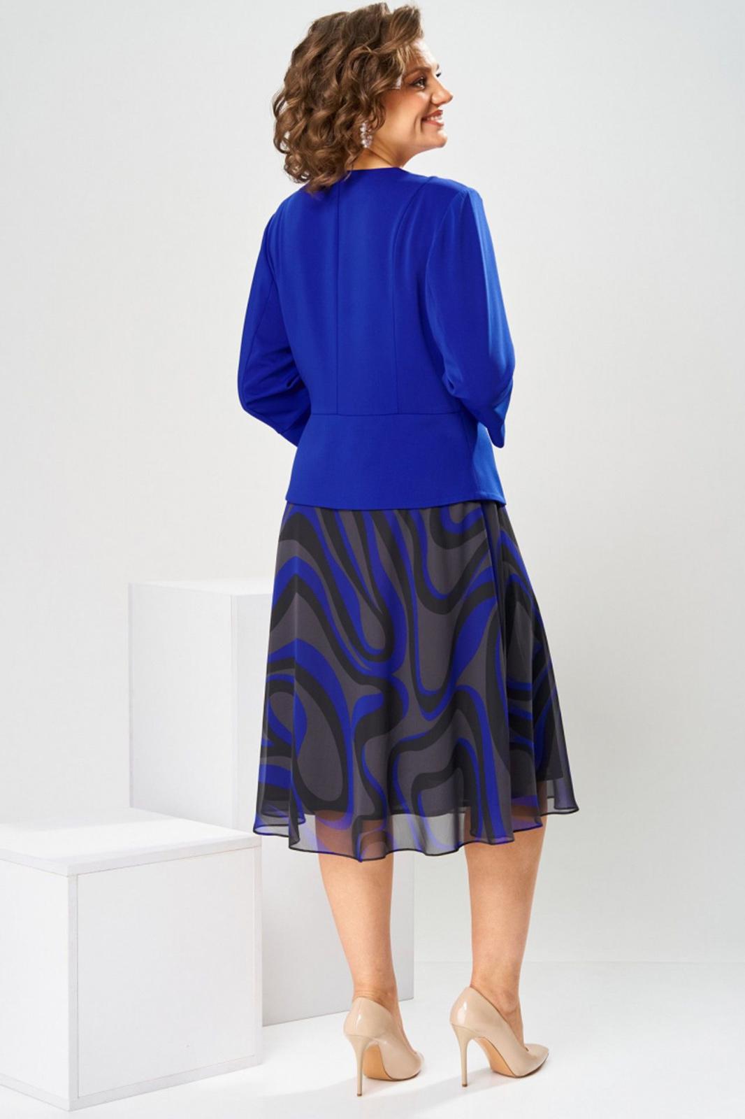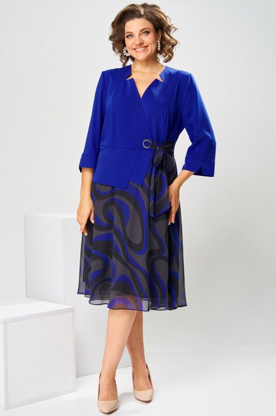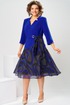 Платье женское относится к нарядной торжественной одежде, но может использовано и при повседневной носке. Платье женское, отрезное по линии талии, расширенное к низу, длиной за колено. Верхняя часть переда с отрезными рельефами, выходящими из плечевых швов, центральная часть с зафиксированным запахом. Верхняя часть спинки со средним швом и 2-мя рельефами, выходящими из плечевых швов. Горловина с V-образным вырезом, фигурная, обточная без воротника. Нижняя часть переда и нижняя часть спинки цельнокроеные, выполнены из отделочной ткани. Шов соединения верхней и нижней частей платья декорирован притачной фигурной отлетной баской. Платье с декоративным поясом из отделочной ткани, закреплённом на левом боковом шве и фиксирующимся в бант через металлическую пробивную блочку на центральной части переда. Рукав одно шовный втачной, длиной до локтя, с притачной фигурной манжетой. Платье с плечевыми накладками. Нижняя часть на подкладке. Длина платья 112 см, длина рукава 33 см.