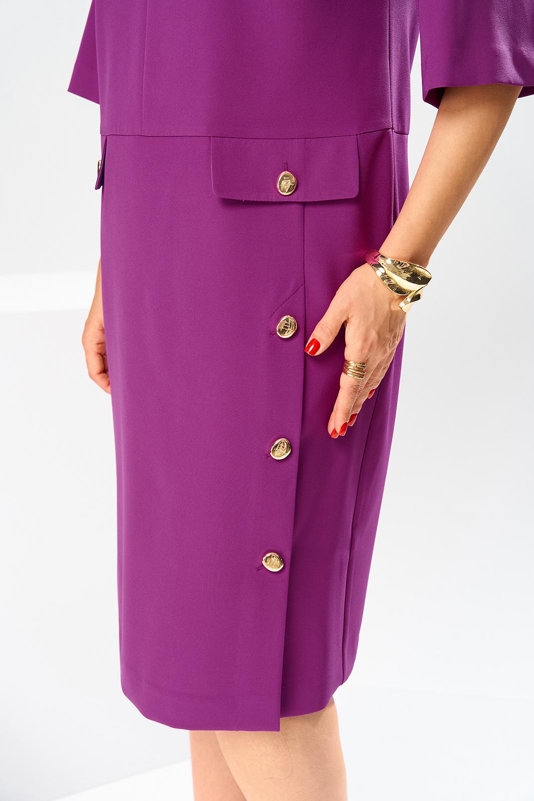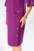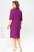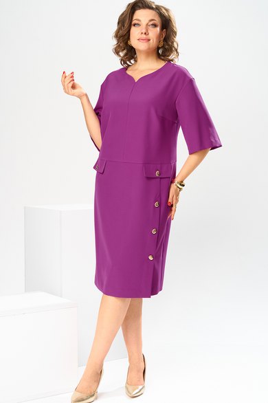 Платье женское, предназначено для повседневной носки. Платье женское, полу прилегающего силуэта, длиной за колено. Перед отрезной, ниже линии талии на 6 см; верхняя часть переда с 2-мя нагрудными выточками и средним швом, нижняя часть с отрезным бочком, шов соединения ею с передом, заканчивается шлицей, фиксирующейся на 3-и обмётанные петли и 3-и пришивные пуговицы; шов соединения часть переда декорирован 2-мя клапанами с закруглёнными концами закреплены на перед пришивными пуговицами. Спинка отрезная ниже линии талии на 6 см; верхняя часть с 2-мя таллиевыми вытачками и средним швом, нижняя часть с 2-мя таллиевыми выточками. Горловина с фигурным вырезом, обтачная без воротника. Платье со спущенным плечом. Рукам втачной, одно шовный, длиной за локоть. Платье без плечевых накладок. Длина спинки 105 см. Длина рукава+плечо 48 см.