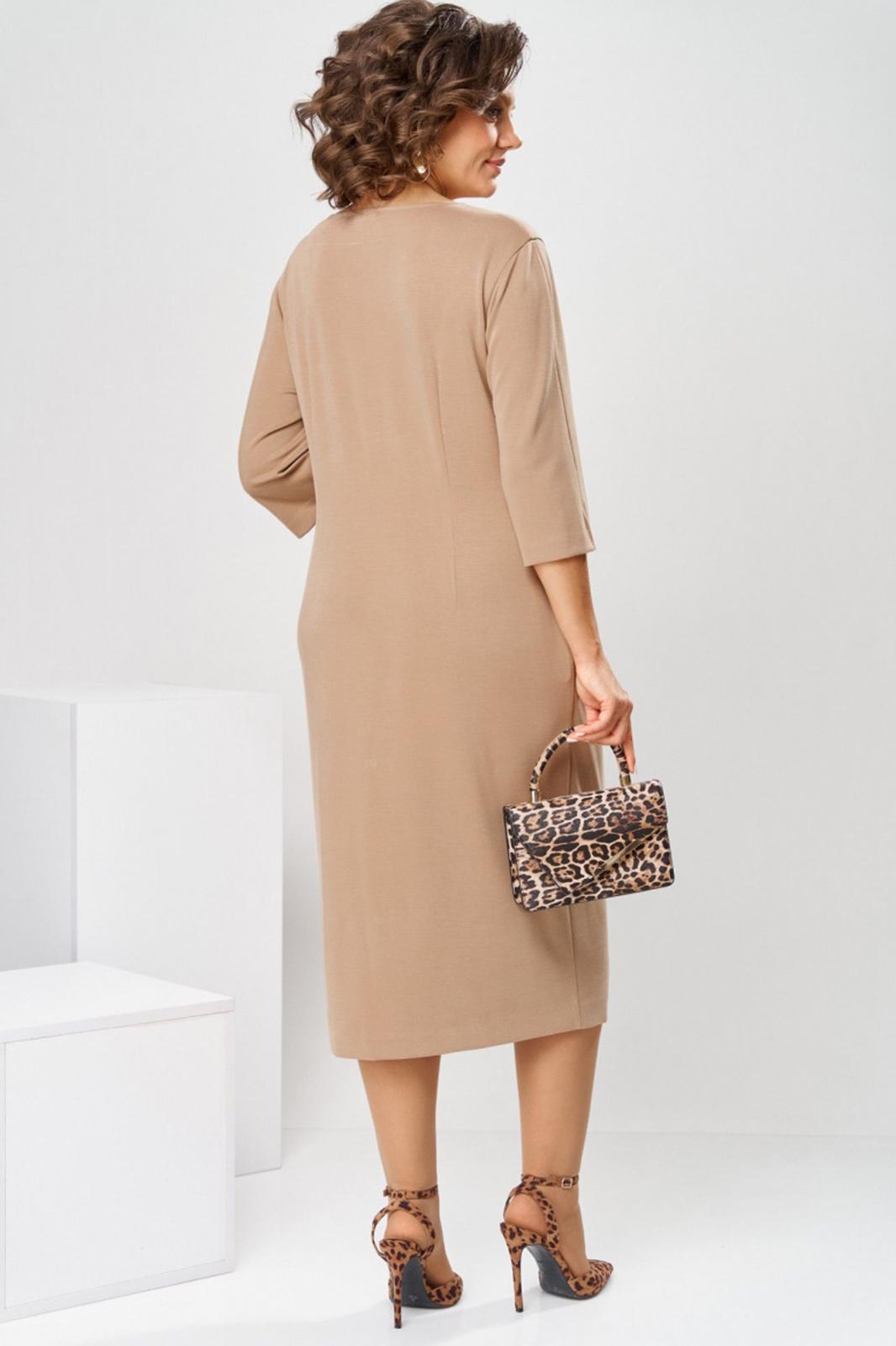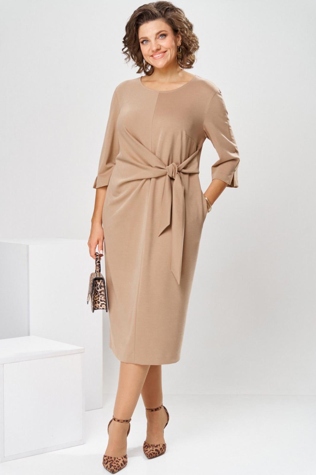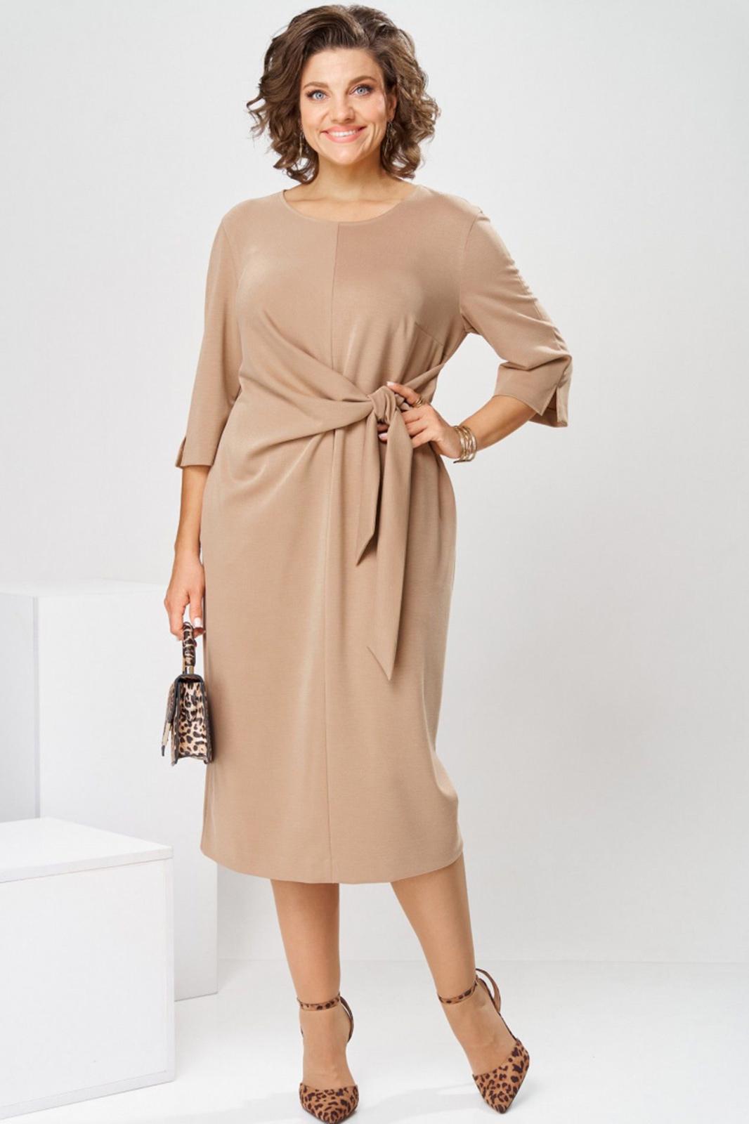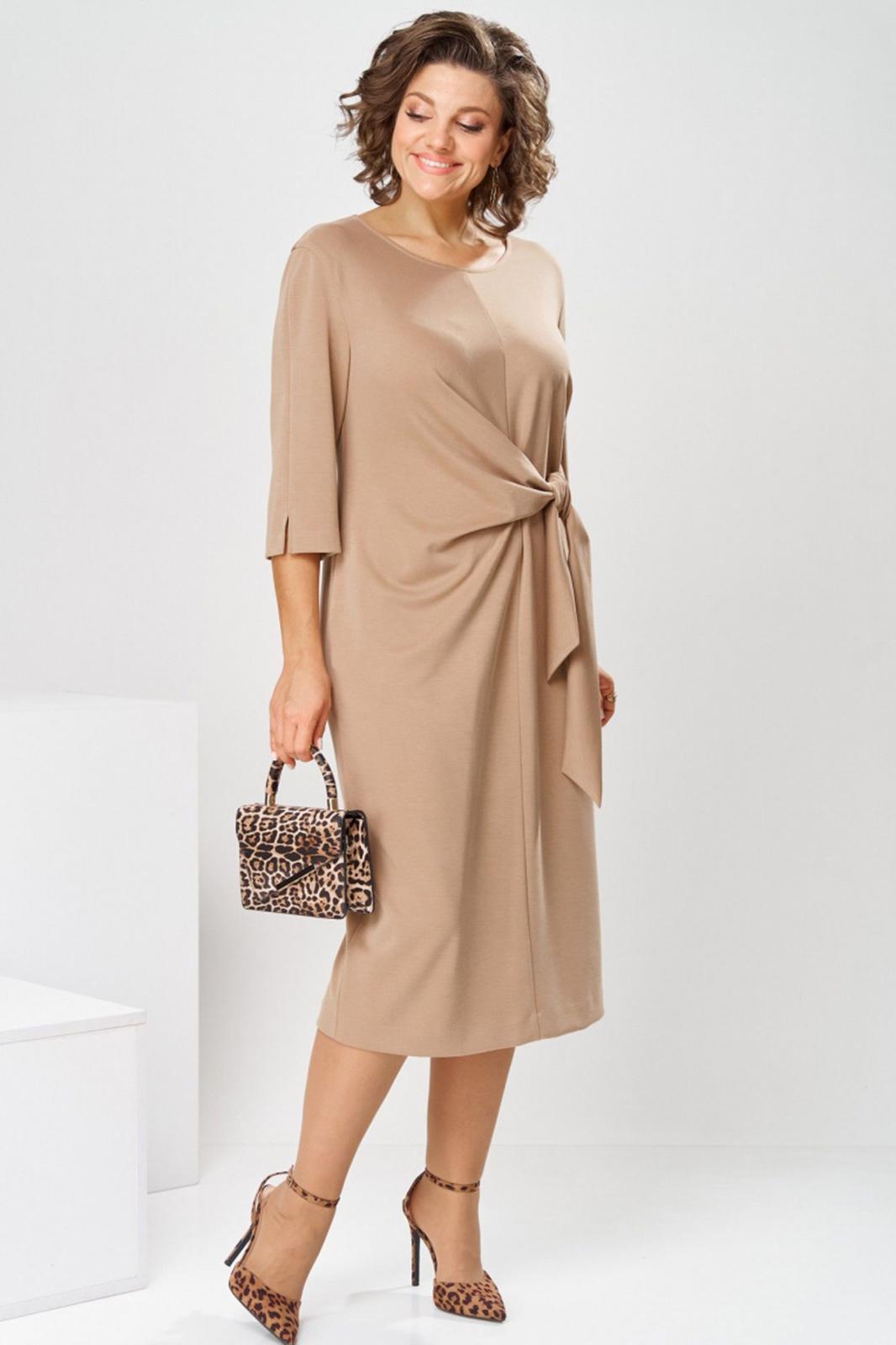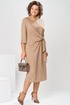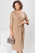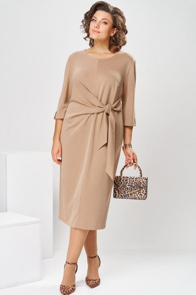 Платье женское, предназначено для повседневной носки. Платье женское, полуприлегающего силуэта, длиной ниже колена. Перед со средним швом, левая часть с 1-ной нагрудной выточкой и закреплённой на уровне линии талии в боковом шве обмётаной завязкой, правая часть с цельнокроенной обтачной завязкой, при завязывании формируются мягкие складки. Спинка с 2-мя таллиевыми вытачками. Горловина круглая обточная, без воротника. Платье со спущенным плечом. Рукав втачной, 2-х шовный, длиной 3/4, верхний шов внизу с разрезом. Платье с карманами в боковых швах. платье без плечевых накладок. Длина спинки платья 112,5 см. длина рукава 41 см.