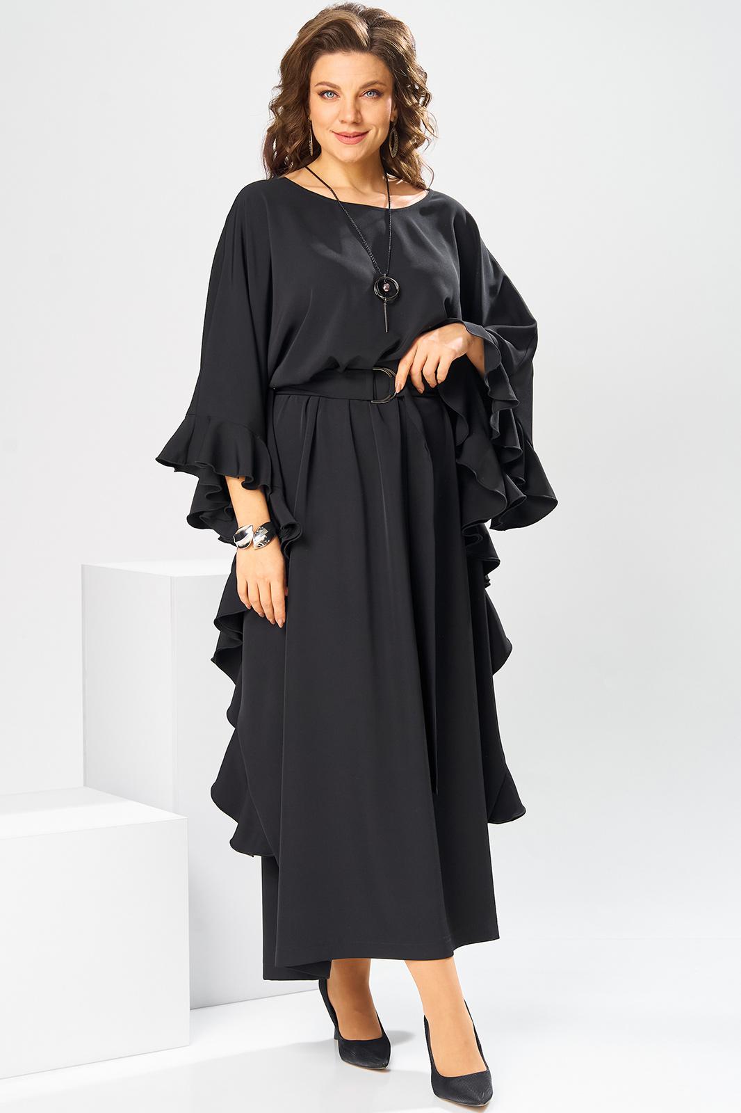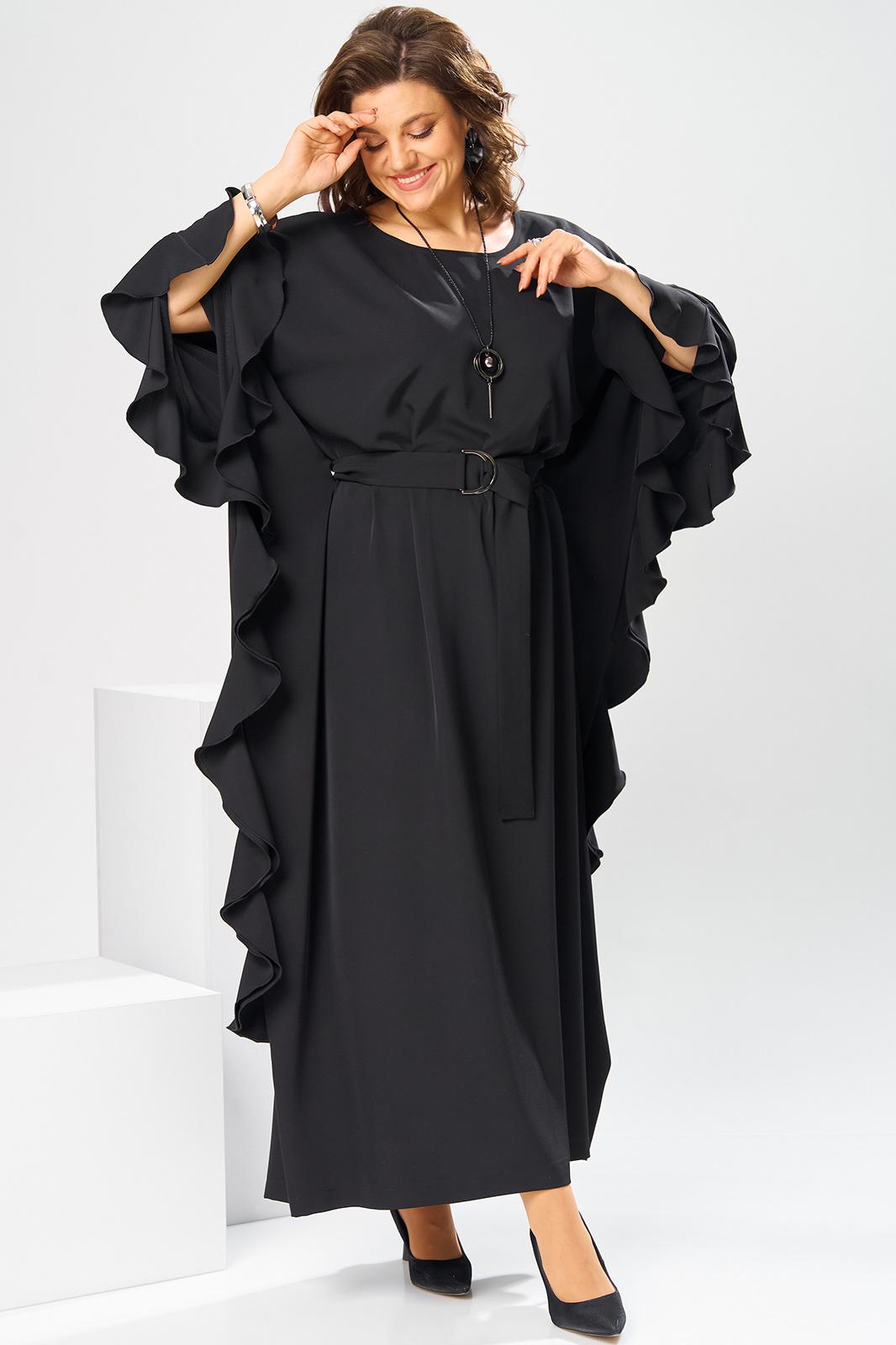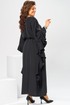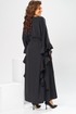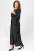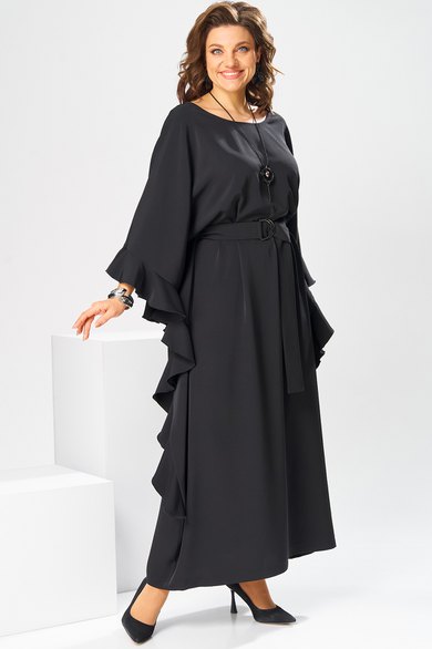 Платье женское, относится к нарядной торжественной одежде. Платье пончо свободного кроя, длинное. Перед цельнокроеный. Спинка со средним швом, вверху с разрезом, фиксирующимся по горловине на 1-ну навесную петлю и 1-ну пришивную пуговицу. Горловина круглая, обточная, без воротника, по переду горловины отделочная строчка 0,6 см. Рукав цельнокроеный удлинённый. Низ рукава и боковые швы декорированы приточной оборкой. По боковым швам зафиксирован уровень пройм и место расположения петель на уровне линии талии отделочными строчками. К платью прилагается съёмный пояс с пряжкой, фиксируемые на платье в петли на уровне линии талии. Платье без плечевых накладок. Длина спинки платья 132 см, ширина на уровне глубины проймы 66 см, ширина по линии талии 66 см, ширина плеча+длина рукава 56,5 см.