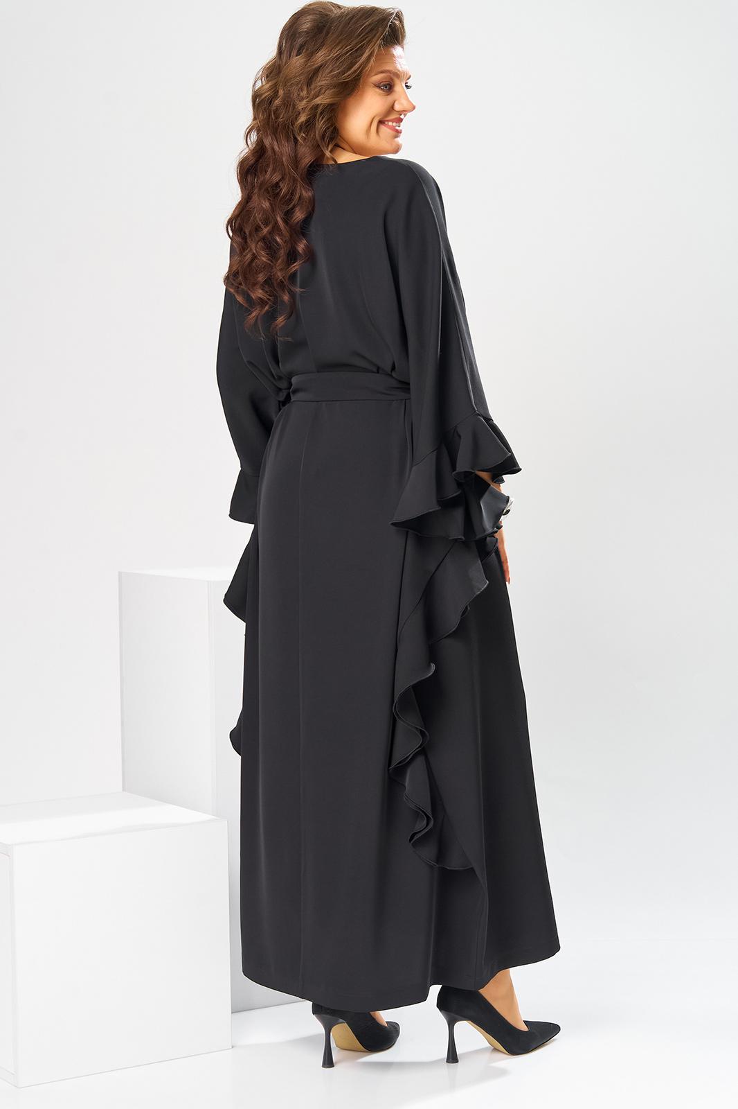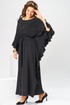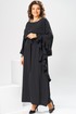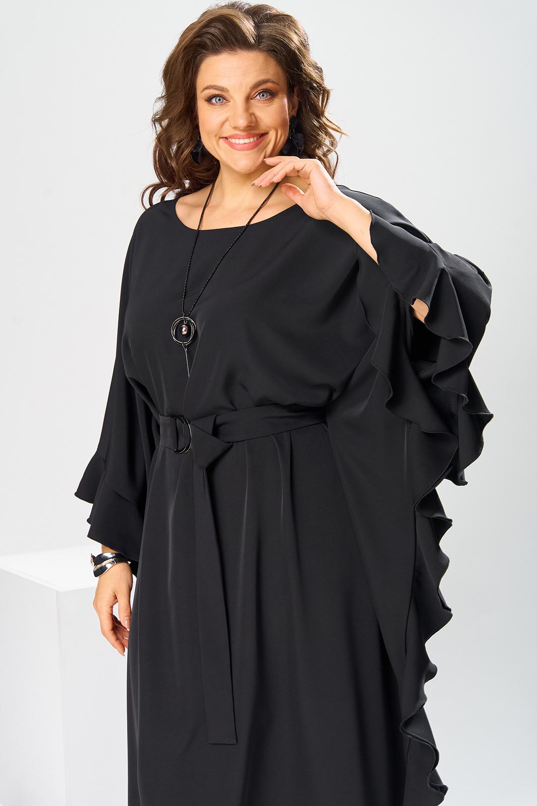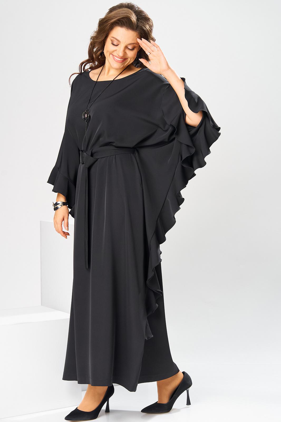 Платье женское, относится к нарядной торжественной одежде. Платье пончо свободного кроя, длинное. Перед цельнокроеный. Спинка со средним швом, вверху с разрезом, фиксирующимся по горловине на 1-ну навесную петлю и 1-ну пришивную пуговицу. Горловина круглая, обточная, без воротника, по переду горловины отделочная строчка 0,6 см. Рукав цельнокроеный удлинённый. Низ рукава и боковые швы декорированы приточной оборкой. По боковым швам зафиксирован уровень пройм и место расположения петель на уровне линии талии отделочными строчками. К платью прилагается съёмный пояс с пряжкой, фиксируемые на платье в петли на уровне линии талии. Платье без плечевых накладок. Длина спинки платья 132 см, ширина на уровне глубины проймы 66 см, ширина по линии талии 66 см, ширина плеча+длина рукава 56,5 см.
