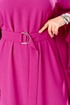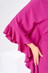 Платье женское, относится к нарядной торжественной одежде. Платье пончо свободного кроя, длинное. Перед цельнокроеный. Спинка со средним швом, вверху с разрезом, фиксирующимся по горловине на 1-ну навесную петлю и 1-ну пришивную пуговицу. Горловина круглая, обточная, без воротника, по переду горловины отделочная строчка 0,6 см. Рукав цельнокроеный удлинённый. Низ рукава и боковые швы декорированы приточной оборкой. По боковым швам зафиксирован уровень пройм и место расположения петель на уровне линии талии отделочными строчками. К платью прилагается съёмный пояс с пряжкой, фиксируемые на платье в петли на уровне линии талии. Платье без плечевых накладок. Длина спинки платья 132 см, ширина на уровне глубины проймы 66 см, ширина по линии талии 66 см, ширина плеча+длина рукава 56,5 см.