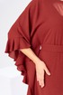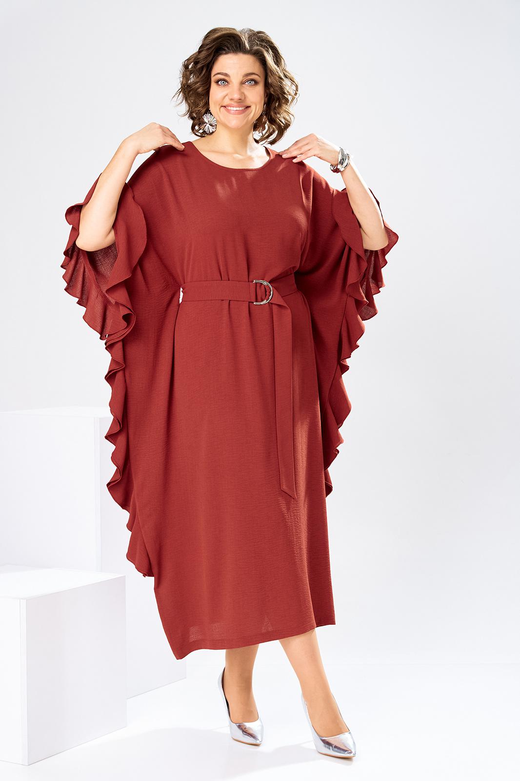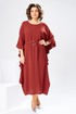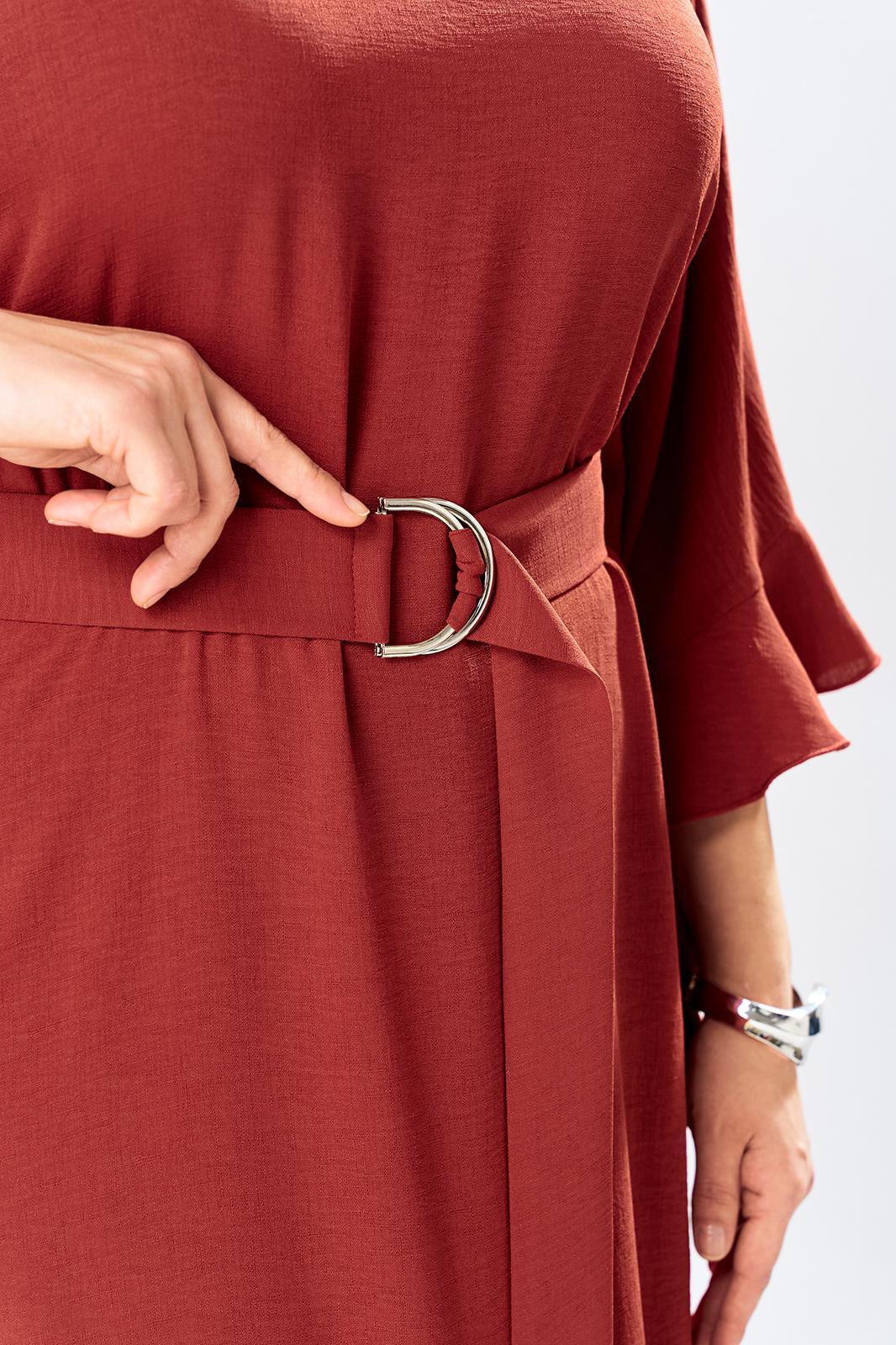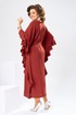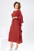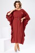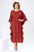 Платье женское, относится к нарядной торжественной одежде. Платье пончо свободного кроя, длинное. Перед цельнокроеный. Спинка со средним швом, вверху с разрезом, фиксирующимся по горловине на 1-ну навесную петлю и 1-ну пришивную пуговицу. Горловина круглая, обточная, без воротника, по переду горловины отделочная строчка 0,6 см. Рукав цельнокроеный удлинённый. Низ рукава и боковые швы декорированы приточной оборкой. По боковым швам зафиксирован уровень пройм и место расположения петель на уровне линии талии отделочными строчками. К платью прилагается съёмный пояс с пряжкой, фиксируемые на платье в петли на уровне линии талии. Платье без плечевых накладок. Длина спинки платья 132 см, ширина на уровне глубины проймы 66 см, ширина по линии талии 66 см, ширина плеча+длина рукава 56,5 см.