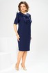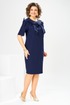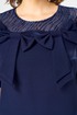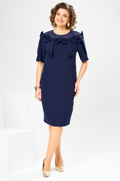 Платье женское относится к нарядной торжественной одежде. Платье женское, полуприлегающего силуэта, длиной за колено. Перед с 2-мя нагрудными вытачками, с отрезной кокеткой и отделочной ткани, переходящей из рукавов. Спинка с отрезной кокеткой из отделочной ткани, переходящей на рукав, с 2-мя таллиевыми вытачками, со средним швом, заканчивающимся шлицей. Горловина круглая, обточная без воротника. Застёжка на потайную тесьму-молнию в среднем шве спинки. Рукав втачной, одно шовный, длиной до локтя. Перед плятья по шву притачивания кокетки декорирован 4-мя настрочными бантами. Боковые швы с карманами. Платье без плечевых накладок. Длина платья по спинке 102 см, длина рукава 27 см.
