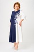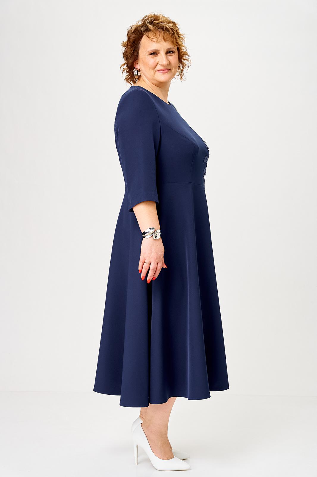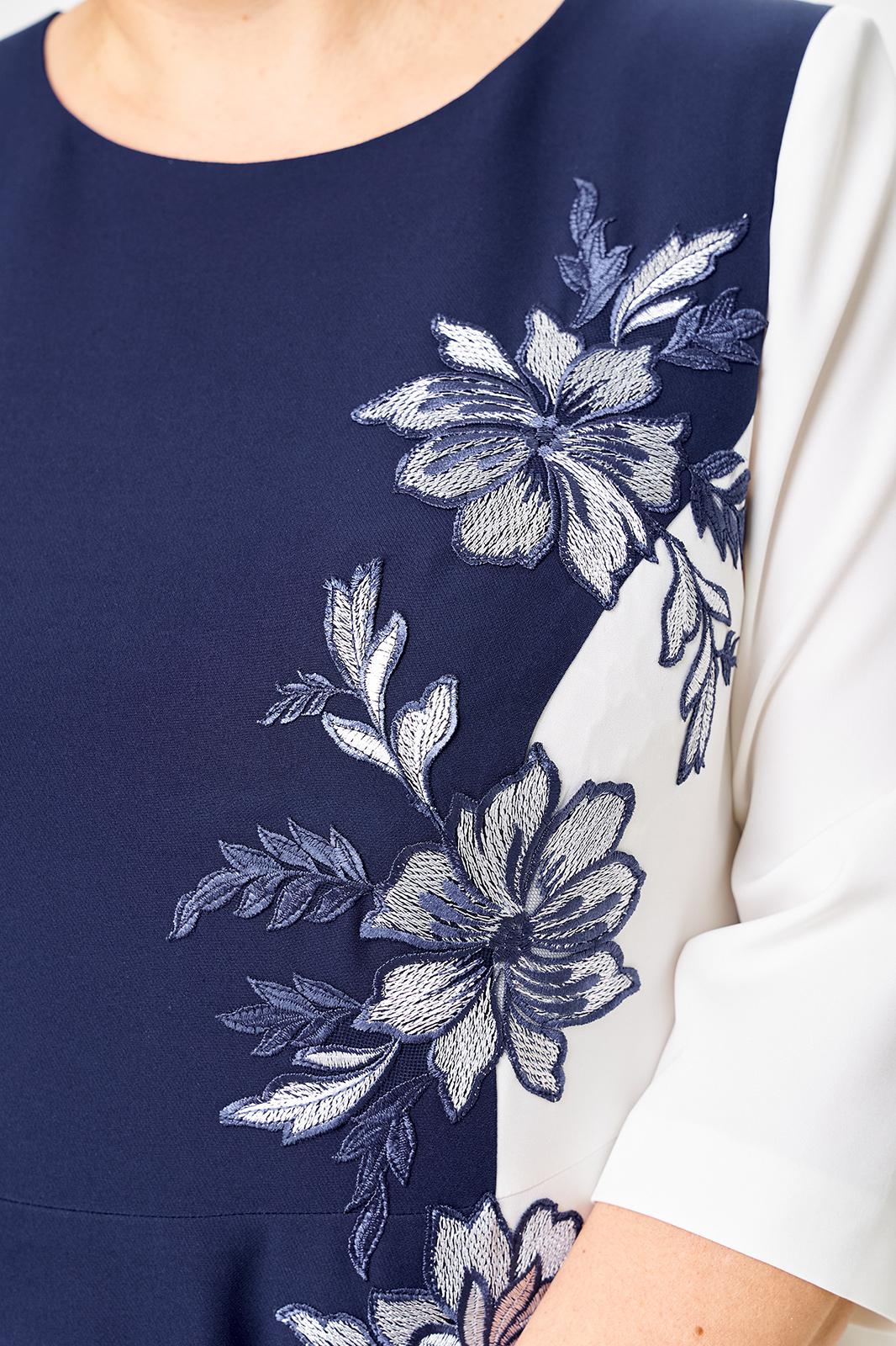 Платье женское, относится к торжественной, нарядной одежде. Платье женское, отрезное по линии талии, расширенное к низу, длиной до середины икры. Верхняя часть переда с 2-мя отрезными бочками, левый из отделочной ткани; нижняя часть переда с отрезным бочком с левой стороны из отделочной ткани. Шов соединения бочков из отделочной ткани с передом декорирован настрочной аппликацией. Верхняя часть спинки с 2-мя отрезными бочками из отделочной ткани, нижняя часть спинки с 1-ним отрезным бочком из отделочной ткани слева. Горлловина круглая, обточная, без воротника. Застёжка на потайную тесьму-молнию в левом боковом шве платья. Рукав втачной 2-х шовный, длиной 3/4, локтевой шов внизу с разрезом. Левой рукав из отделочной ткани. Платье с плечевыми накладками. Длина спинки платья 118 см. Длина рукава 44,5 см.