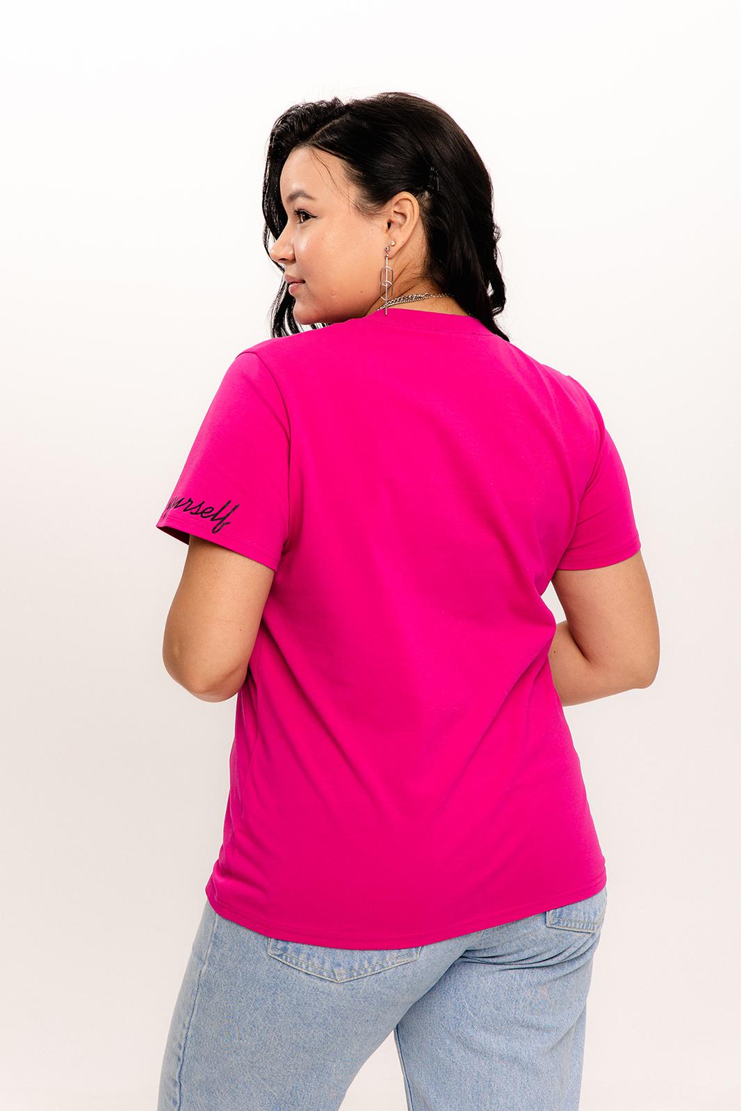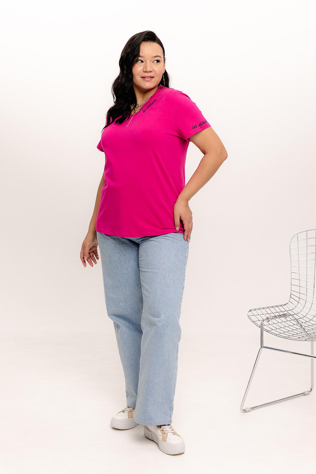Джемпер полуприлегающего силуэта. Рукав втачной, короткий. Форма горловины V-образная. Вырез горловины обработан притачной бейкой . Низ рукавов и спинки обработаны на плоскошовной машине. На левом рукаве и слева у горловины нанесена печать. Джемпер изготовлен из трикотажного полотна, в составе которого хлопок 94%, эластан 6%.