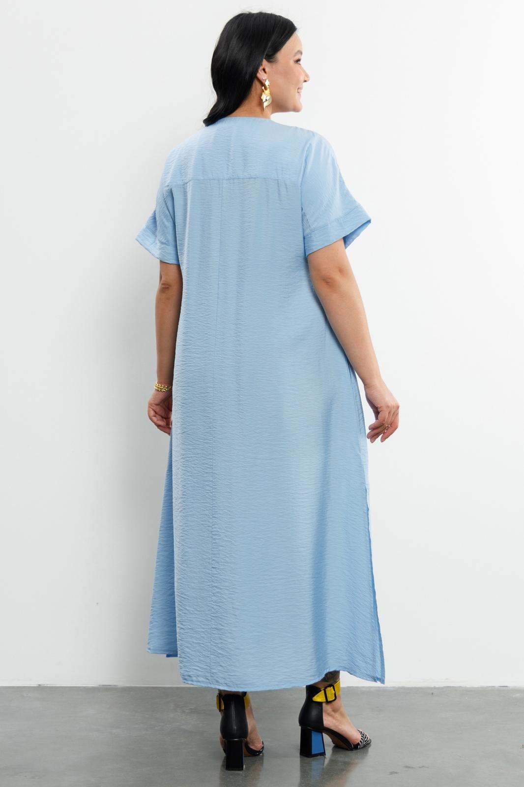 Дизайн: платье-макси с V-образным вырезом, короткими рукавами и декоративной отделкой на груди, подчёркивающее женственность и стиль;