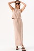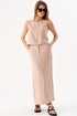 Данная модель выполнена в классическом прямом силуэте, который универсален и подходит практически любому типу фигуры. Длина юбки макси подчеркивает изящество линий и придает образу утонченность. Отсутствие излишних деталей, таких как рюши или декоративные элементы, делает ее универсальной вещью, легко вписывающейся в различные стилевые решения – от повседневного кэжуал до более элегантного вечернего.