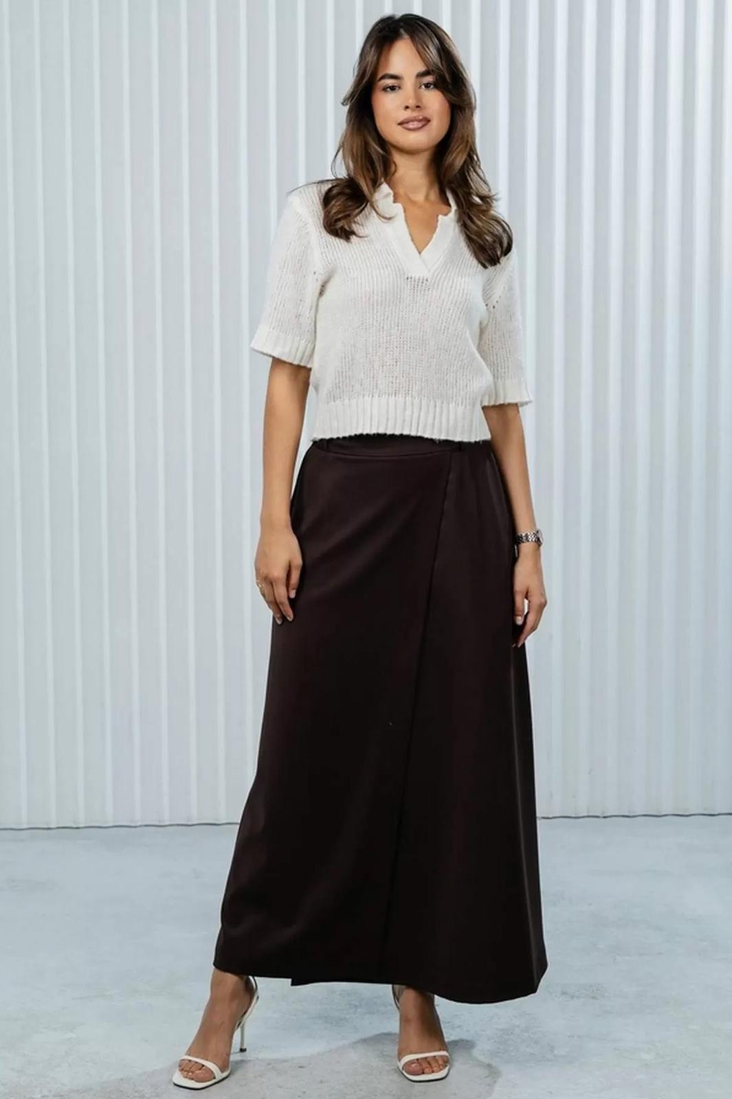 Юбка отлично сочетается с блузками, как на фото, свитерами или рубашками. Для завершения образа подойдут туфли на каблуке, лодочки или стильные сандалии. Дополните образ минималистичными аксессуарами, такими как тонкий ремень или серьги.