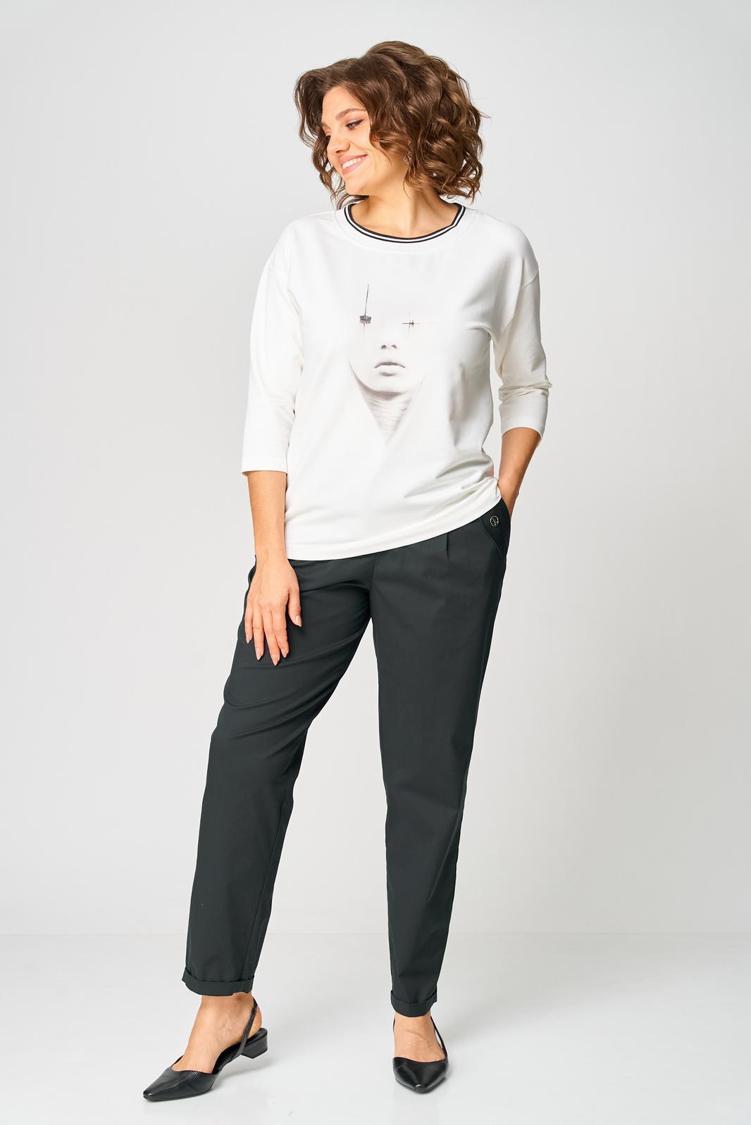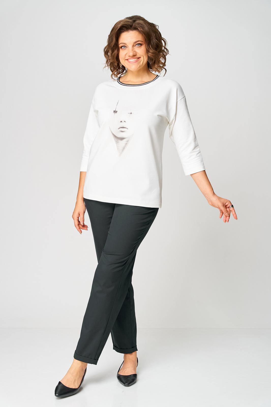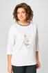 Джемпер из трикотажной ткани (двунитка). Спущенное плечо. Рукав 3/4. Перед футболки с принтом. Вырез горловины круглый, обработан довязом. Спинка без среднего шва.