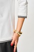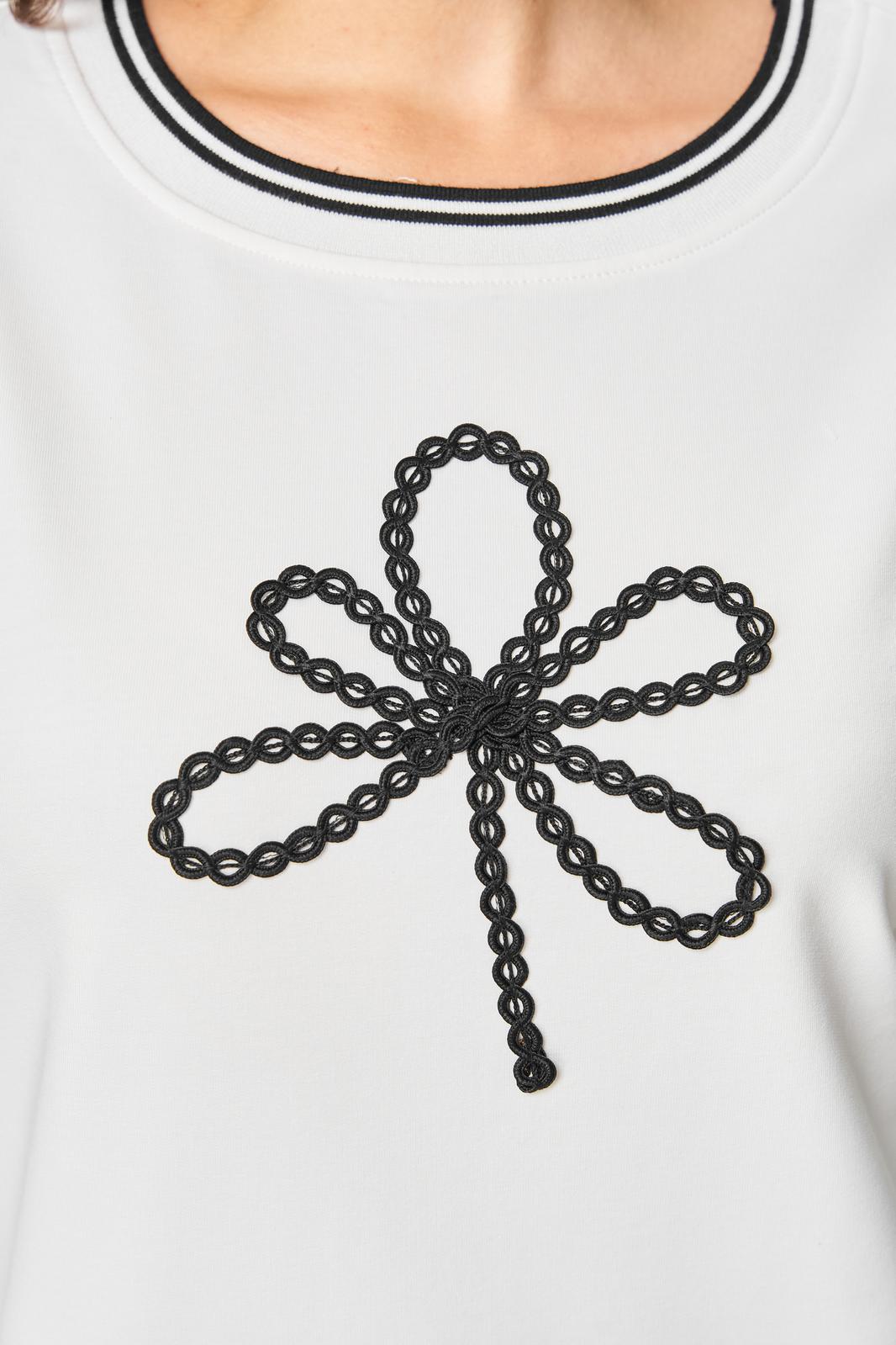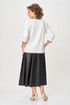 Джемпер женский из трикотажной хлопковой ткани (двунитка). По переду джемпера расположен декоративный элемент из тесьмы. Спущенное плечо, рукав 3/4. Низ рукава, низ изделия и вырез горловины обработаны довязом. Спинка без среднего шва.