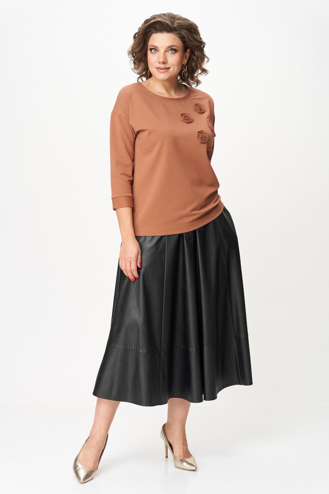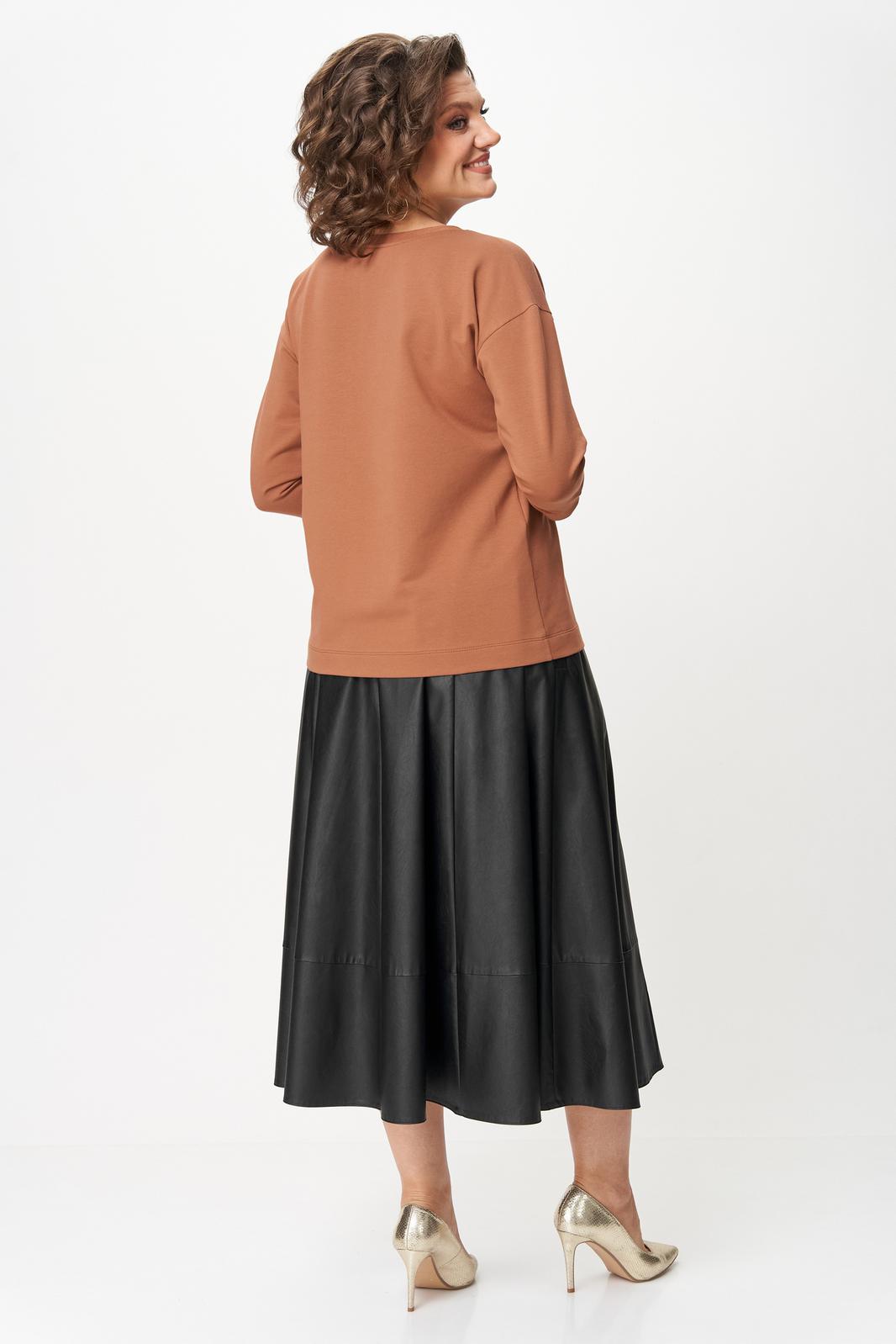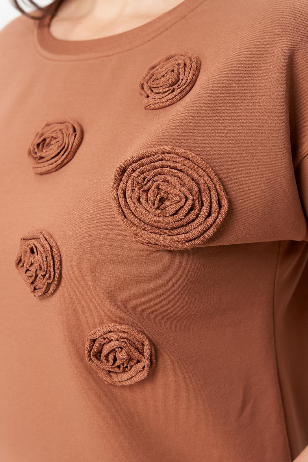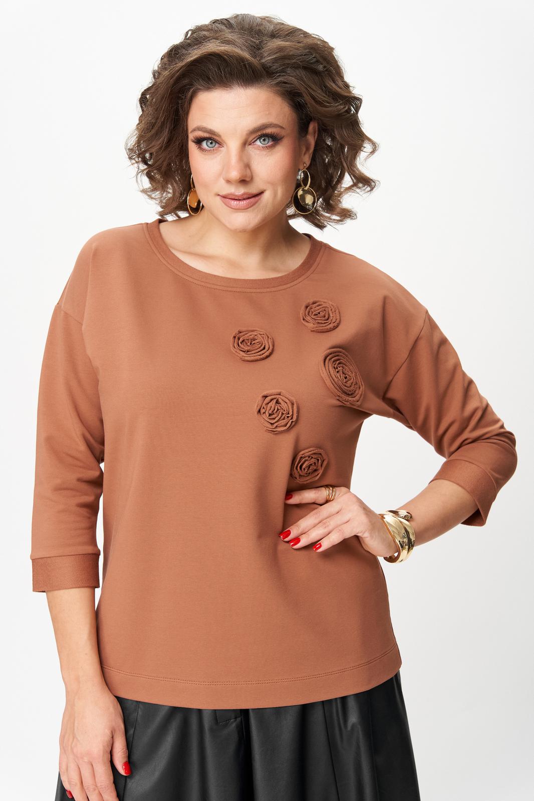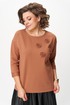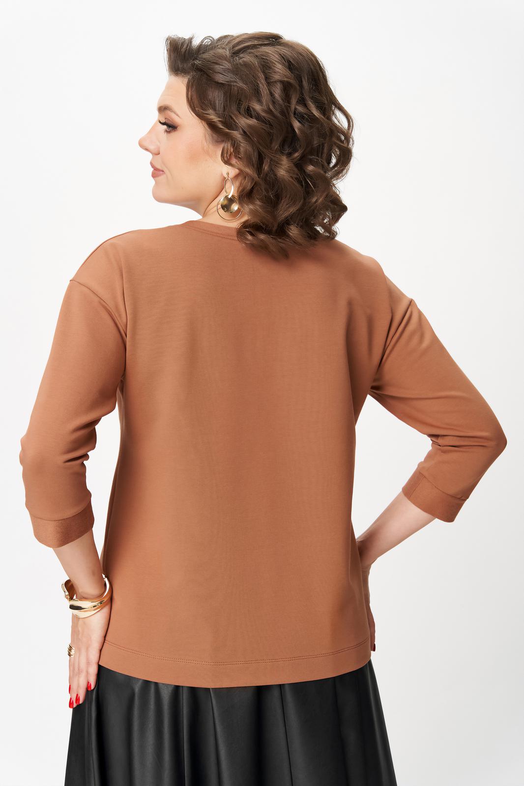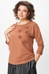 Джемпер женский из трикотажной хлопковой ткани (двунитка). По переду джемпера расположены декоративные элементы. Спущенное плечо, рукав 3/4. Низ рукава обработан манжетой. Вырез горловины круглый, оформлен бейкой.