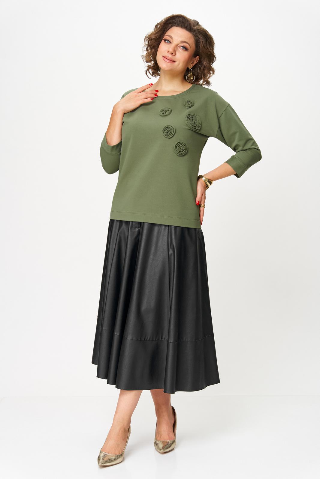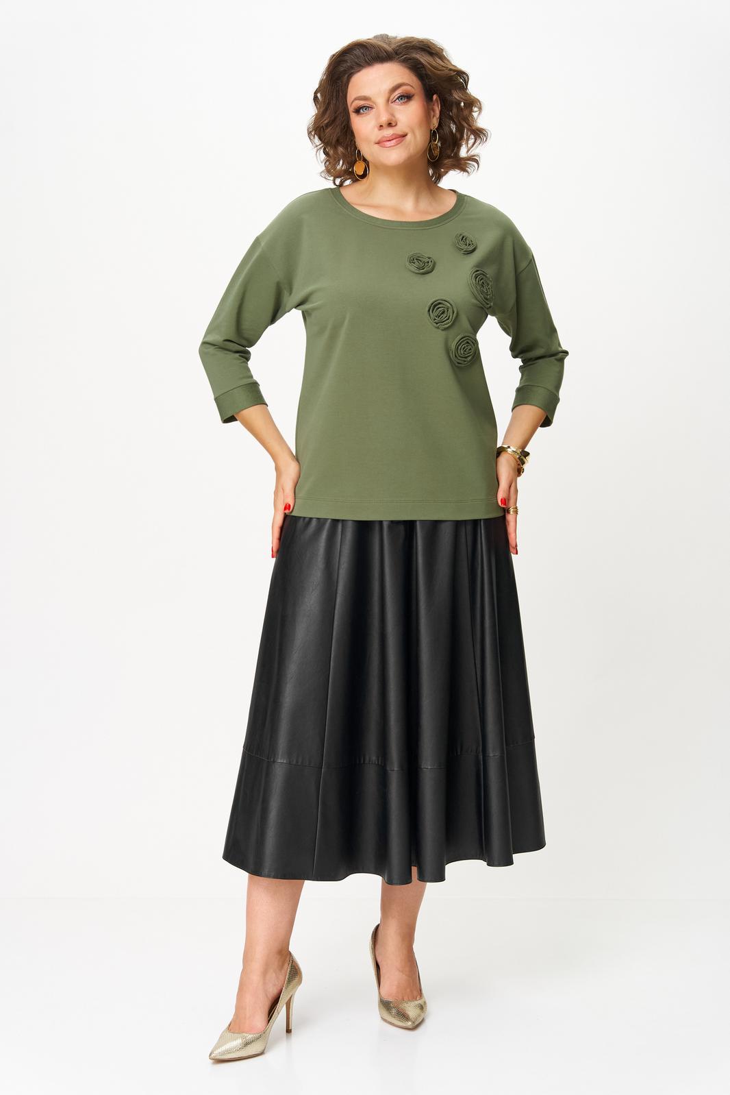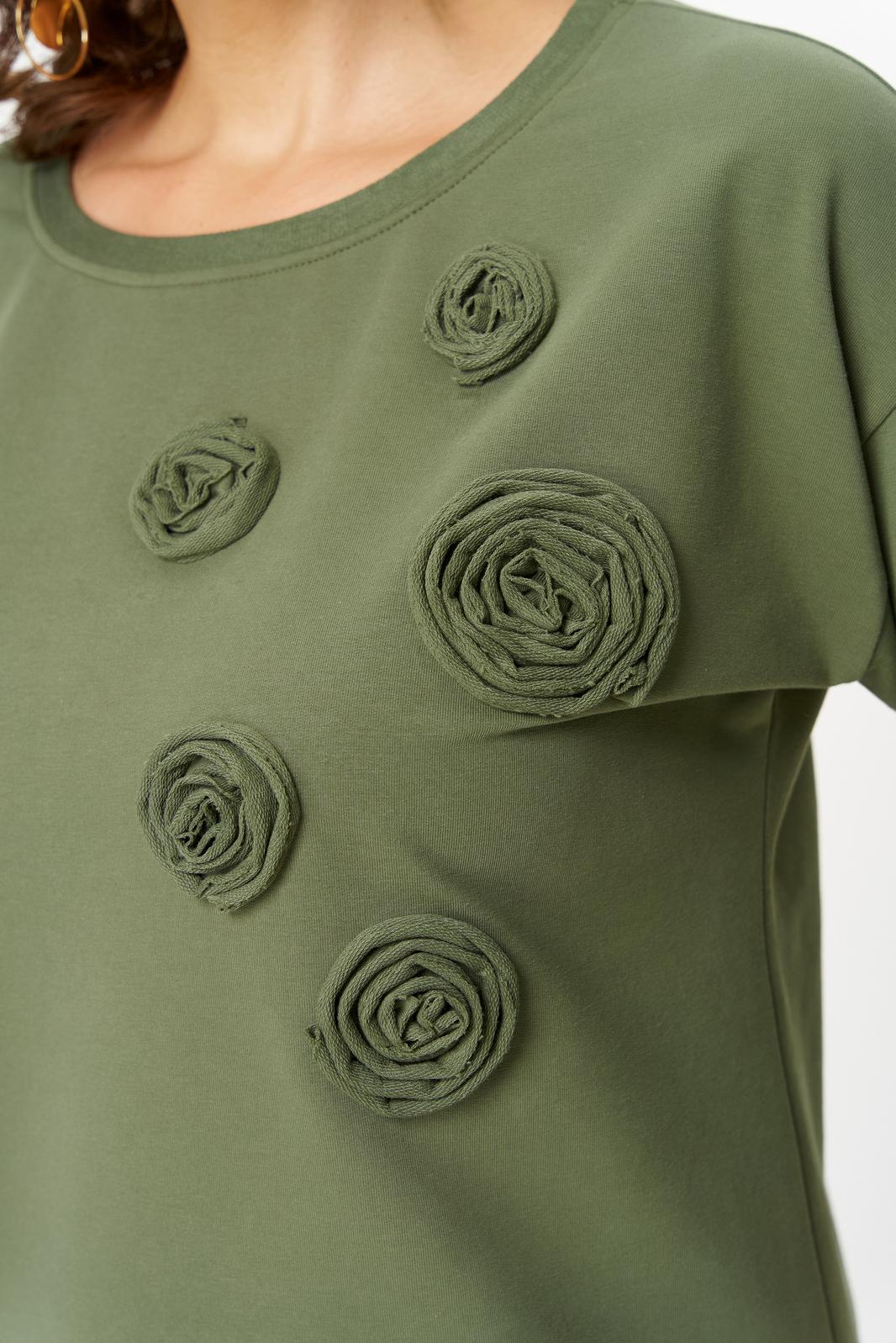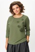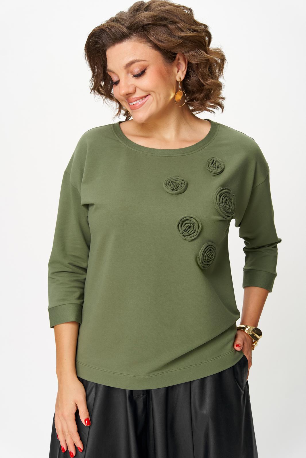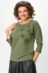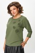 Джемпер женский из трикотажной хлопковой ткани (двунитка). По переду джемпера расположены декоративные элементы. Спущенное плечо, рукав 3/4. Низ рукава обработан манжетой. Вырез горловины круглый, оформлен бейкой.