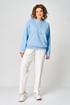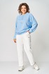 Брюки женские из трикотажной ткани (двунитка), слегка заужены к низу. По переду брюк расположены накладные карманы. На левом кармане настрочной декоративный элемент. В пояс вставлена резинка по кругу.
