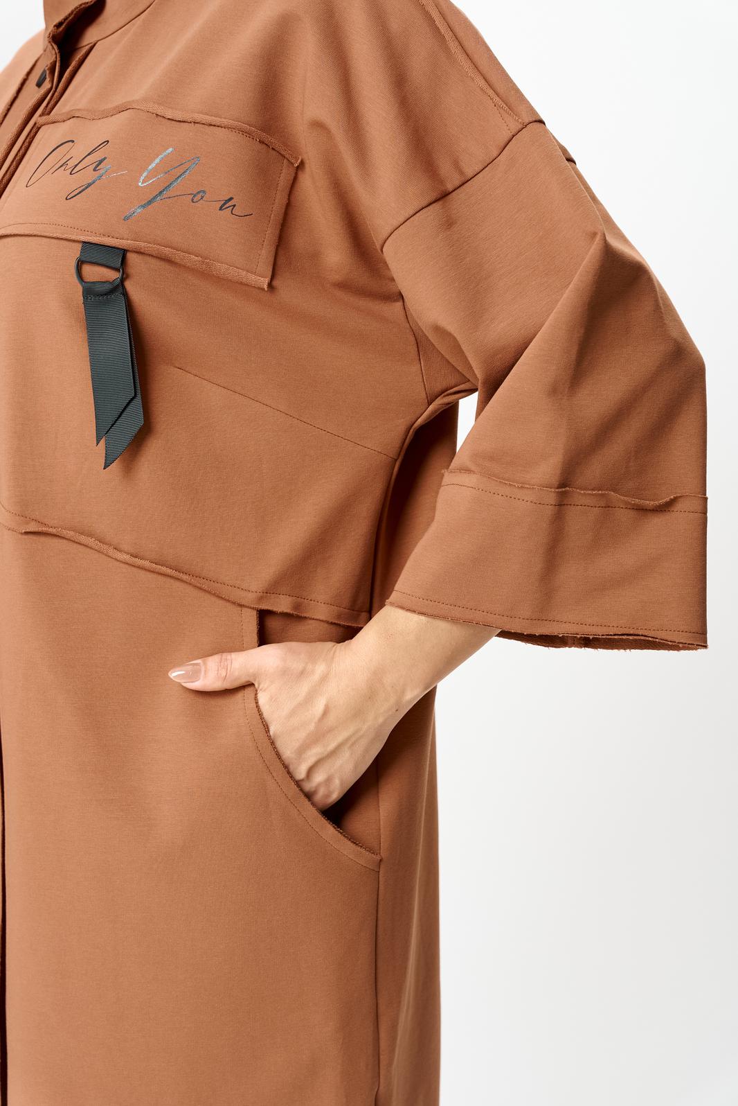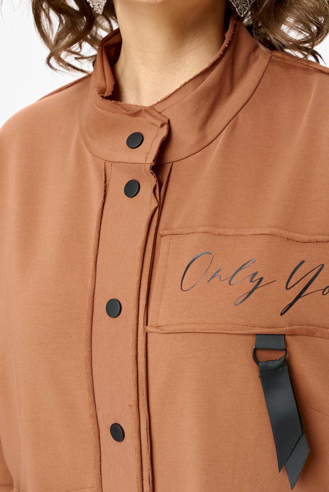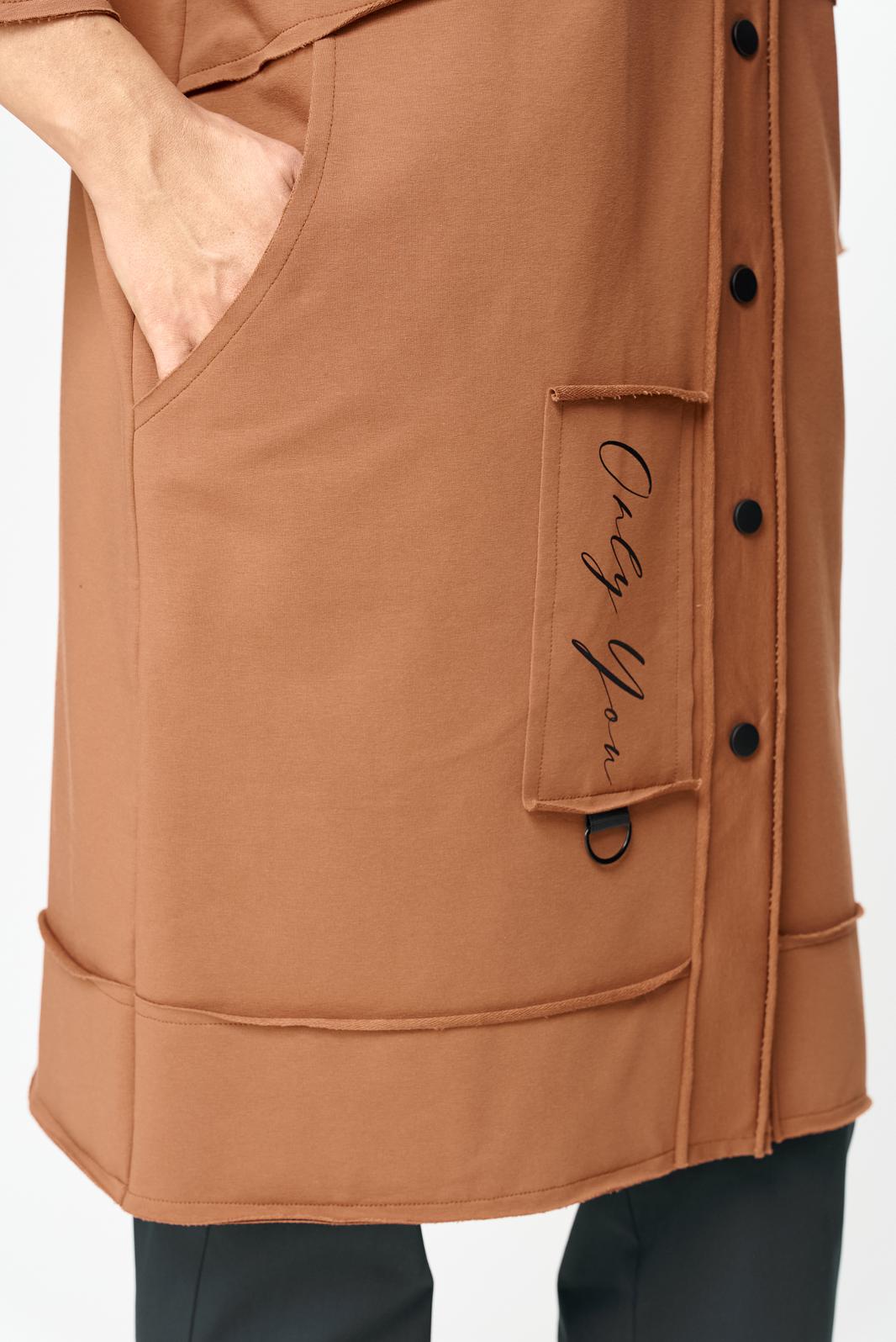 Кардиган женский прямого силуэта из трикотажной ткани (двунитка-футер). На полочке и спинке расположены декоративные, необработанные швы. В верхней и нижней части переда есть настрочные элементы с печатью и тесьмой. По переду изделия карманы. Спинка со средним швом и кокеткой. На кокетке расположен элемент с печатью и тесьмой. Рукав спущенный с манжетой. Вырез горловины оформлен стойкой. По переду изделия планка с кнопками.