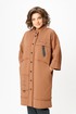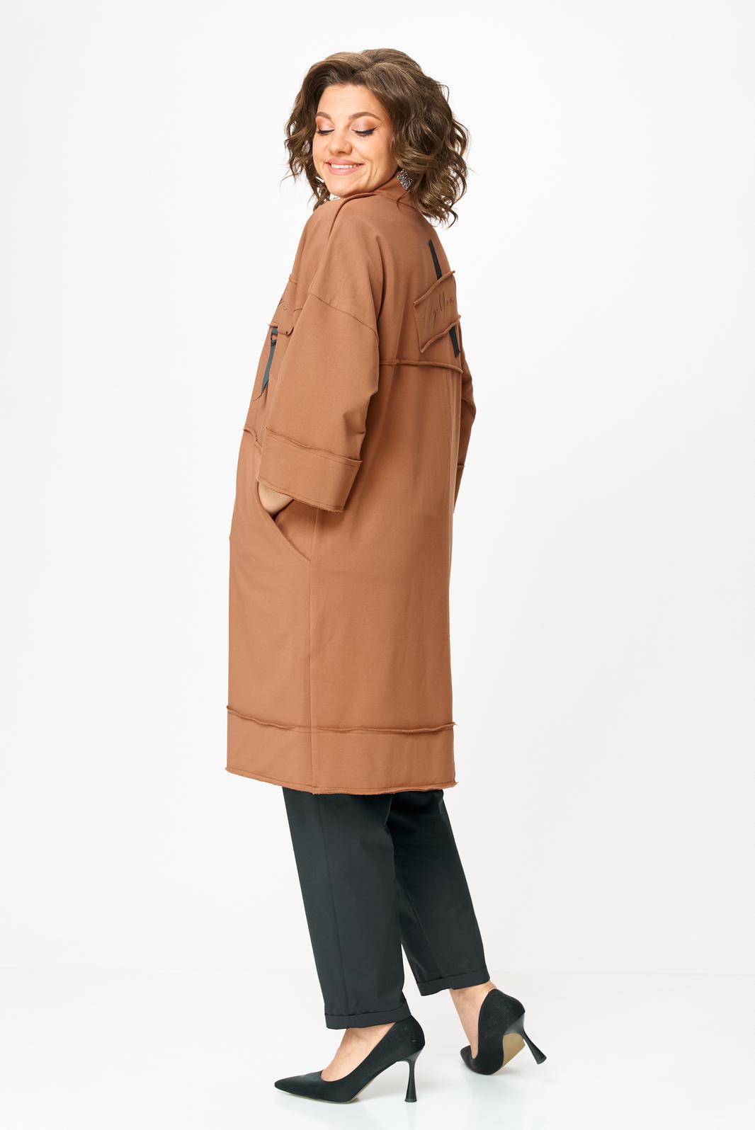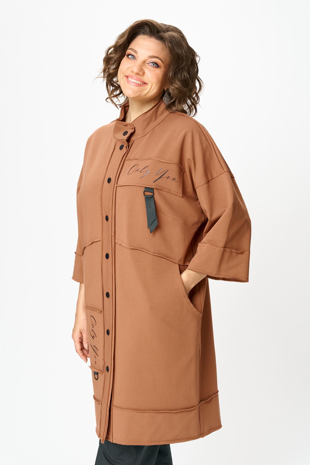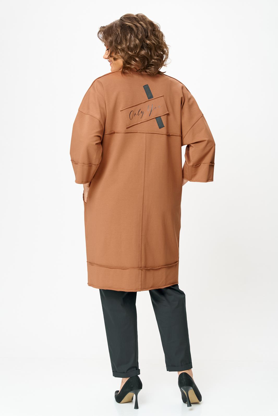 Кардиган женский прямого силуэта из трикотажной ткани (двунитка-футер). На полочке и спинке расположены декоративные, необработанные швы. В верхней и нижней части переда есть настрочные элементы с печатью и тесьмой. По переду изделия карманы. Спинка со средним швом и кокеткой. На кокетке расположен элемент с печатью и тесьмой. Рукав спущенный с манжетой. Вырез горловины оформлен стойкой. По переду изделия планка с кнопками.