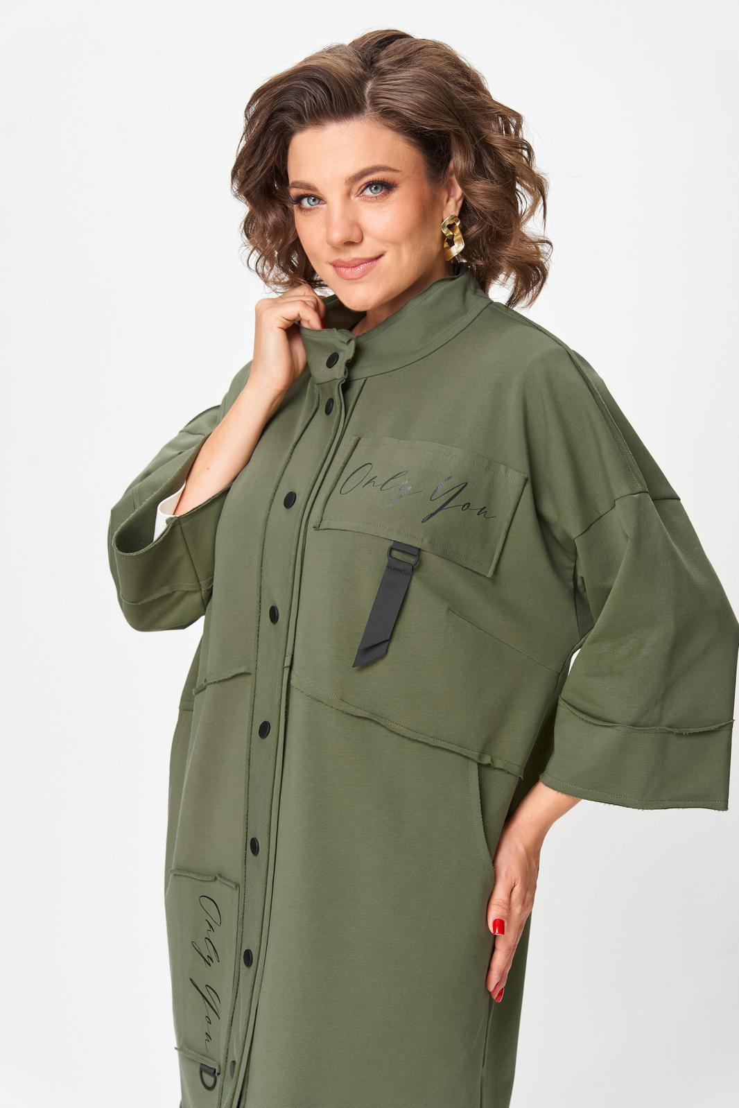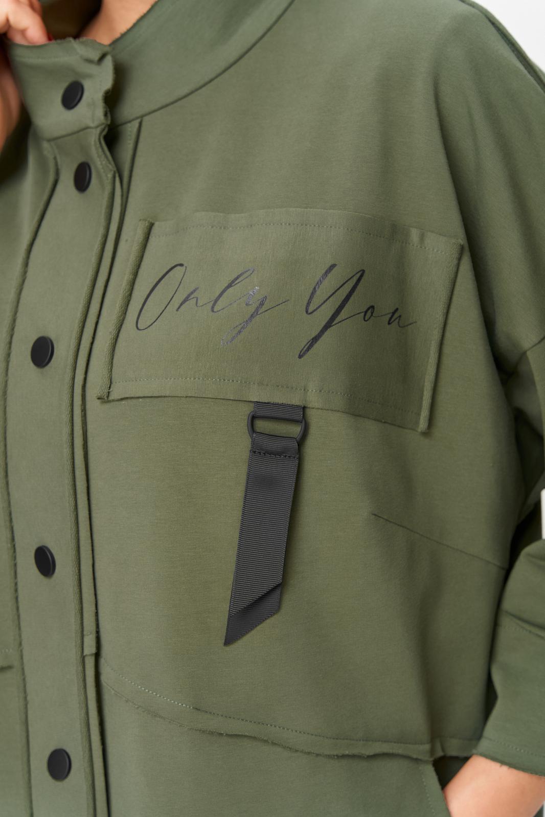 Кардиган женский прямого силуэта из трикотажной ткани (двунитка-футер). На полочке и спинке расположены декоративные, необработанные швы. В верхней и нижней части переда есть настрочные элементы с печатью и тесьмой. По переду изделия карманы. Спинка со средним швом и кокеткой. На кокетке расположен элемент с печатью и тесьмой. Рукав спущенный с манжетой. Вырез горловины оформлен стойкой. По переду изделия планка с кнопками.