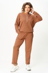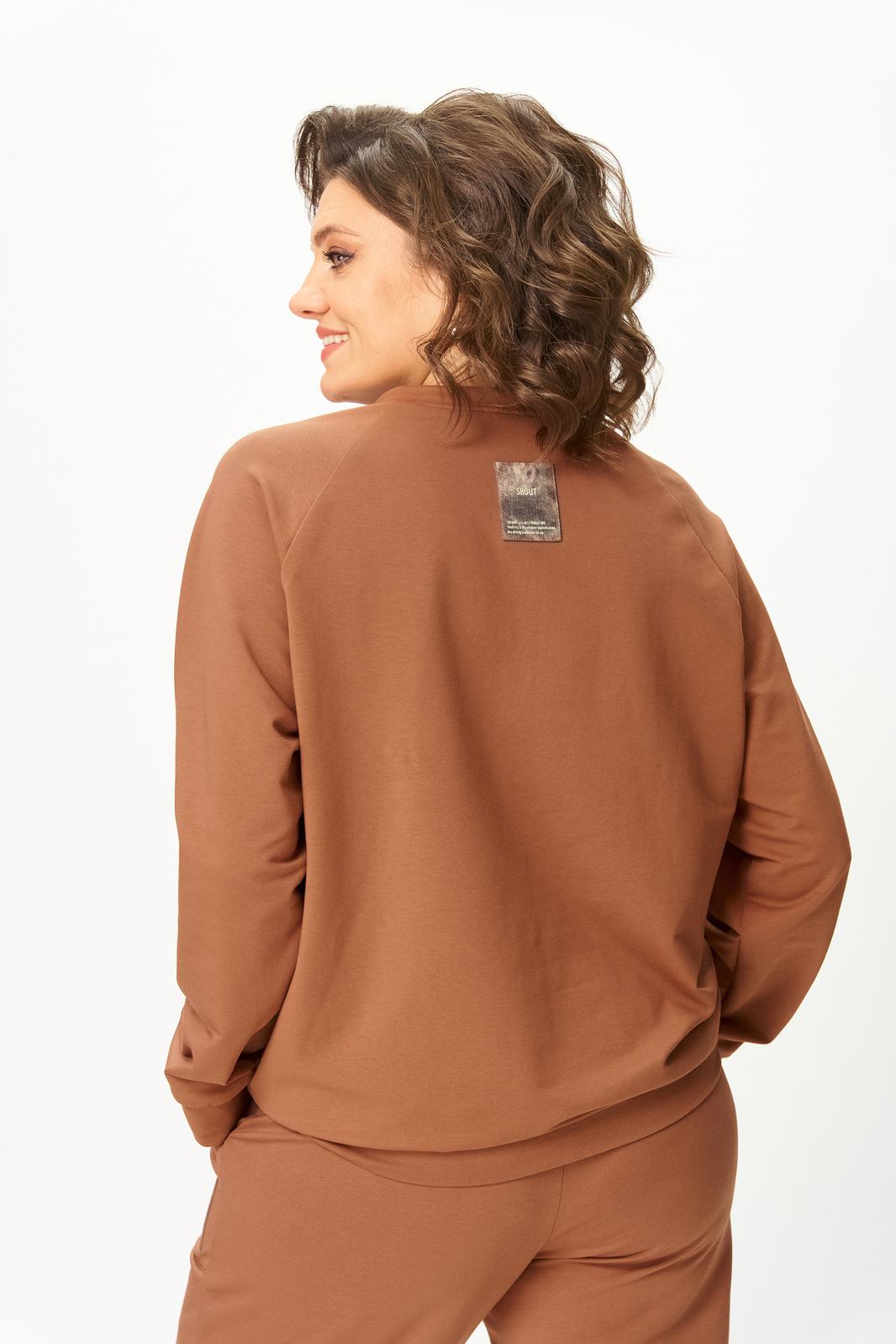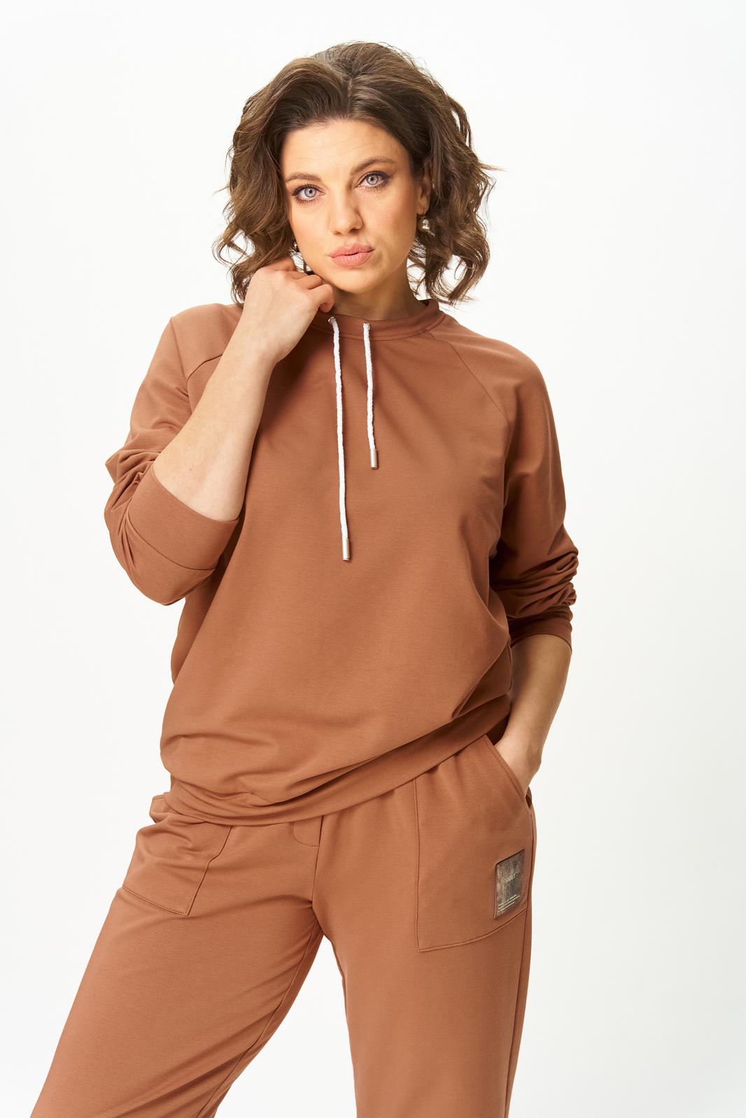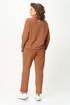 Джемпер женский из трикотажной хлопковой ткани (двунитка). Рукав реглан. Низ рукава обработан притачной манжетой. Низ изделия оформлен притачным поясом. На спинке настрочен декоративный элемент. Вырез горловины круглый, обработан бейкой со шнуром.