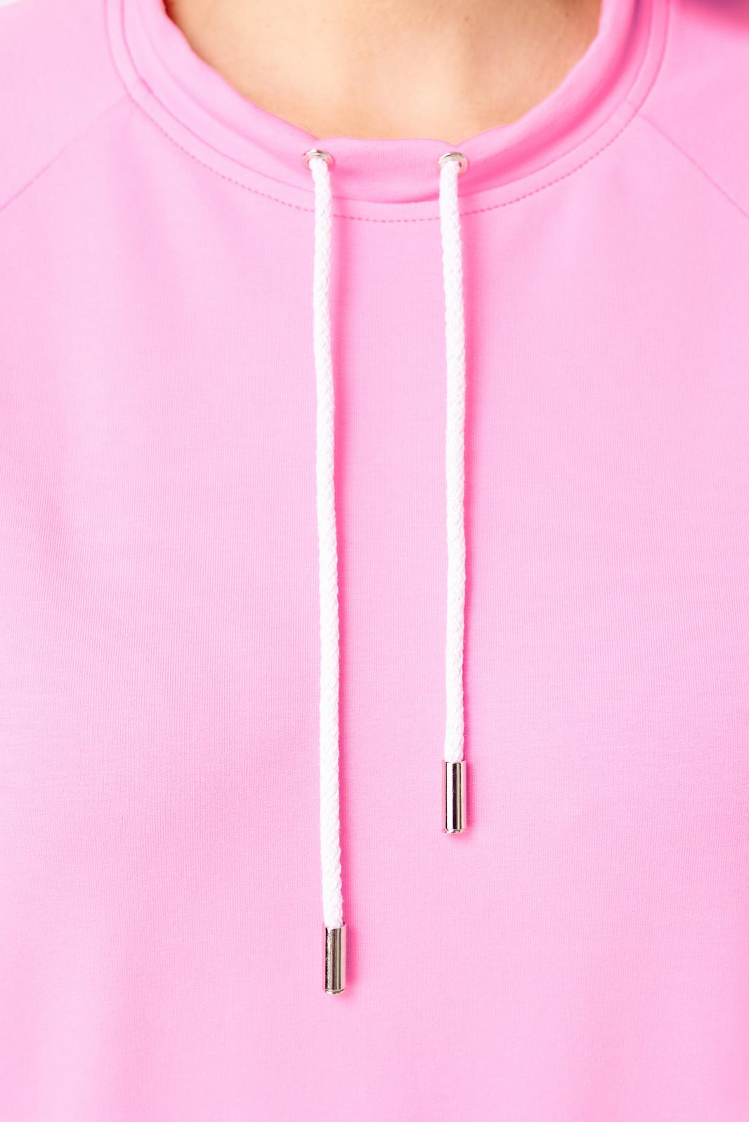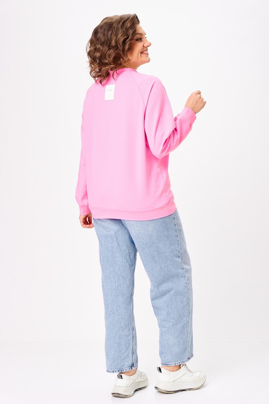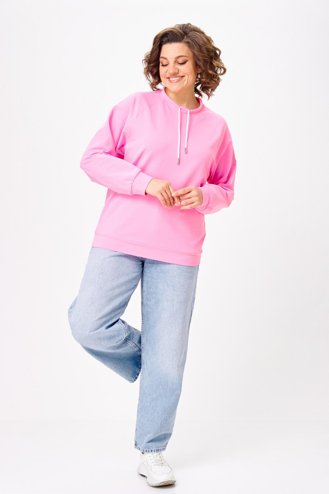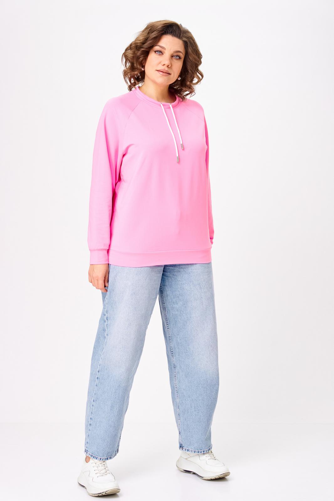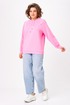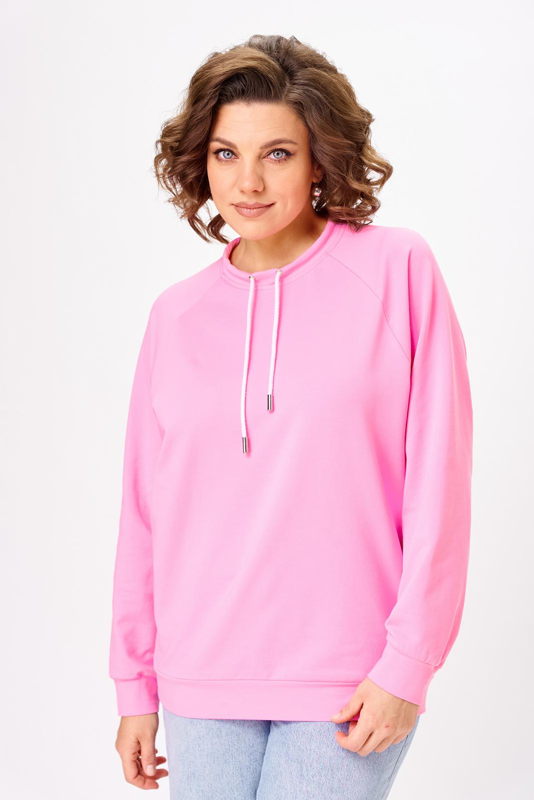 Джемпер женский из трикотажной хлопковой ткани (двунитка). Рукав реглан. Низ рукава обработан притачной манжетой. Низ изделия оформлен притачным поясом. На спинке настрочен декоративный элемент. Вырез горловины круглый, обработан бейкой со шнуром.