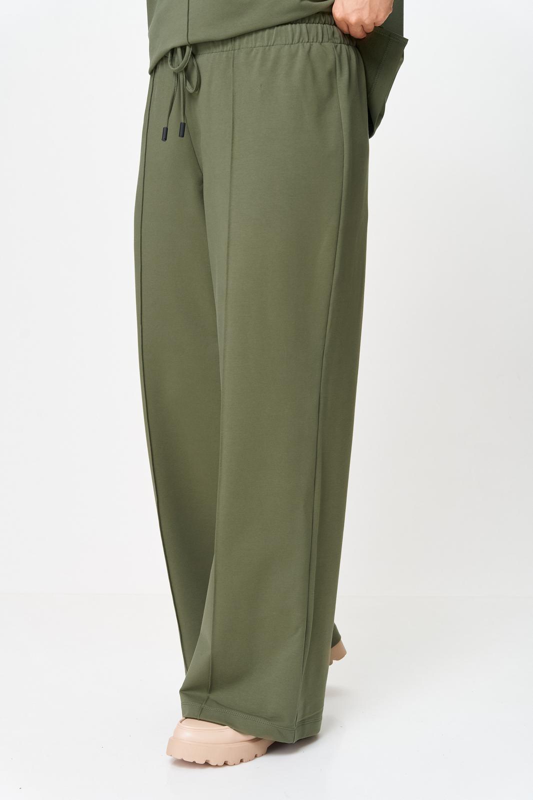 Брюки женские из трикотажной ткани. По центру переда брюк расположен декоративный защип. По кругу пояса вставлена резинка, втянут декоративный шнур.