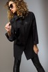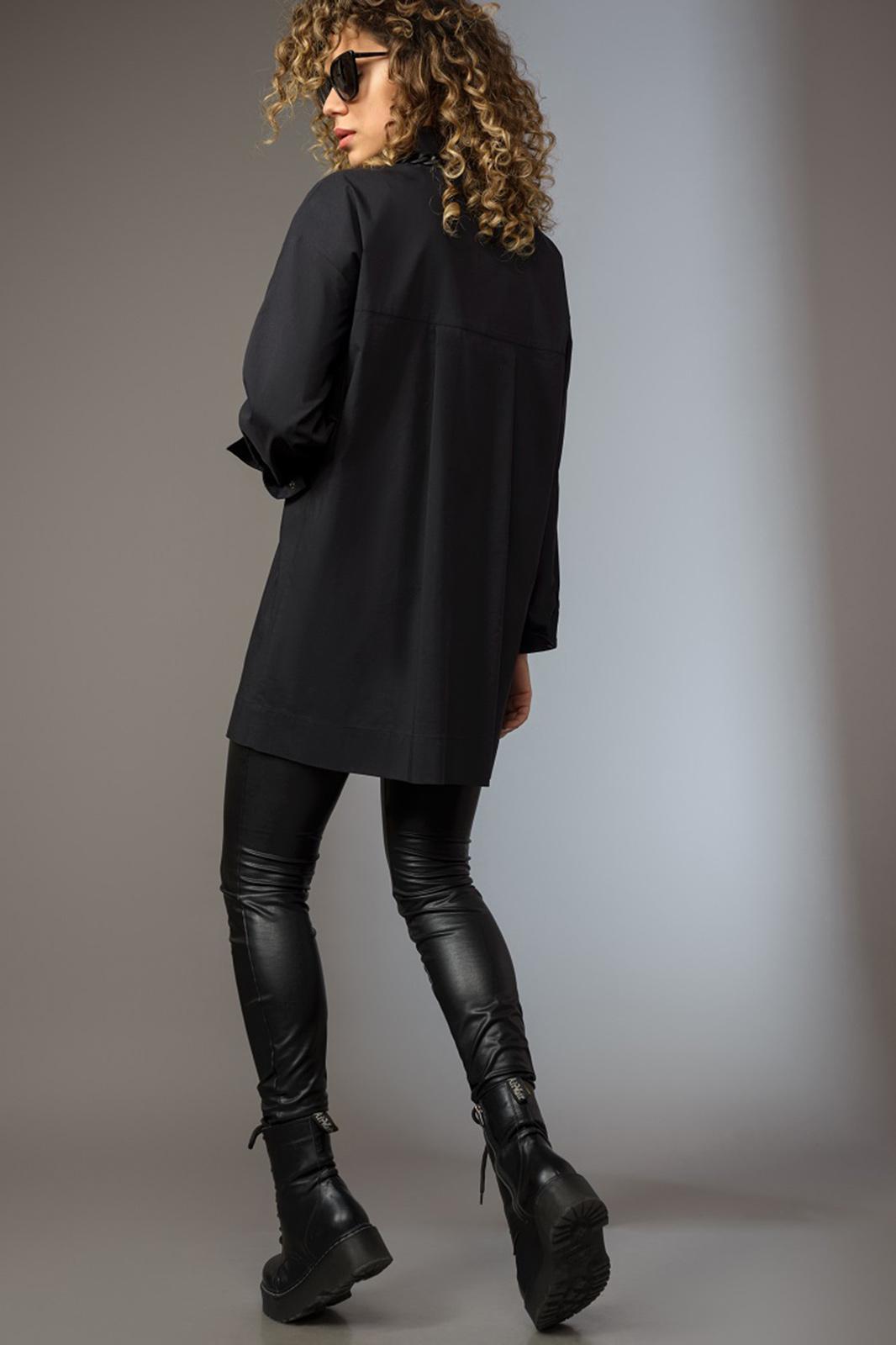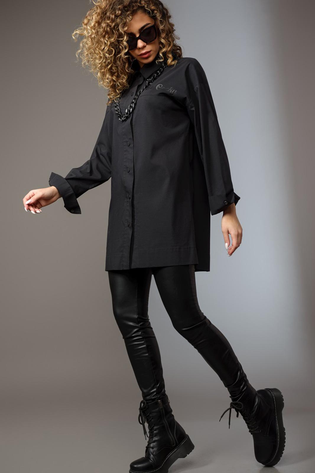 Рубашка женская свободного силуэта. Застежка центральная на кнопки. На одной из кокеток по переду декоративная печать. По спинке кокетка и складка. Низ рукавов оканчивается манжетом, застегивающимся на кнопку. Воротник со стойкой по спинке.