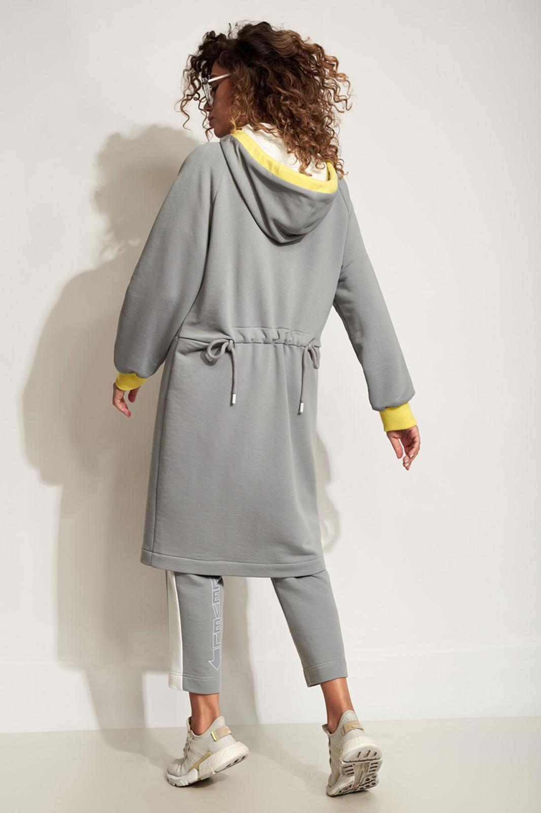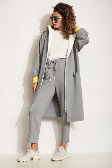 Комплект женский состоит из кардигана и брюк. Кардиган и брюки из приятного к телу турецкого хлопкового трикотажа. Кардиган с капюшоном, с карманами в рельефе. Спинка регулируется на кулису. Рукава и капюшон с контрастным трикотажным довязом. Брюки на резинке с кулисой на поясе, с лампасами контрастного цвета. На заднем полотнище брюк внизу декоративная печать. На кокетке сзади и в боковых швах удобные карманы. Этот комплект идеально подойдет для комфортного отдыха за городом и городских прогулок.