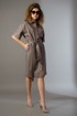 Платье женское на подкладке. Платье отрезное по талии. Застежка центральная на обтяжные пуговицы. Спущенное плечо. По низу рукава и низу изделия декоративная стеганая деталь из основной ткани. Воротник с отрезной стойкой по спинке. Пояс стеганый в шлевки на боковых швах. В боковых швах карманы. Длина изделия- 102 см, длина рукава с плечом– 43 см.