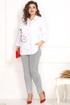 Комплект женский состоит из блузы и брюк. Блузка удлиненная, свободного кроя. Передняя часть блузы( полочка) свободного кроя без талевых выточек с накладным карманом. Застежка-планка с прорезными петлями на пуговицах. Спинка свободного кроя без талевых выточек. По центру спинки кокетка. Воротник рубашечного типа на стойке. Низ изделия с фигурными вырезами по боковому шву. Украшением изделия служит печать. Линия плеча спущенная, рукав притачной по низу рукава манжет с застежкой на пуговицу. Подойдет для женщин разной возрастной категории и разного телосложения. Можно носить как вместе, так и отдельно. Брюки заужены к низу, на широком поясе, по переду карманы, застёжка - молния и пуговицы. Длина брюк в р.50 - 93 см + пояс 5 см.Длина блузы по центру спинки в 50р-80см, длина рукава от воротника в 50р-60см.