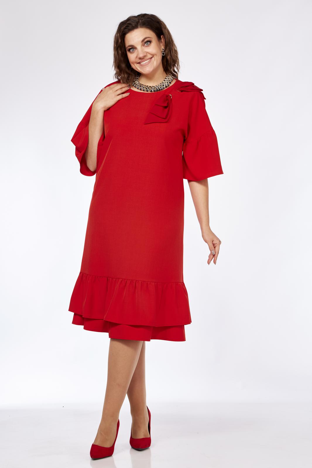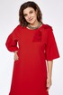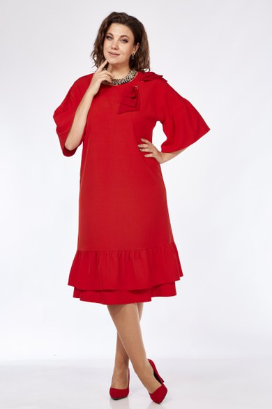 Платье свободного кроя. Линия плеча спущенная, без вытачек. Горловина полукруглая, рукав 3/4. По нижней линии рукава волан, низ изделия заканчивается двумя воланами. Длина изделия ниже колена. Визитной карточкой данной модели является красивый нарядный бант, который продет через два люверса. Бант съемный, платье просто с люверсами так же хорошо смотрится.