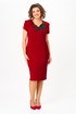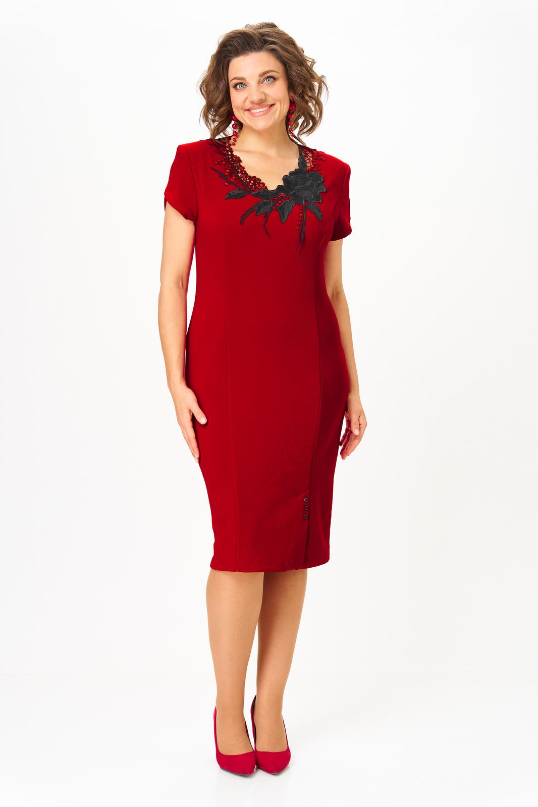 Платье облегающего силуэта. Украшением изделия служит вставка-аппликация, вышитая на сетке. Аппликация расположена спереди и по спинке платья. По передней части рельефы, внизу полочки слева вырез. Рукава короткие фигурные. По спинке шлица. Элементы декора: аппликация по горловине и сеточка по вырезу спинки. Особенности ткани: тянется хорошо, средней плотности.