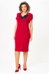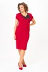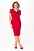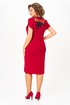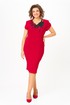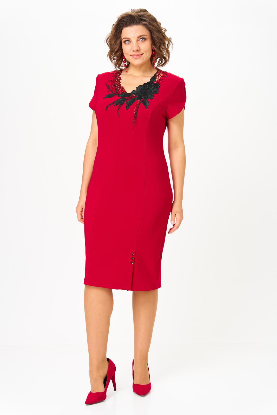 Платье облегающего силуэта. Украшением изделия служит вставка-аппликация, вышитая на сетке. Аппликация расположена спереди и по спинке платья. По передней части рельефы, внизу полочки слева вырез. Рукава короткие фигурные.