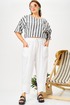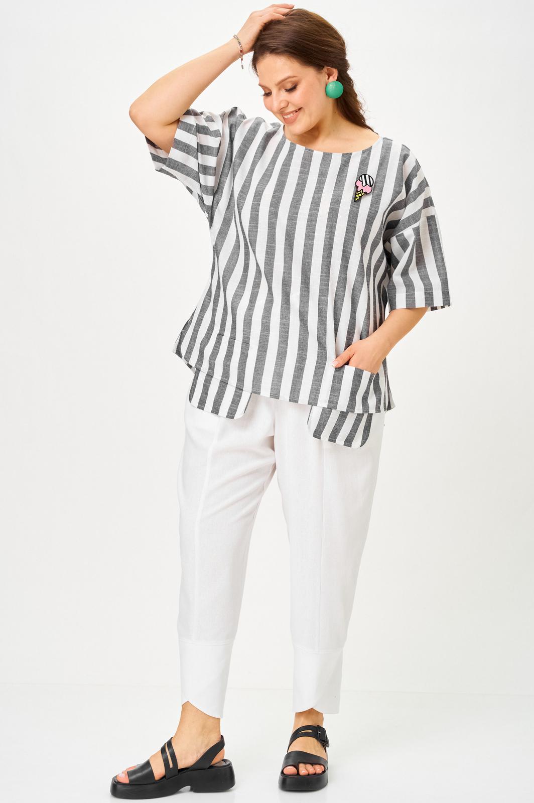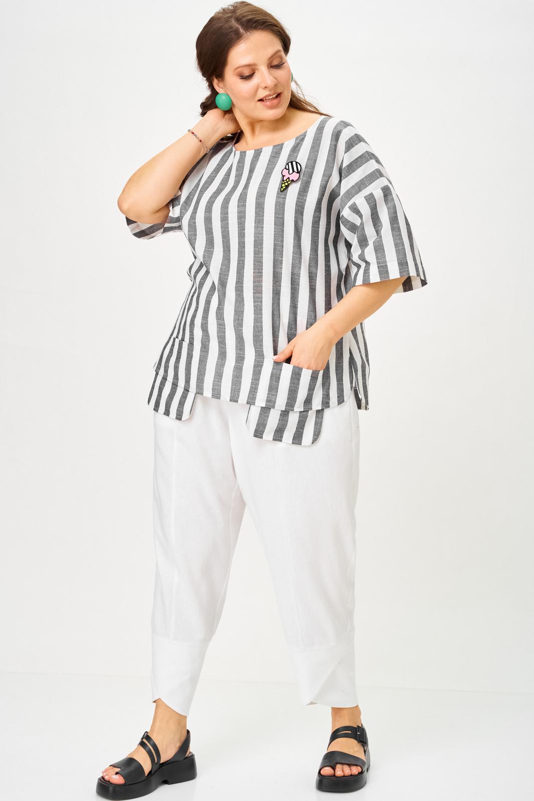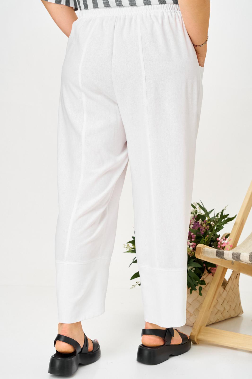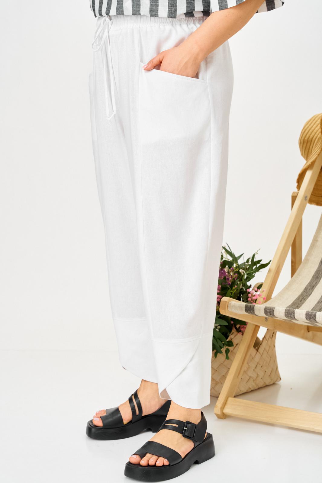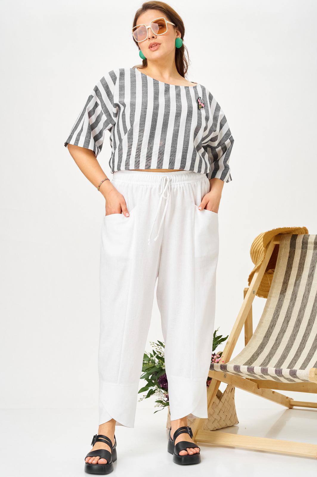 Брючный летний костюм больших размеров из льна. Будет идеальным летним вариантом для отдыха и просто на каждый день. Блузон свободного кроя и свабодные в посадке укороченный брюки, оверсайз комплект на лето для женщин плюс сайз и для полных девушек. Дышащая ткань из смесового лен идеально подойдет для жаркого лета. Брюки свободные в посадке с круговой резинкой по поясу, шнурок в поясе позволит дополнительно скорректировать посадку по высоте. Функциональные карманы. Низ брюк на фигурной обтачке придает интересность и легкость, ножку делает более утонченной.